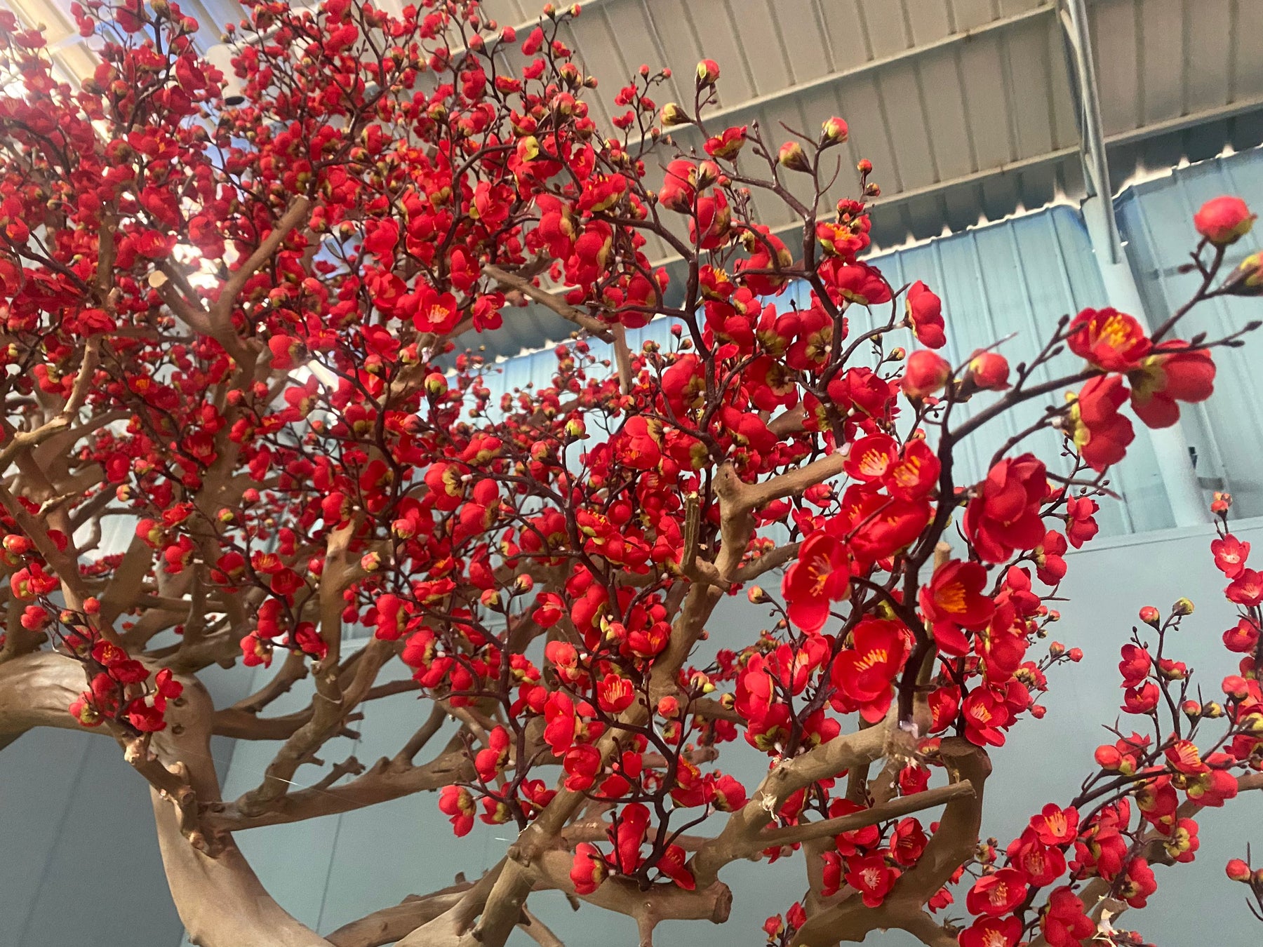 Bonsai artificial H330cm Prun cu trunchi natural din lemn cu flori rosii