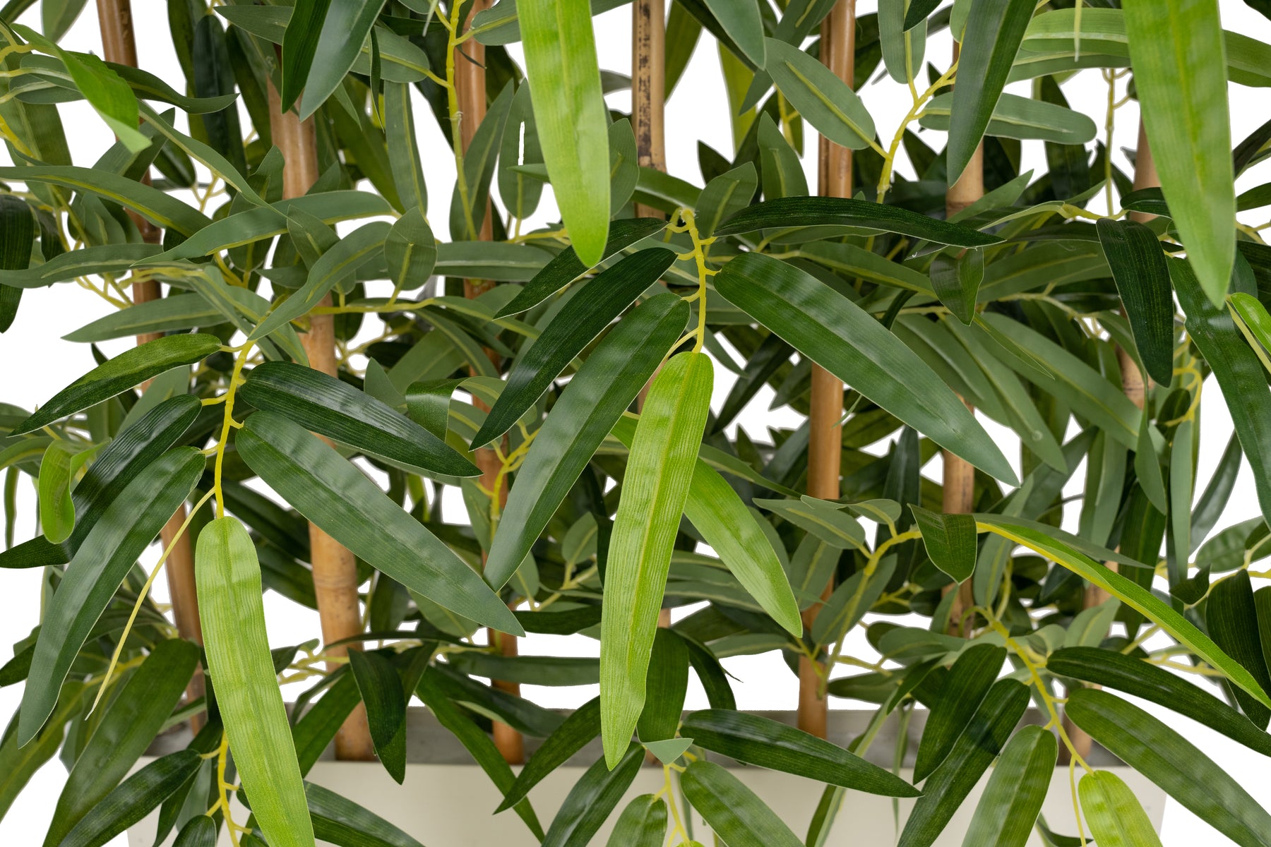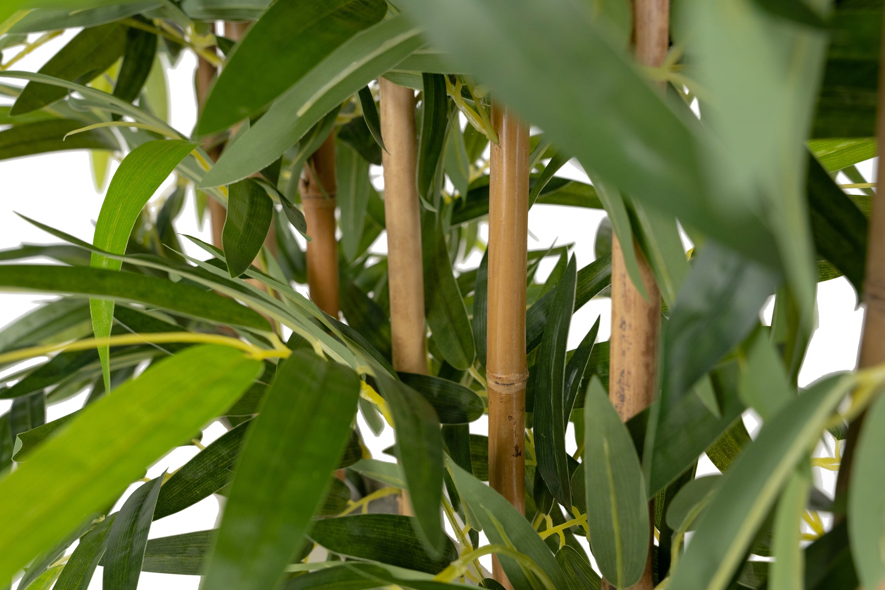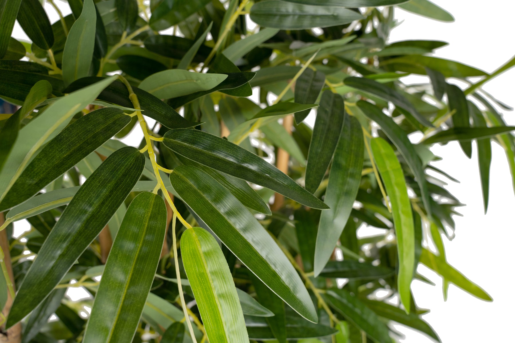 frunzele artificiale sunt fixate pe sarma metalica flexibila acoperita cu multistraturi de PP, realizate din 33 nanostraturi de PP, cu aspect natural,LPDE (polietilena de joasa densitate),trunchi natural din bambus