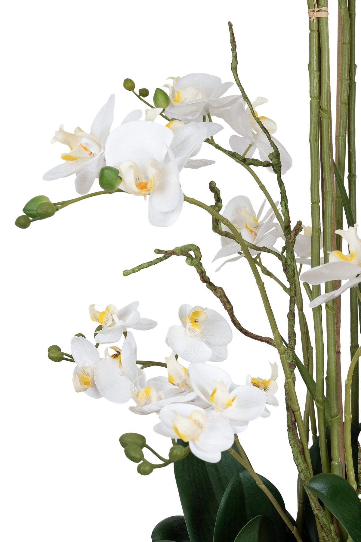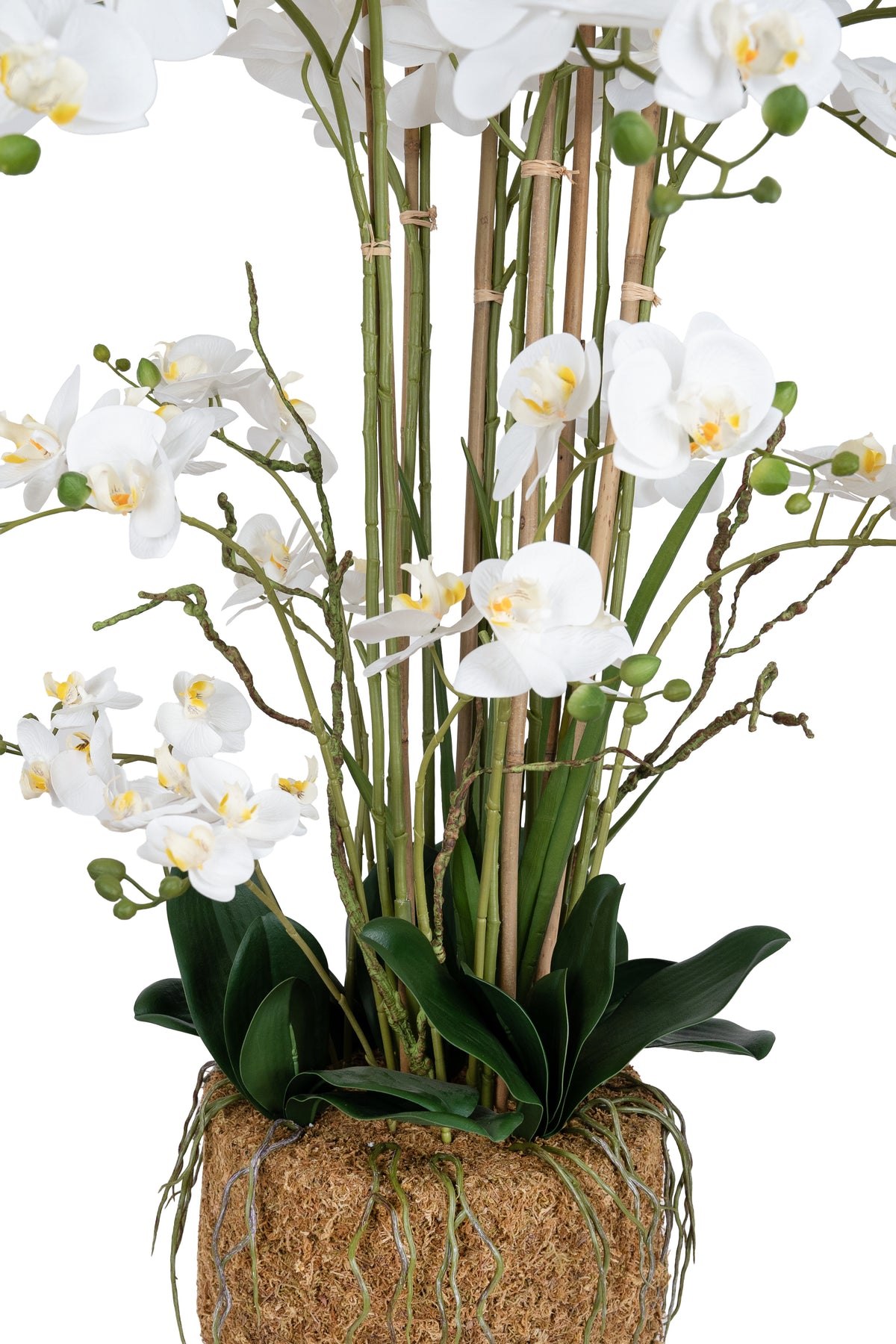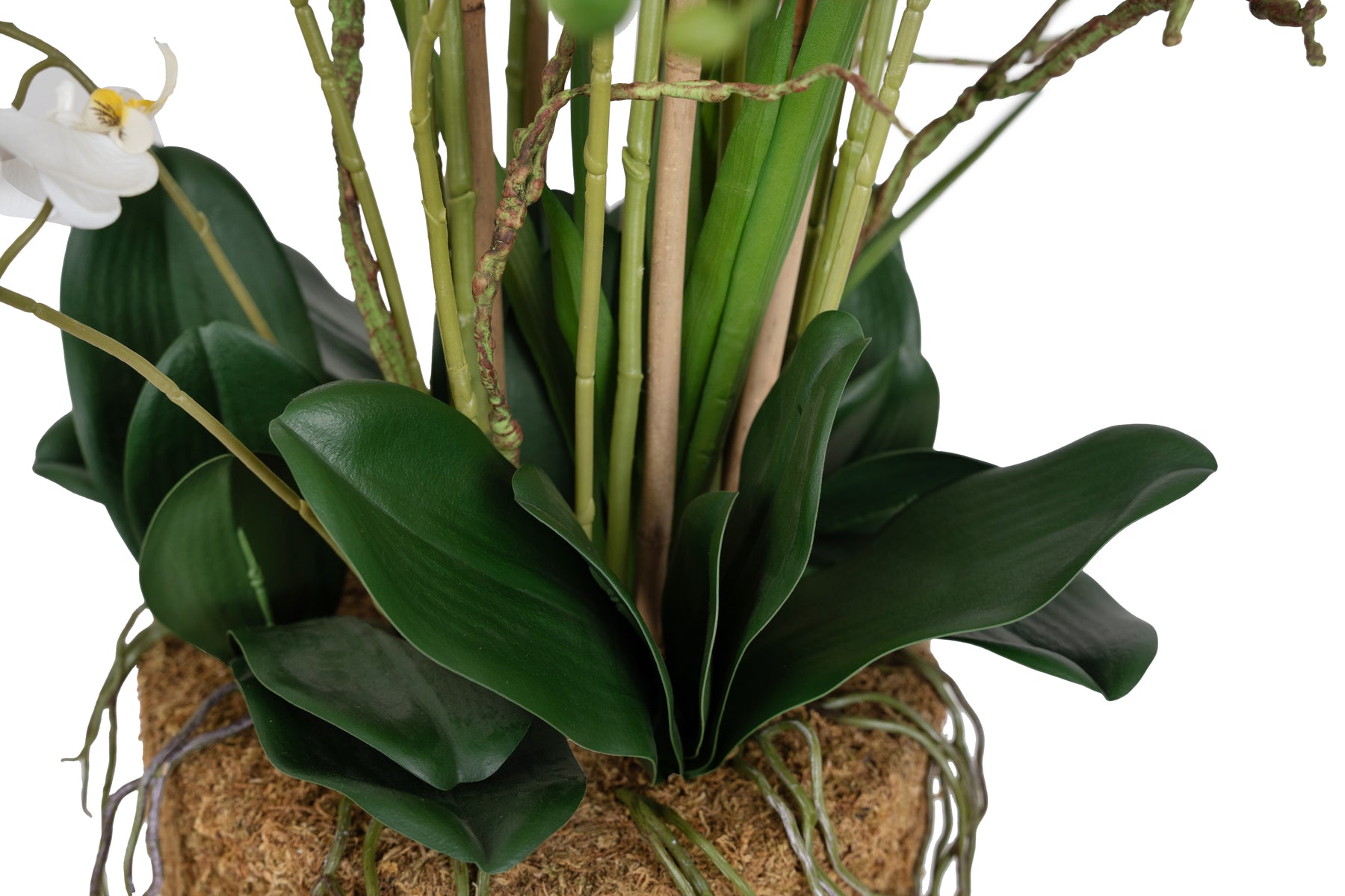 baza orhideei este realizata din polistiren negru acoperit cu muschi natural,frunzele artificiale sunt fixate pe sarma metalica flexibila acoperita cu multistraturi de PP, realizate din 33 nanostraturi de PP, cu aspect natural,la atingere florile sunt ca si florile naturale de orhidee, avand o senzatie identica cu orhideele naturale,radacinile aeriene sunt realizate din PEVA,suportii de sustinere a tulpinilor sunt bete de bambus naturale