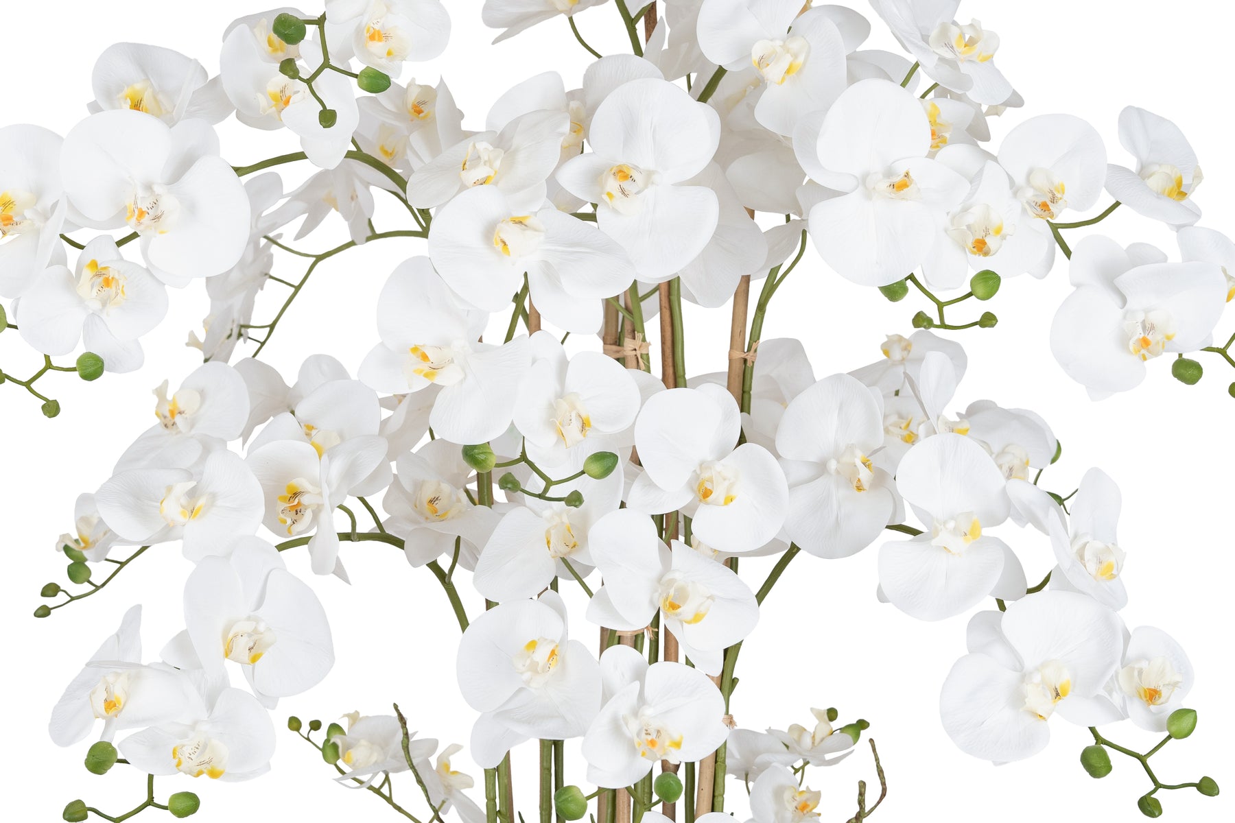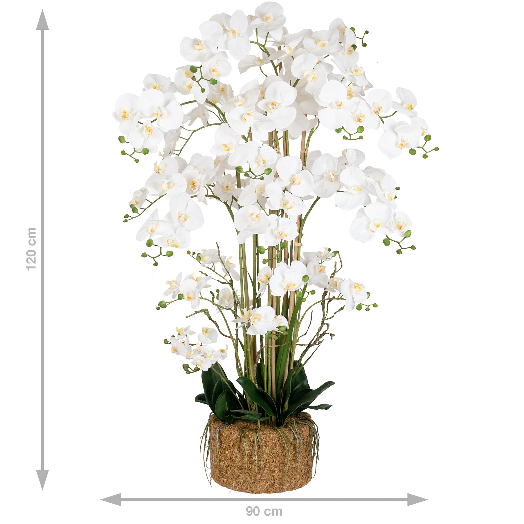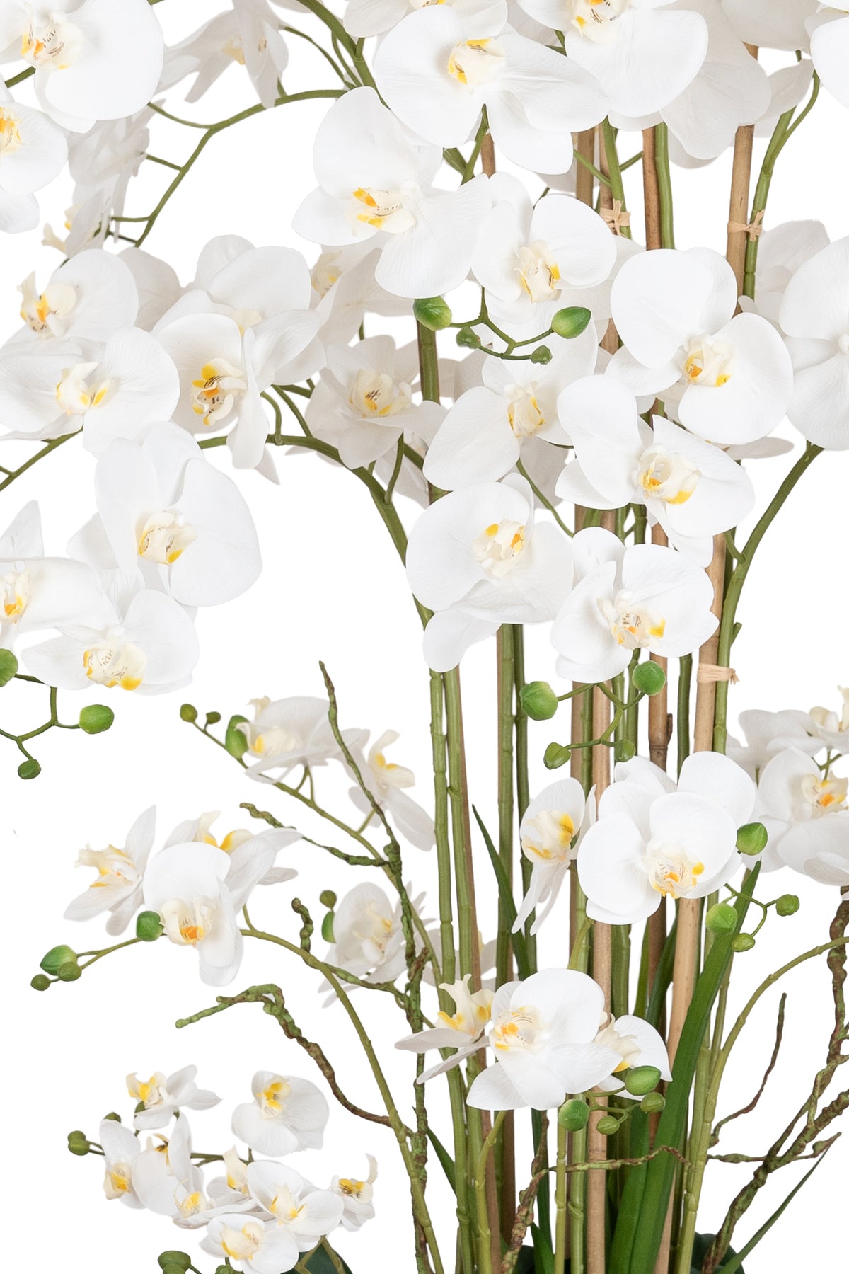 baza orhideei este realizata din polistiren negru acoperit cu muschi natural,frunzele artificiale sunt fixate pe sarma metalica flexibila acoperita cu multistraturi de PP, realizate din 33 nanostraturi de PP, cu aspect natural,la atingere florile sunt ca si florile naturale de orhidee, avand o senzatie identica cu orhideele naturale,radacinile aeriene sunt realizate din PEVA,suportii de sustinere a tulpinilor sunt bete de bambus naturale