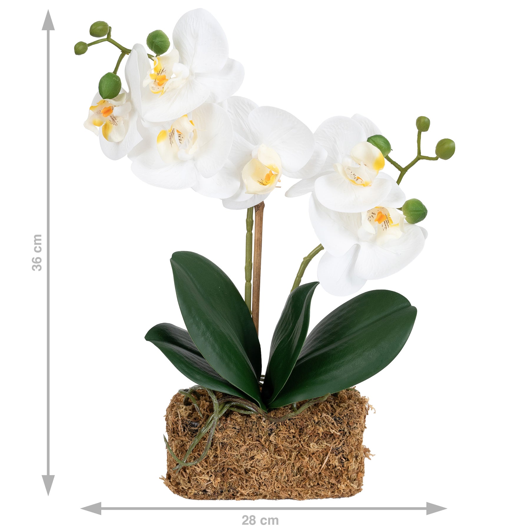baza orhideei este realizata din polistiren negru acoperit cu muschi natural,frunzele artificiale sunt fixate pe sarma metalica flexibila acoperita cu multistraturi de PP, realizate din 33 nanostraturi de PP, cu aspect natural,la atingere florile sunt ca si florile naturale de orhidee, avand o senzatie identica cu orhideele naturale,radacinile aeriene sunt realizate din PEVA,suportii de sustinere a tulpinilor sunt bete de bambus naturale