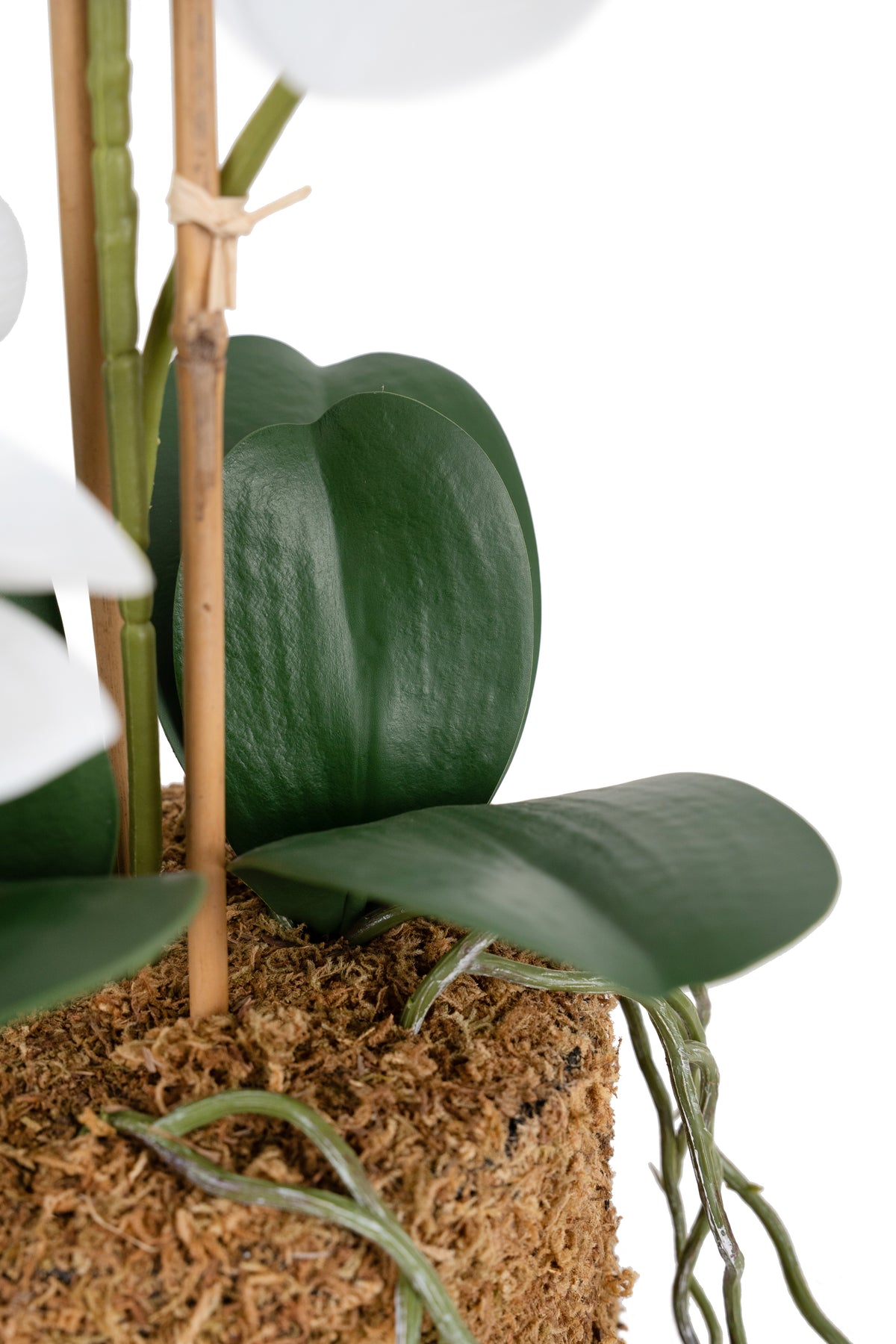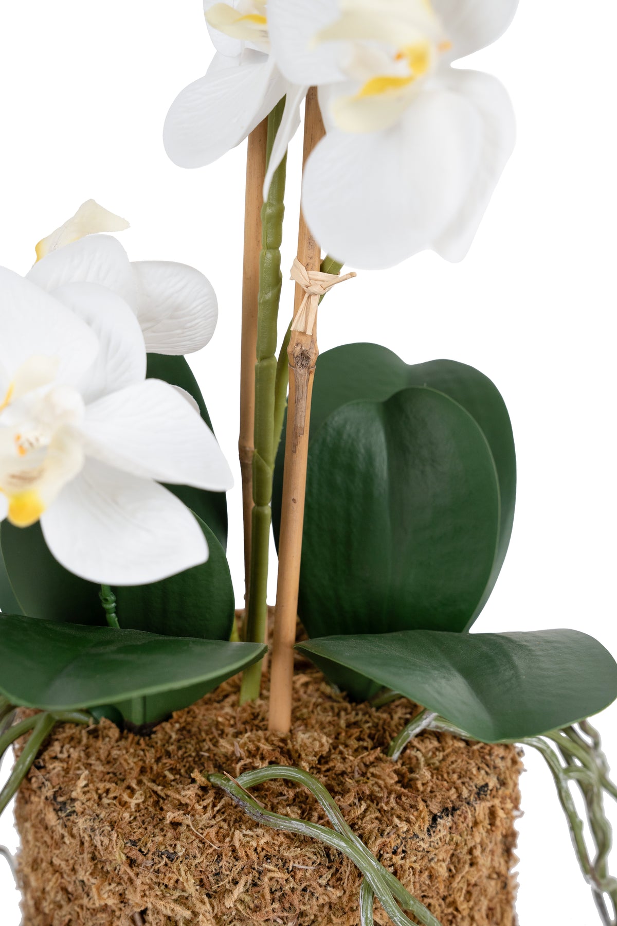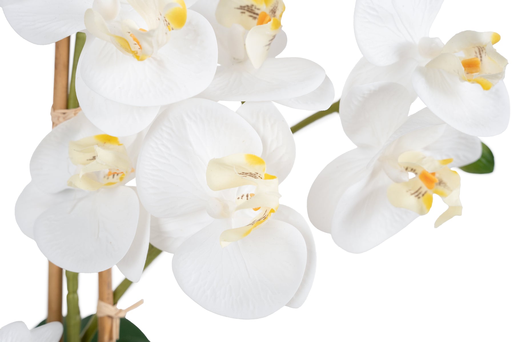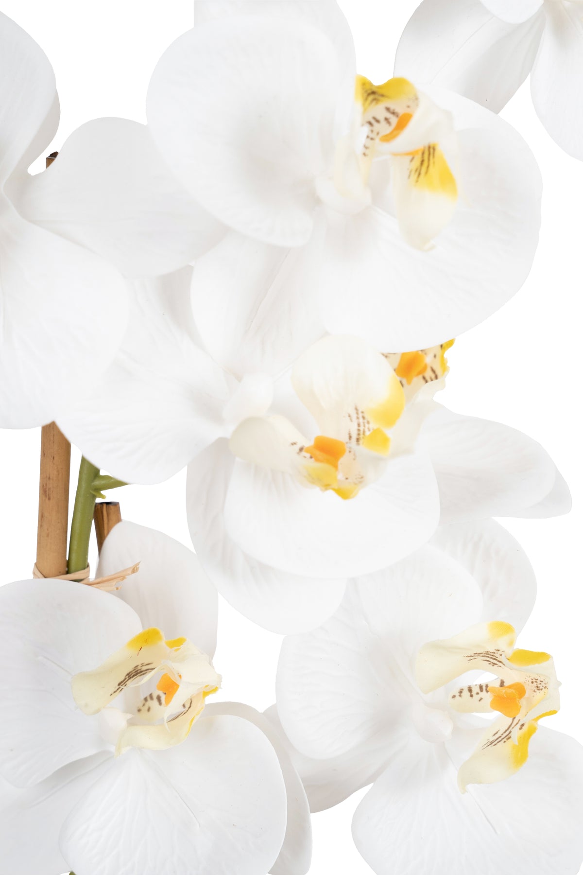 Orhidee artificiala alba cu aspect natural H61 cm cu 3 tulpini si 20 de flori cu 3 bete de bambus