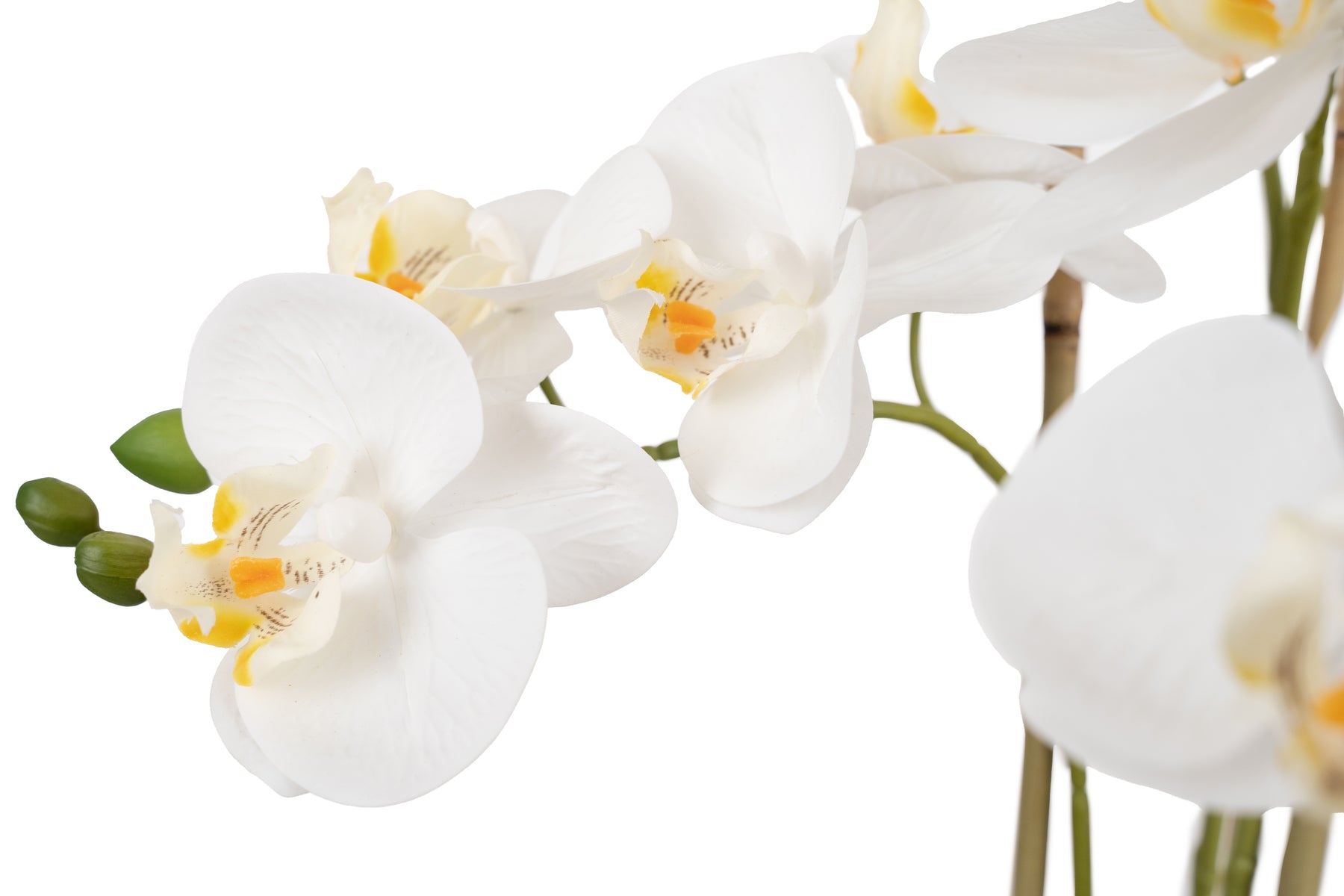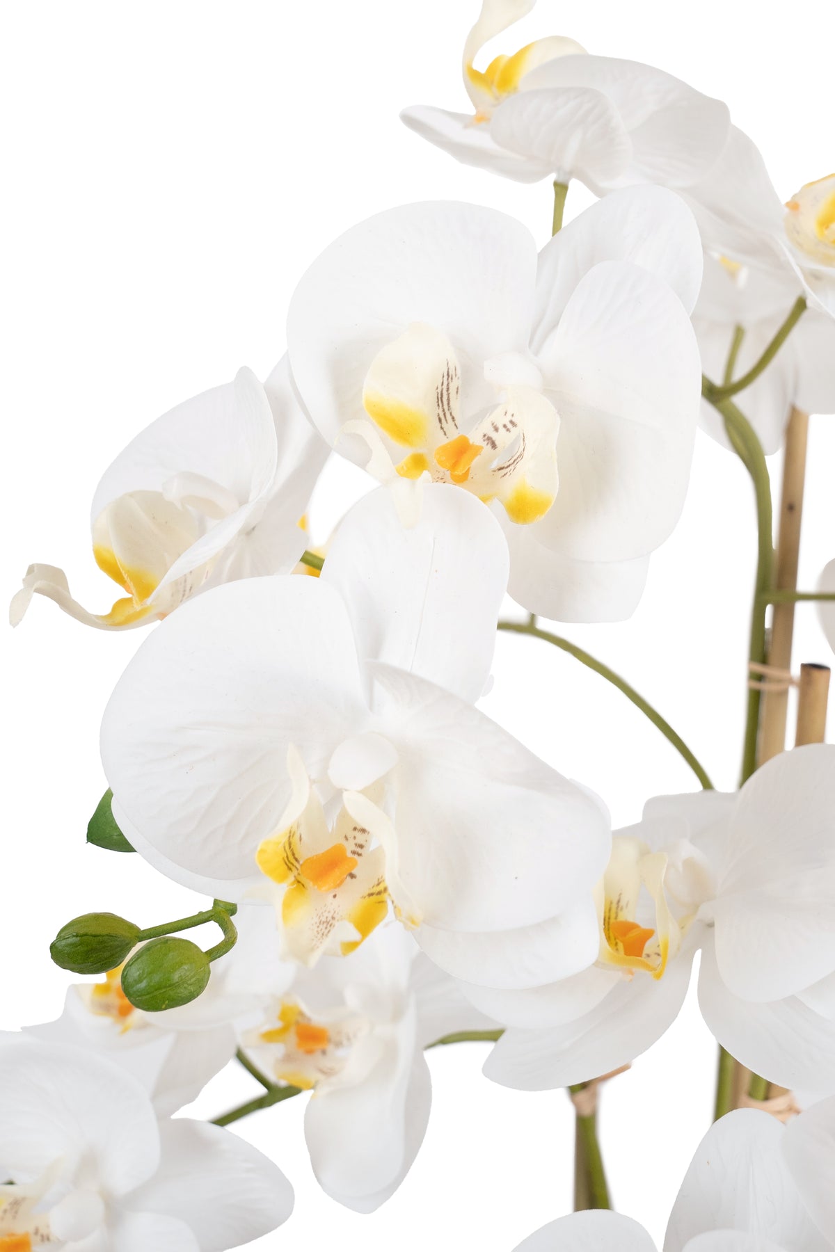Orhidee artificiala alba cu aspect natural H61 cm cu 3 tulpini si 20 de flori cu 3 bete de bambus