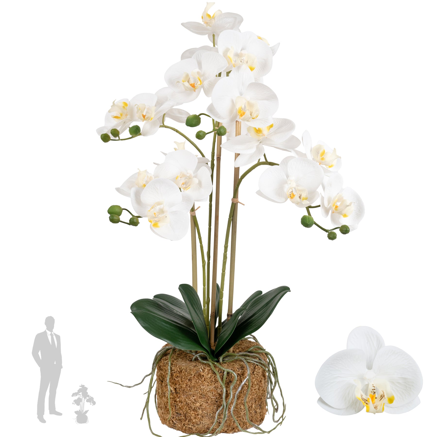 baza orhideei este realizata din polistiren negru acoperit cu muschi natural,frunzele artificiale sunt fixate pe sarma metalica flexibila acoperita cu multistraturi de PP, realizate din 33 nanostraturi de PP, cu aspect natural,la atingere florile sunt ca si florile naturale de orhidee, avand o senzatie identica cu orhideele naturale,radacinile aeriene sunt realizate din PEVA,suportii de sustinere a tulpinilor sunt bete de bambus naturale