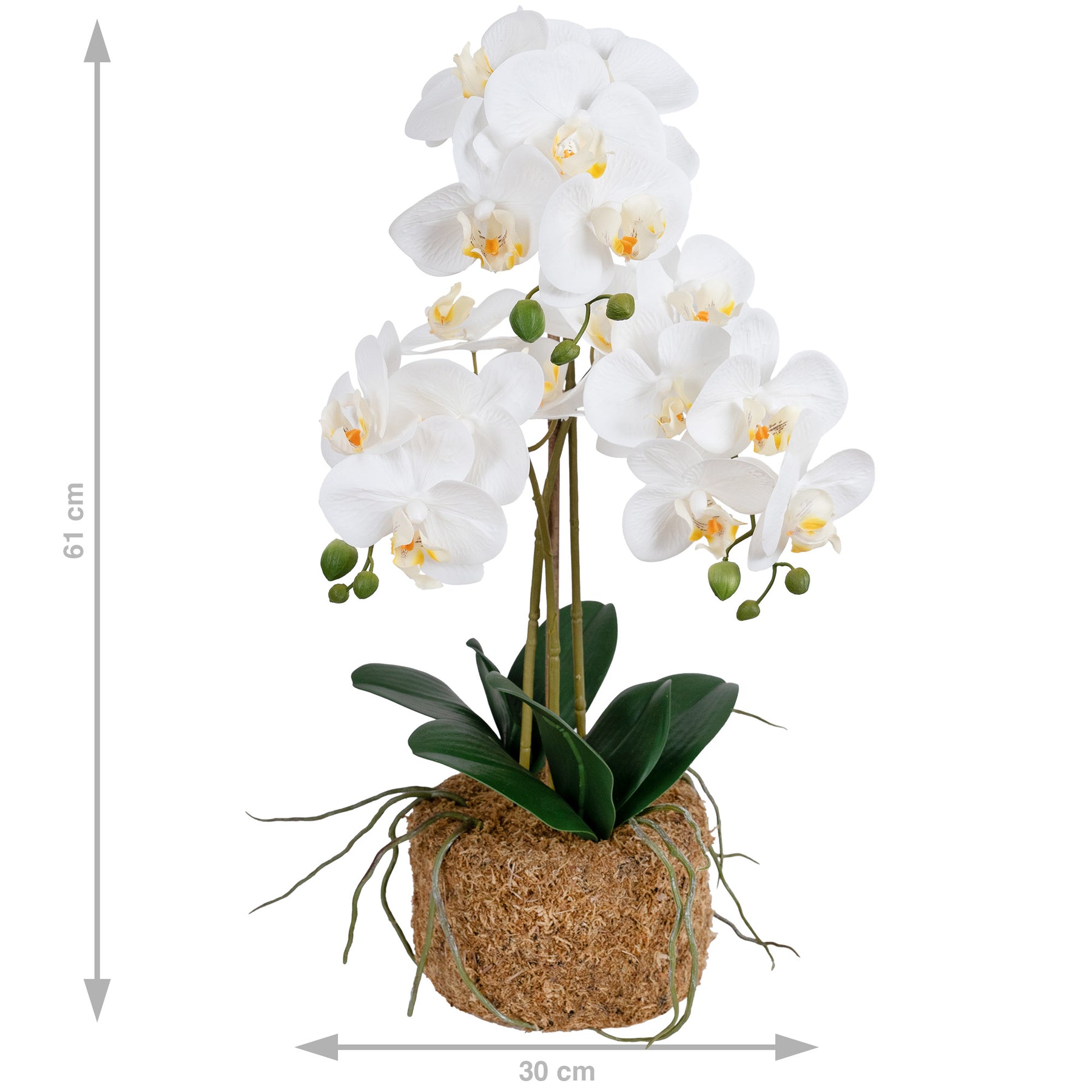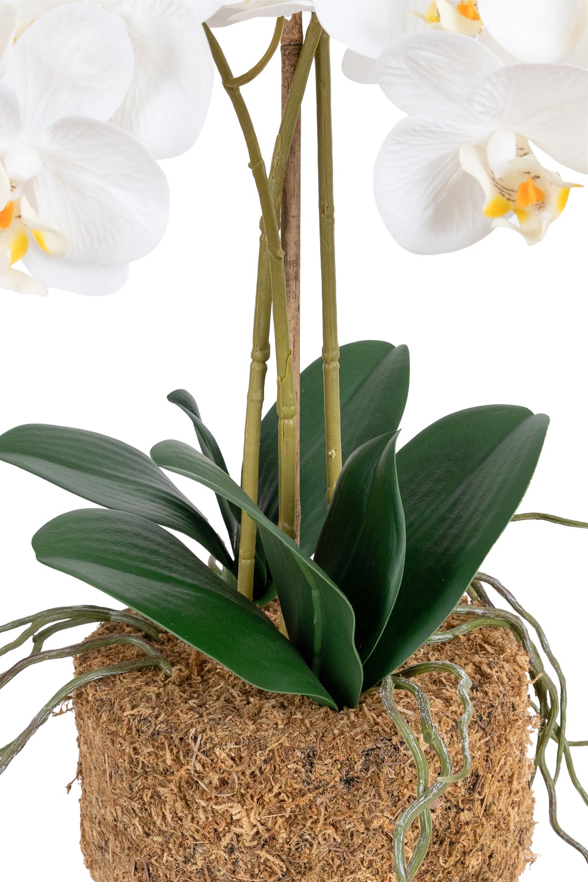 Orhidee artificiala alba cu aspect natural H61 cm cu 3 tulpini si 20 de flori cu 3 bete de bambus