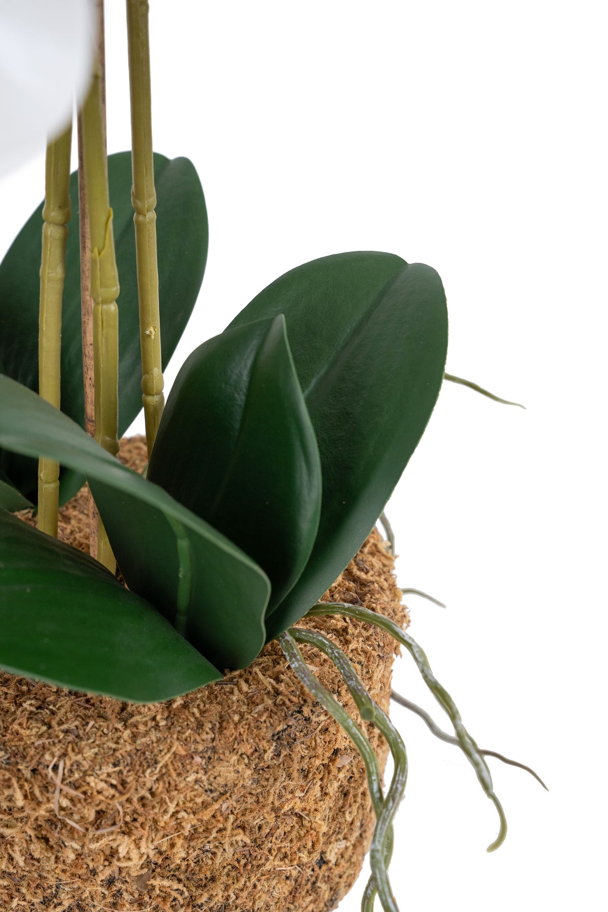 baza orhideei este realizata din polistiren negru acoperit cu muschi natural,frunzele artificiale sunt fixate pe sarma metalica flexibila acoperita cu multistraturi de PP, realizate din 33 nanostraturi de PP, cu aspect natural,la atingere florile sunt ca si florile naturale de orhidee, avand o senzatie identica cu orhideele naturale,radacinile aeriene sunt realizate din PEVA,suportii de sustinere a tulpinilor sunt bete de bambus naturale