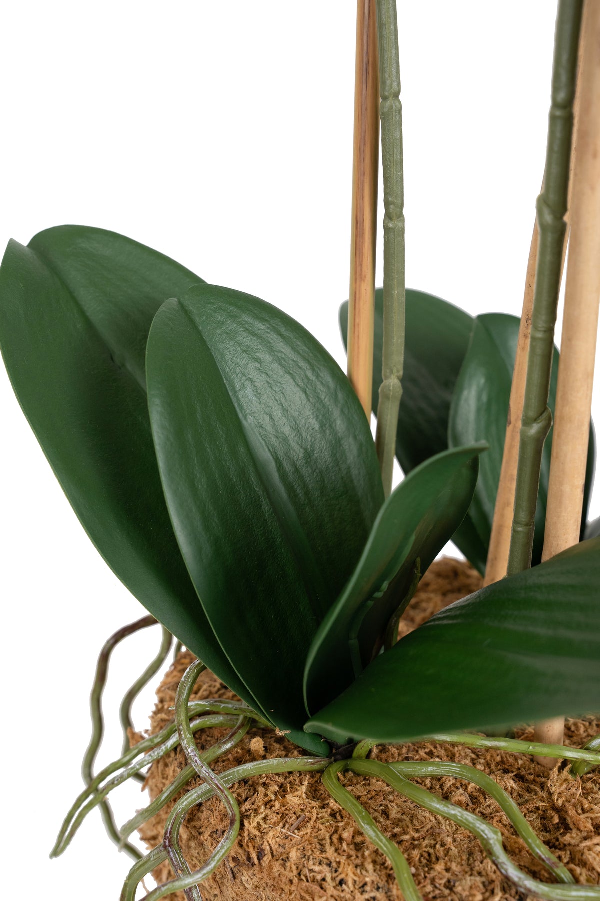 baza orhideei este realizata din polistiren negru acoperit cu muschi natural,frunzele artificiale sunt fixate pe sarma metalica flexibila acoperita cu multistraturi de PP, realizate din 33 nanostraturi de PP, cu aspect natural,la atingere florile sunt ca si florile naturale de orhidee, avand o senzatie identica cu orhideele naturale,radacinile aeriene sunt realizate din PEVA,suportii de sustinere a tulpinilor sunt bete de bambus naturale