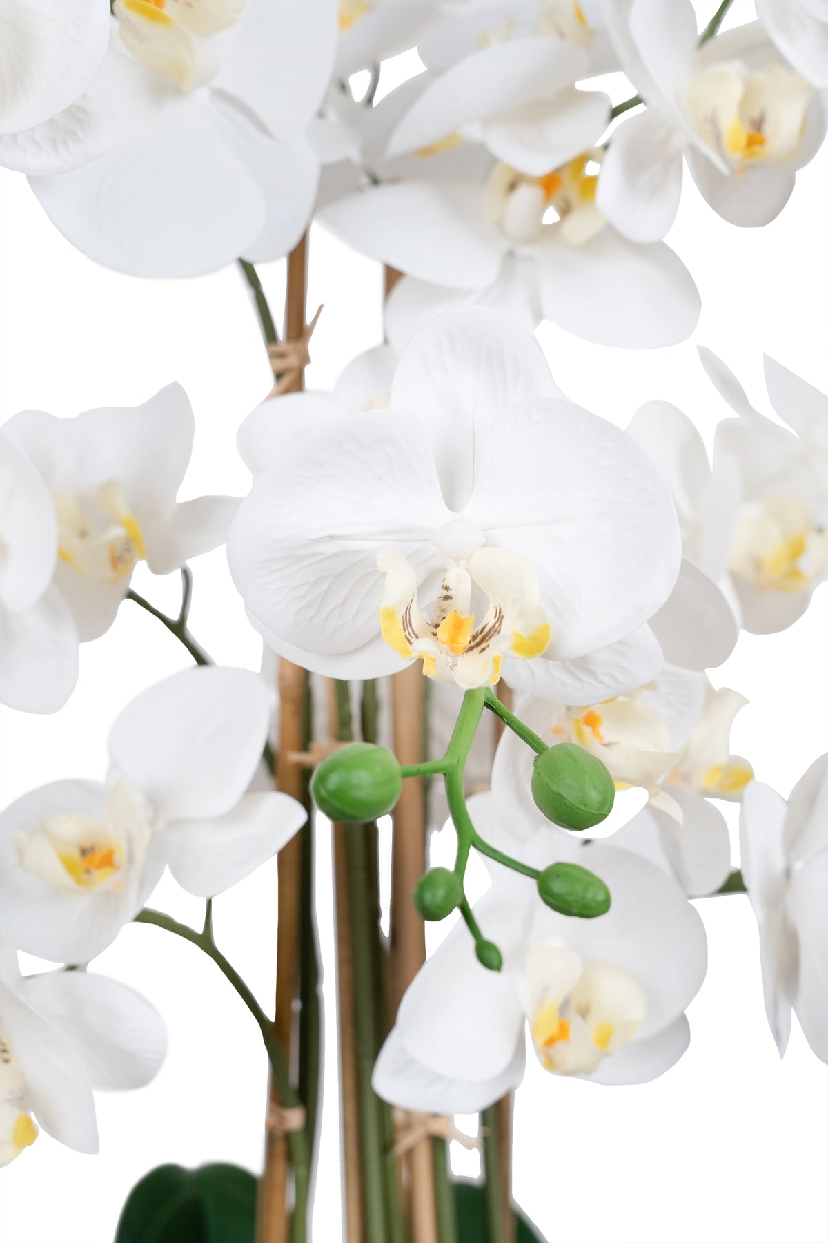 baza orhideei este realizata din polistiren negru acoperit cu muschi natural,frunzele artificiale sunt fixate pe sarma metalica flexibila acoperita cu multistraturi de PP, realizate din 33 nanostraturi de PP, cu aspect natural,la atingere florile sunt ca si florile naturale de orhidee, avand o senzatie identica cu orhideele naturale,radacinile aeriene sunt realizate din PEVA,suportii de sustinere a tulpinilor sunt bete de bambus naturale
