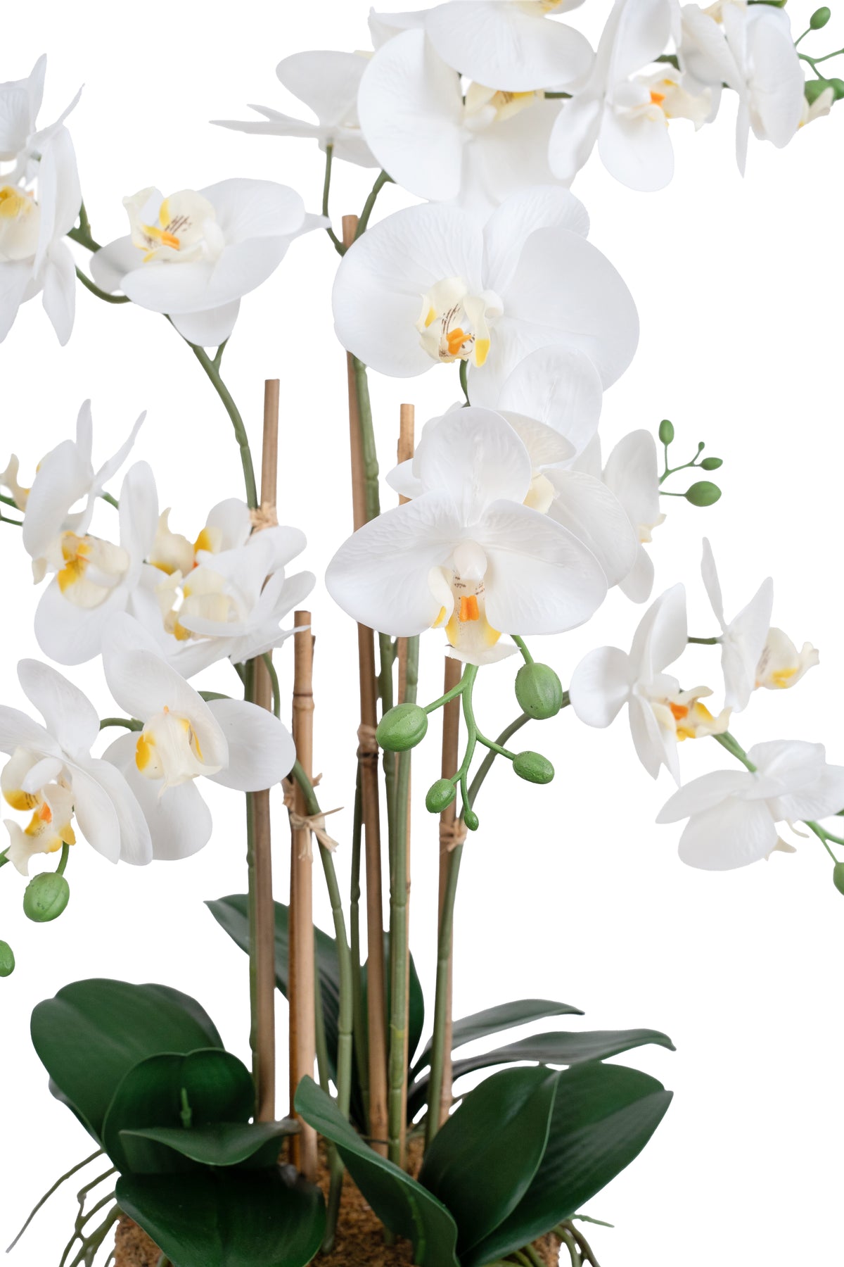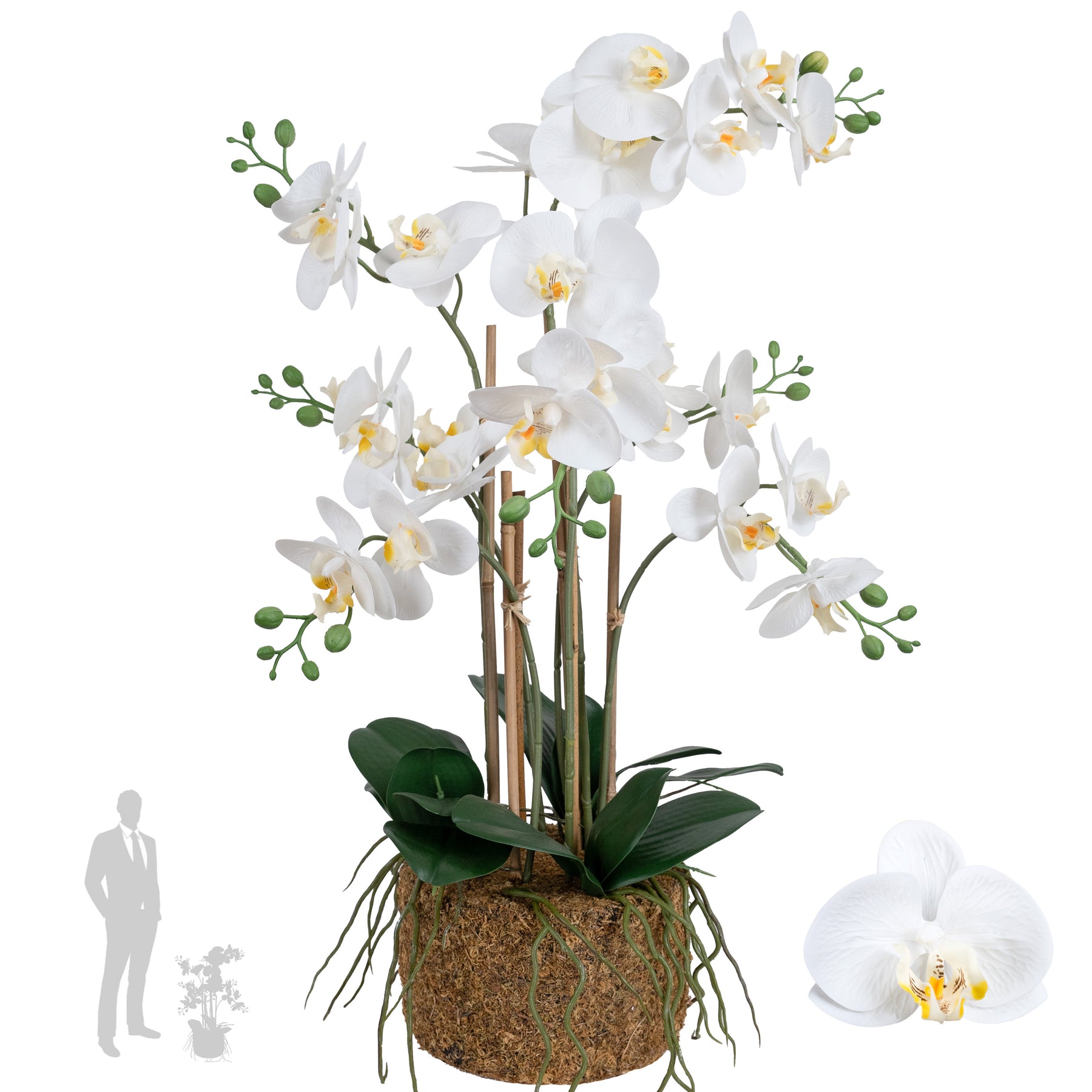 baza orhideei este realizata din polistiren negru acoperit cu muschi natural,frunzele artificiale sunt fixate pe sarma metalica flexibila acoperita cu multistraturi de PP, realizate din 33 nanostraturi de PP, cu aspect natural,la atingere florile sunt ca si florile naturale de orhidee, avand o senzatie identica cu orhideele naturale,radacinile aeriene sunt realizate din PEVA,suportii de sustinere a tulpinilor sunt bete de bambus naturale