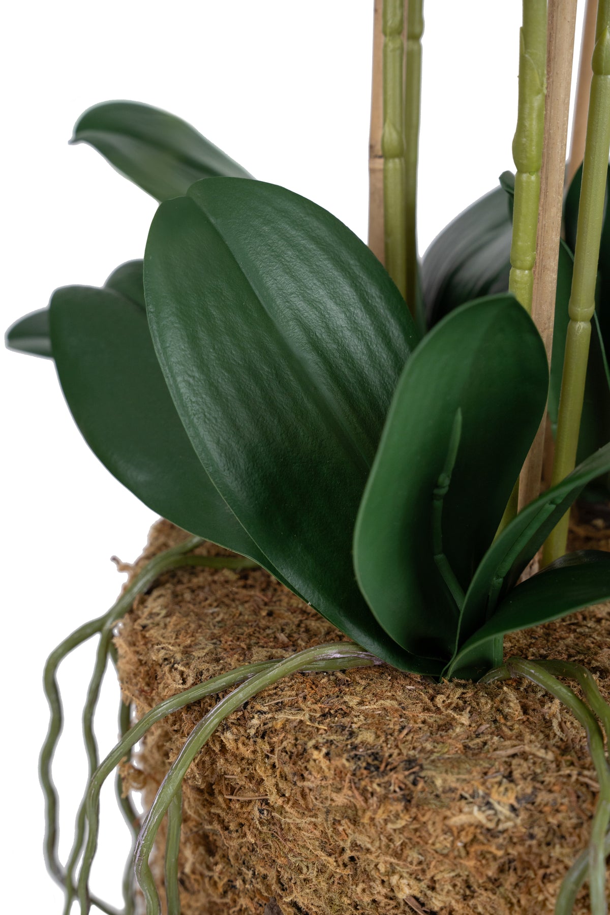 baza orhideei este realizata din polistiren negru acoperit cu muschi natural,frunzele artificiale sunt fixate pe sarma metalica flexibila acoperita cu multistraturi de PP, realizate din 33 nanostraturi de PP, cu aspect natural,la atingere florile sunt ca si florile naturale de orhidee, avand o senzatie identica cu orhideele naturale,radacinile aeriene sunt realizate din PEVA,suportii de sustinere a tulpinilor sunt bete de bambus naturale