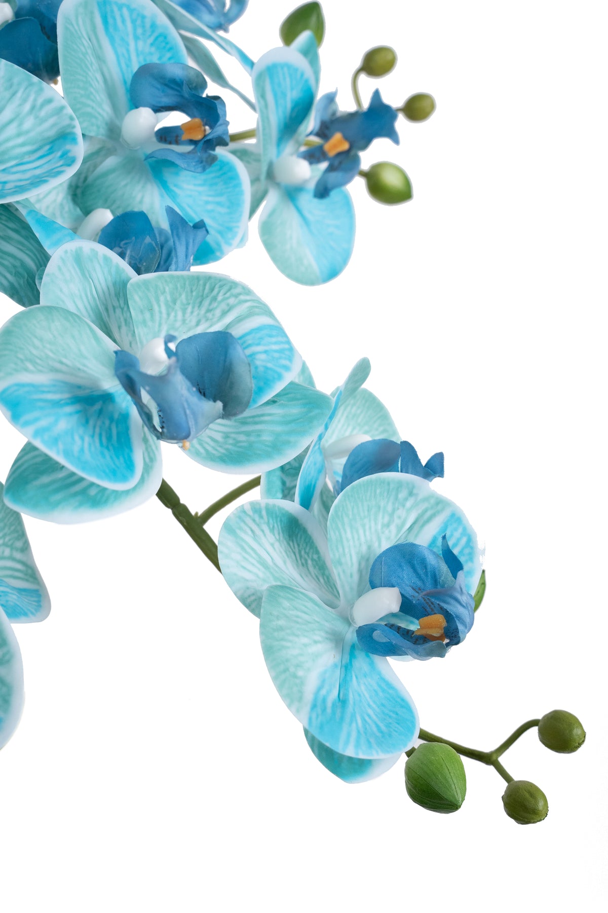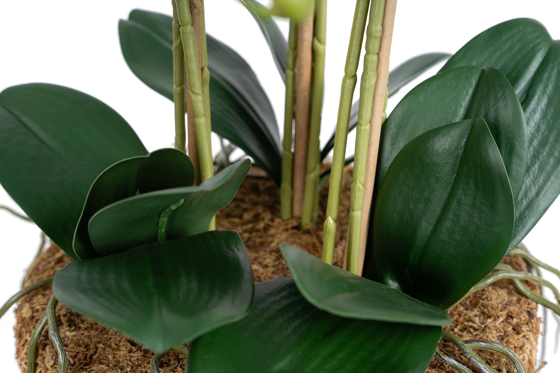 baza orhideei este realizata din polistiren negru acoperit cu muschi natural, frunzele artificiale sunt fixate pe sarma metalica flexibila acoperita cu multistraturi de PP, realizate din 33 nanostraturi de PP, cu aspect natural, la atingere florile sunt ca si florile naturale de orhidee, avand o senzatie identica cu orhideele naturale, radacinile aeriene sunt realizate din PEVA, suportii de sustinere a tulpinilor sunt bete de bambus naturale