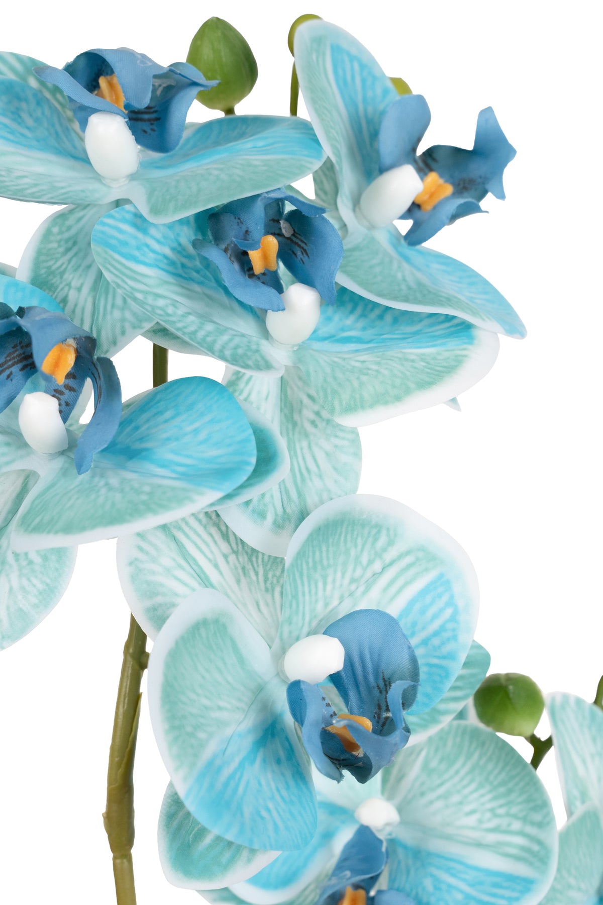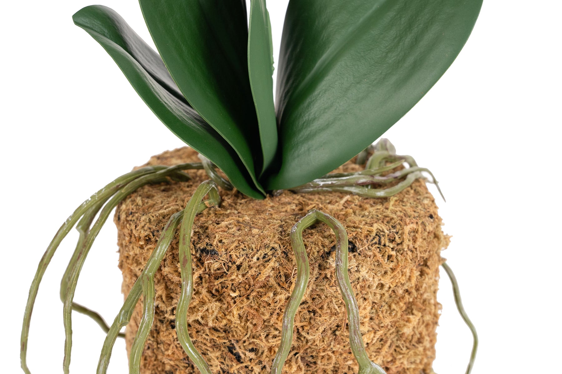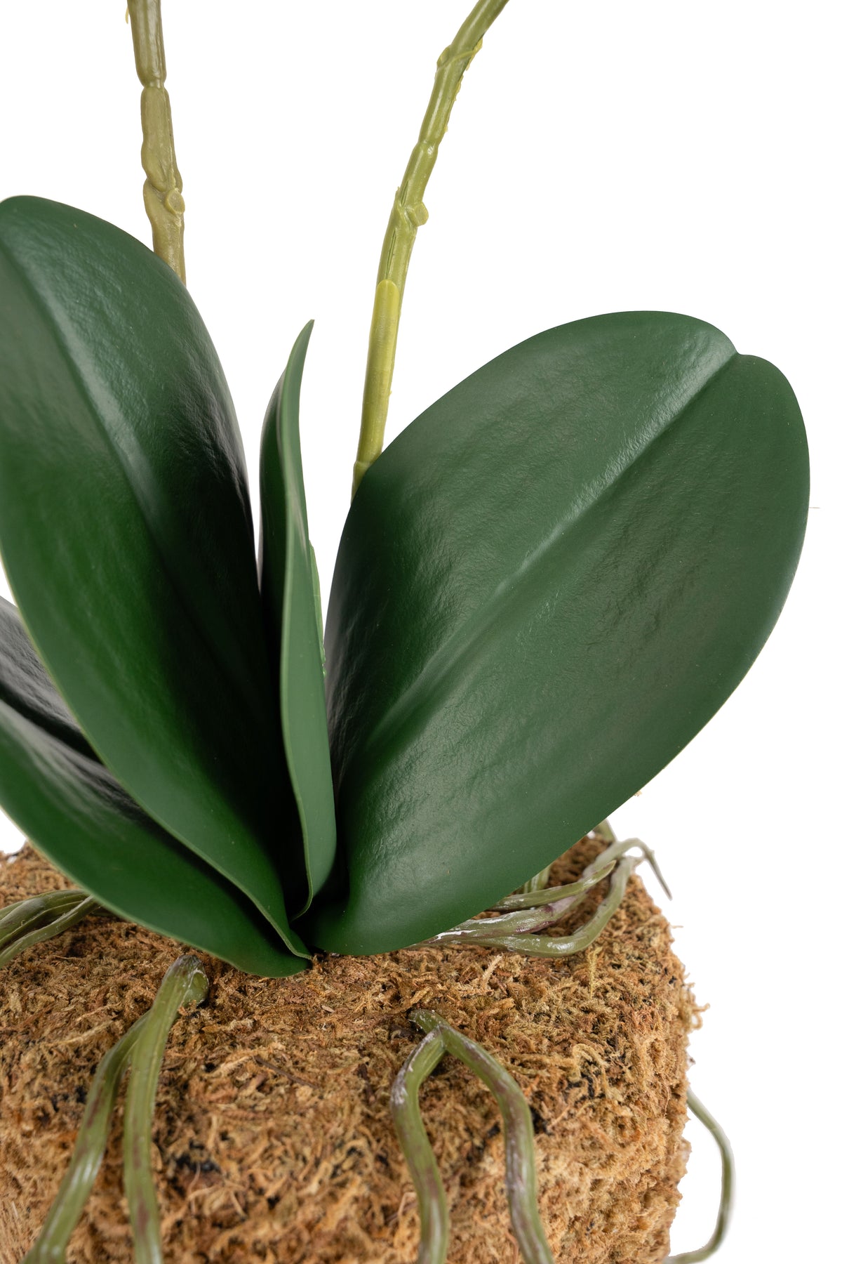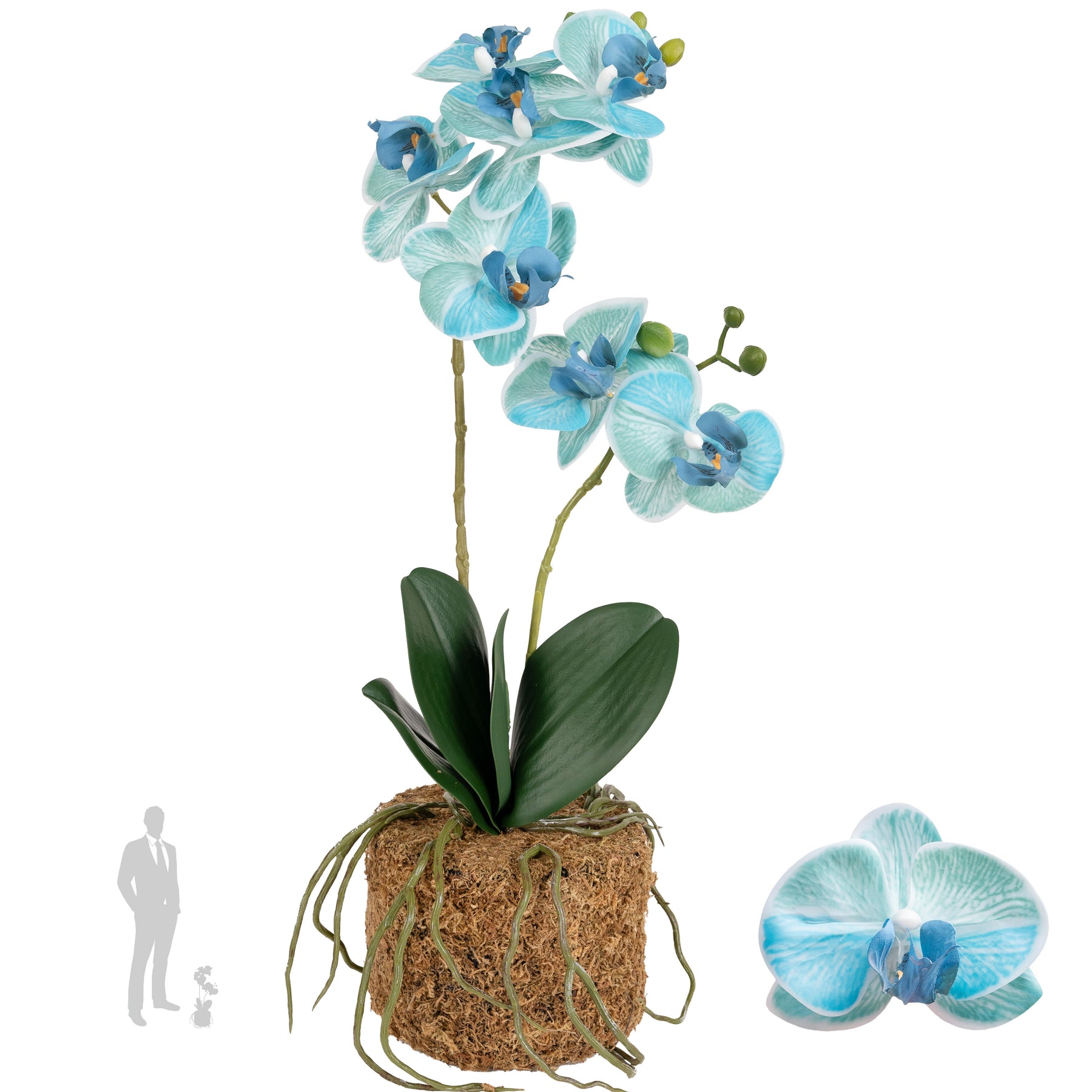 baza orhideei este realizata din polistiren negru acoperit cu muschi natural,frunzele artificiale sunt fixate pe sarma metalica flexibila acoperita cu multistraturi de PP, realizate din 33 nanostraturi de PP, cu aspect natural,la atingere florile sunt ca si florile naturale de orhidee, avand o senzatie identica cu orhideele naturale,radacinile aeriene sunt realizate din PEVA,suportii de sustinere a tulpinilor sunt bete de bambus naturale
