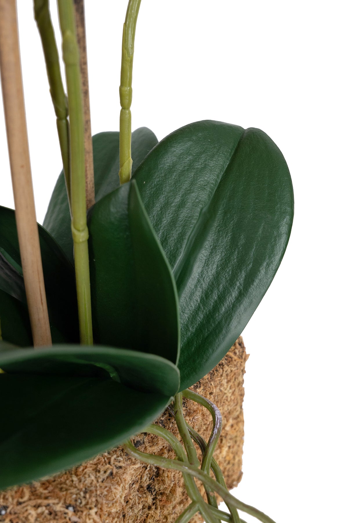baza orhideei este realizata din polistiren negru acoperit cu muschi natural,frunzele artificiale sunt fixate pe sarma metalica flexibila acoperita cu multistraturi de PP, realizate din 33 nanostraturi de PP, cu aspect natural,la atingere florile sunt ca si florile naturale de orhidee, avand o senzatie identica cu orhideele naturale,radacinile aeriene sunt realizate din PEVA,suportii de sustinere a tulpinilor sunt bete de bambus naturale