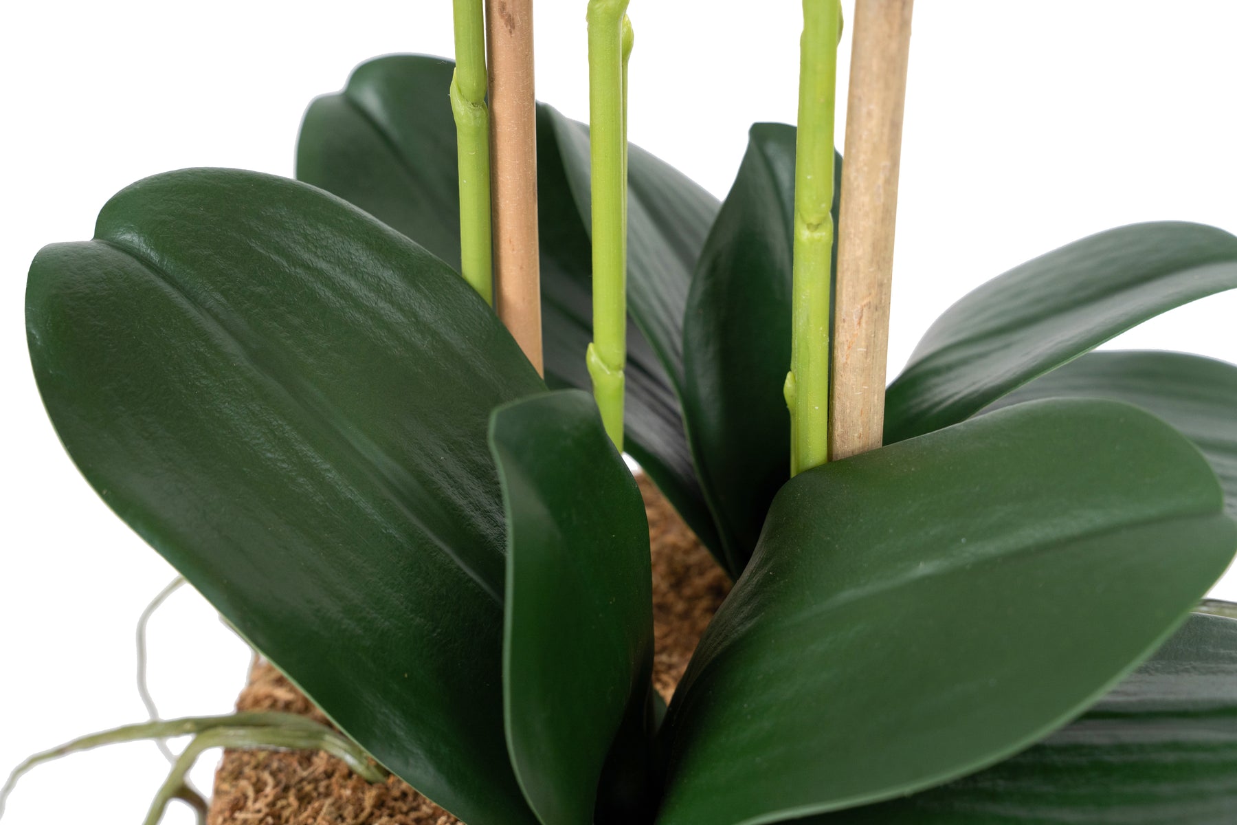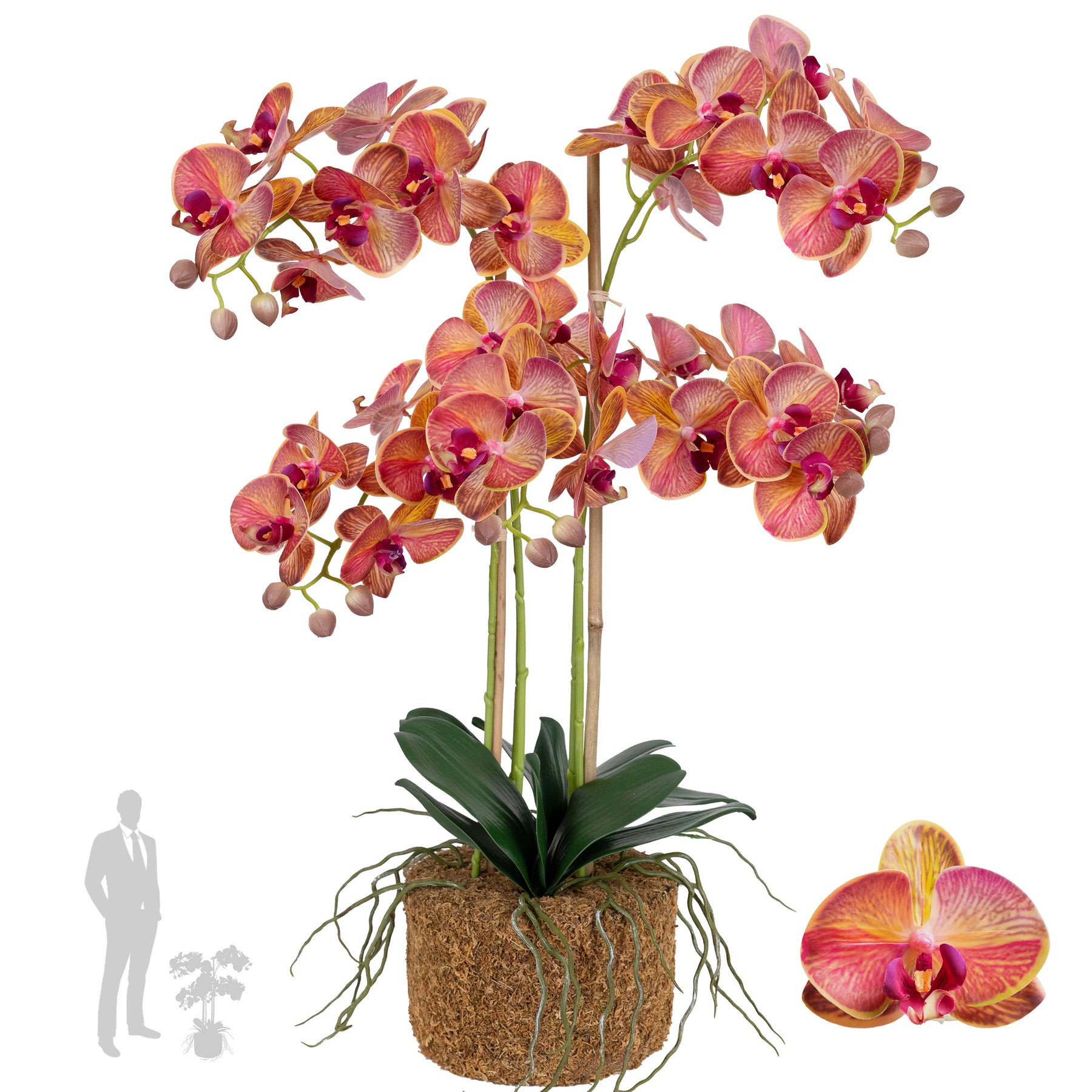 baza orhideei este realizata din polistiren negru acoperit cu muschi natural,frunzele artificiale sunt fixate pe sarma metalica flexibila acoperita cu multistraturi de PP, realizate din 33 nanostraturi de PP, cu aspect natural,la atingere florile sunt ca si florile naturale de orhidee, avand o senzatie identica cu orhideele naturale,radacinile aeriene sunt realizate din PEVA,suportii de sustinere a tulpinilor sunt bete de bambus naturale