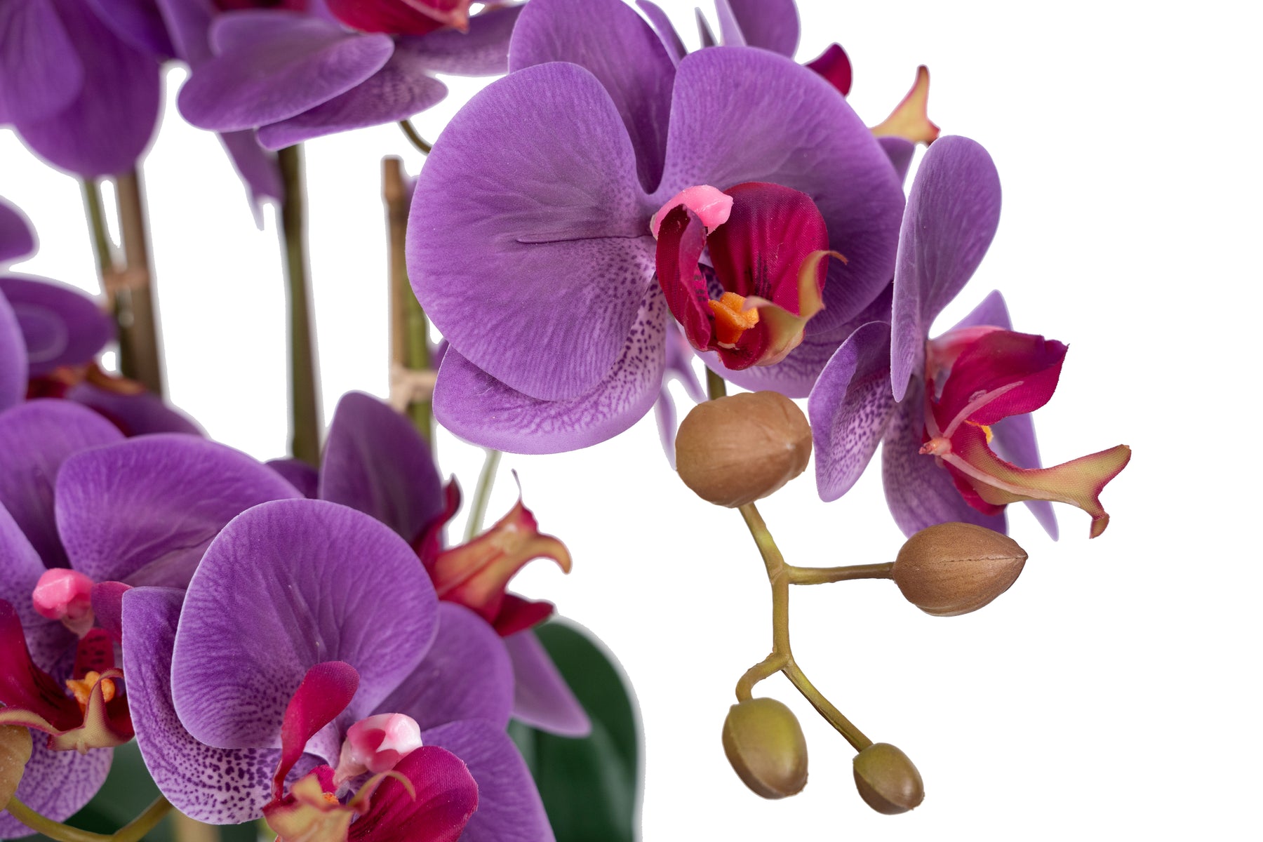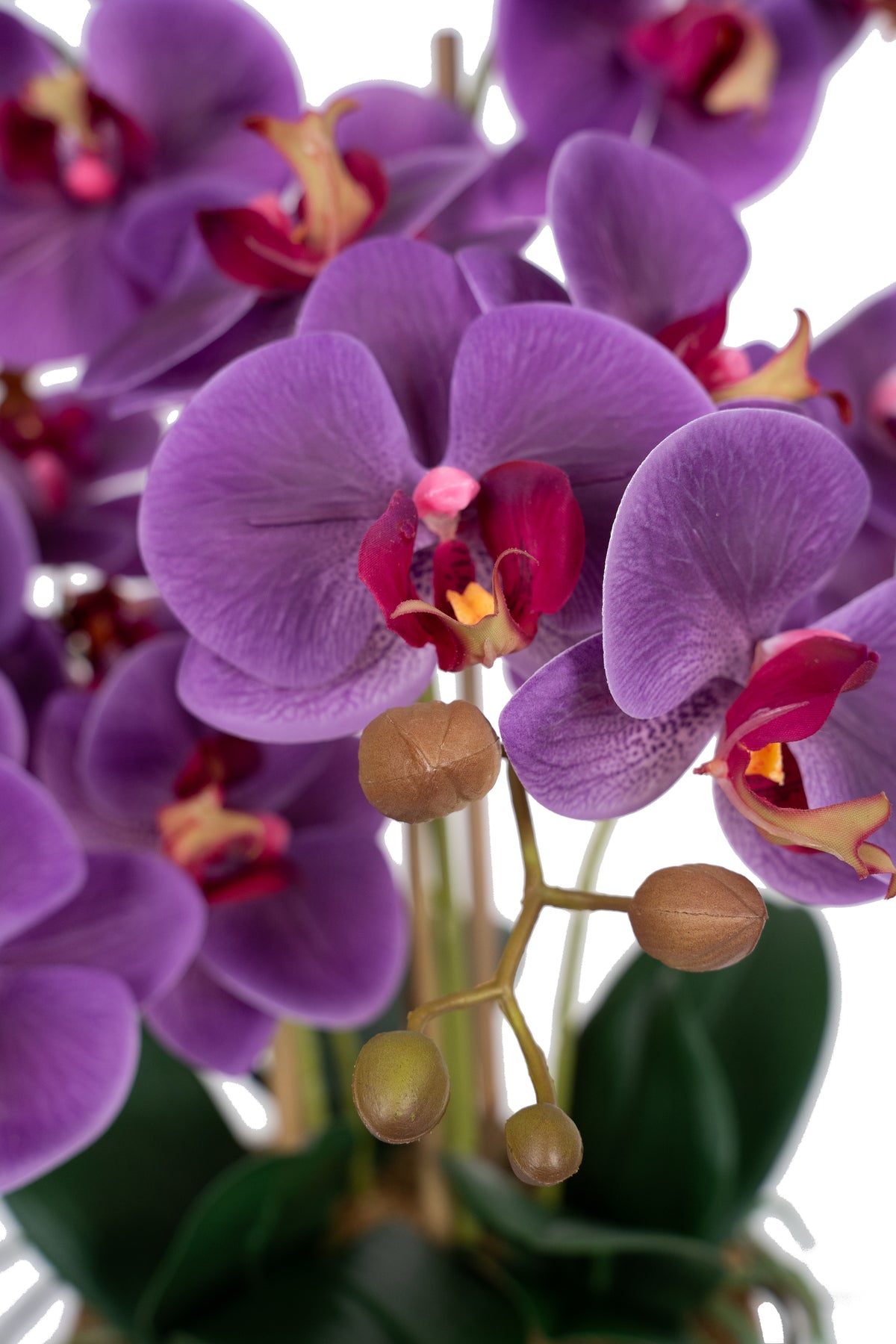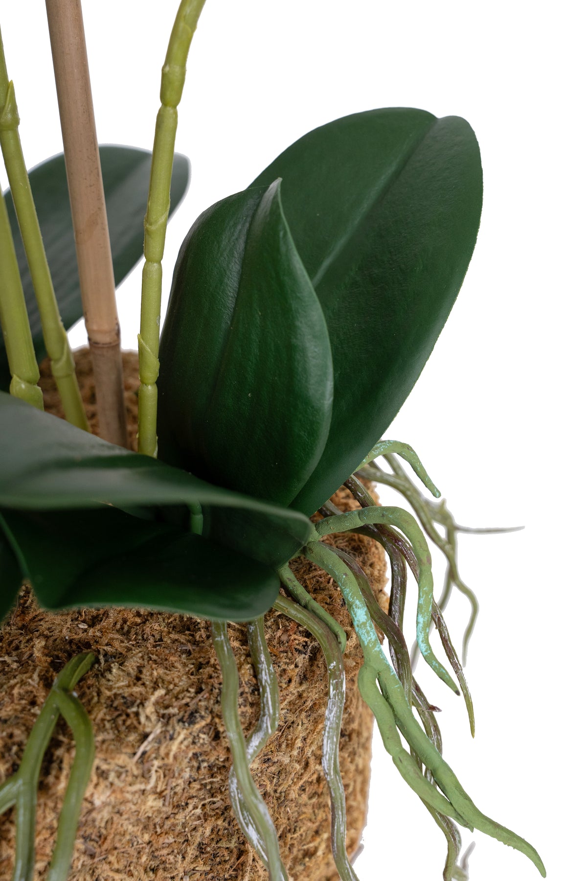 baza orhideei este realizata din polistiren negru acoperit cu muschi natural,frunzele artificiale sunt fixate pe sarma metalica flexibila acoperita cu multistraturi de PP, realizate din 33 nanostraturi de PP, cu aspect natural,la atingere florile sunt ca si florile naturale de orhidee, avand o senzatie identica cu orhideele naturale,radacinile aeriene sunt realizate din PEVA,suportii de sustinere a tulpinilor sunt bete de bambus naturale