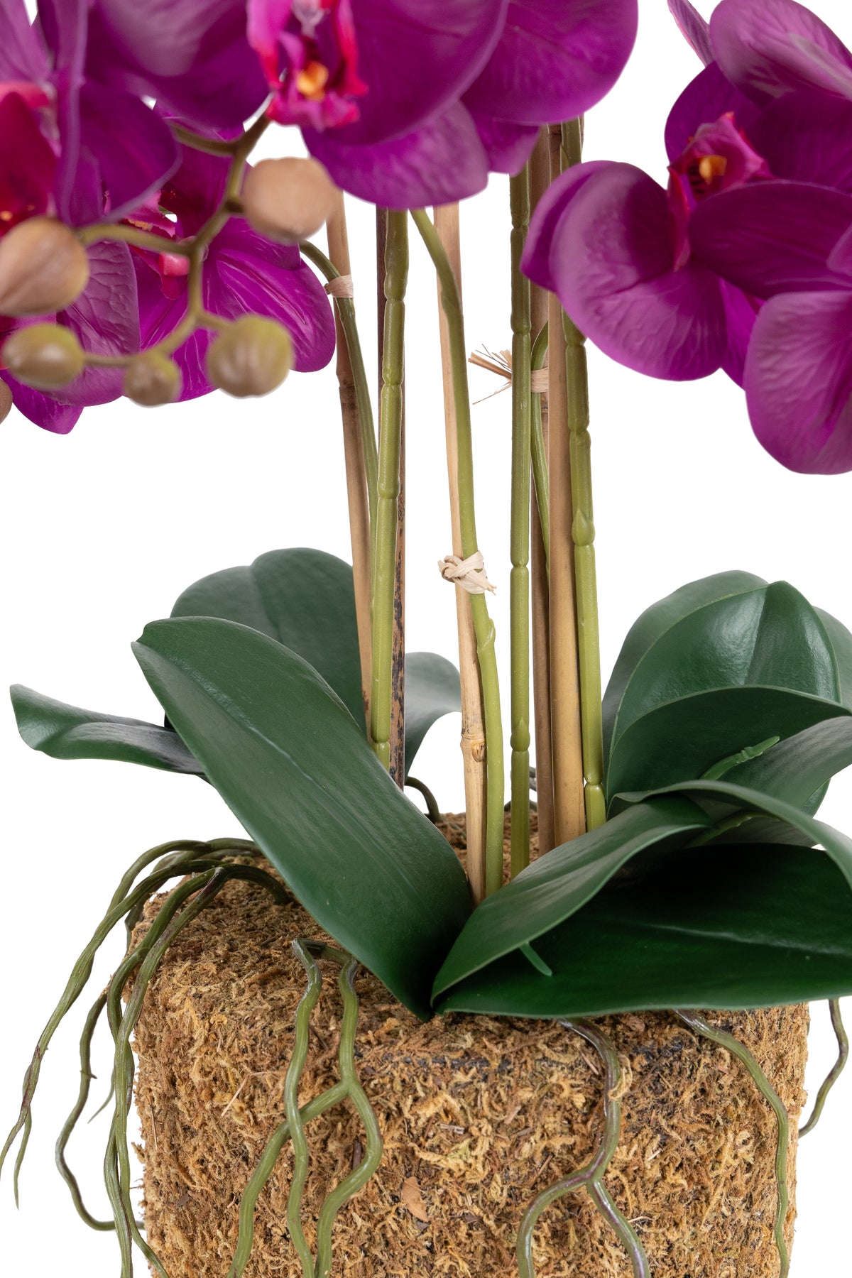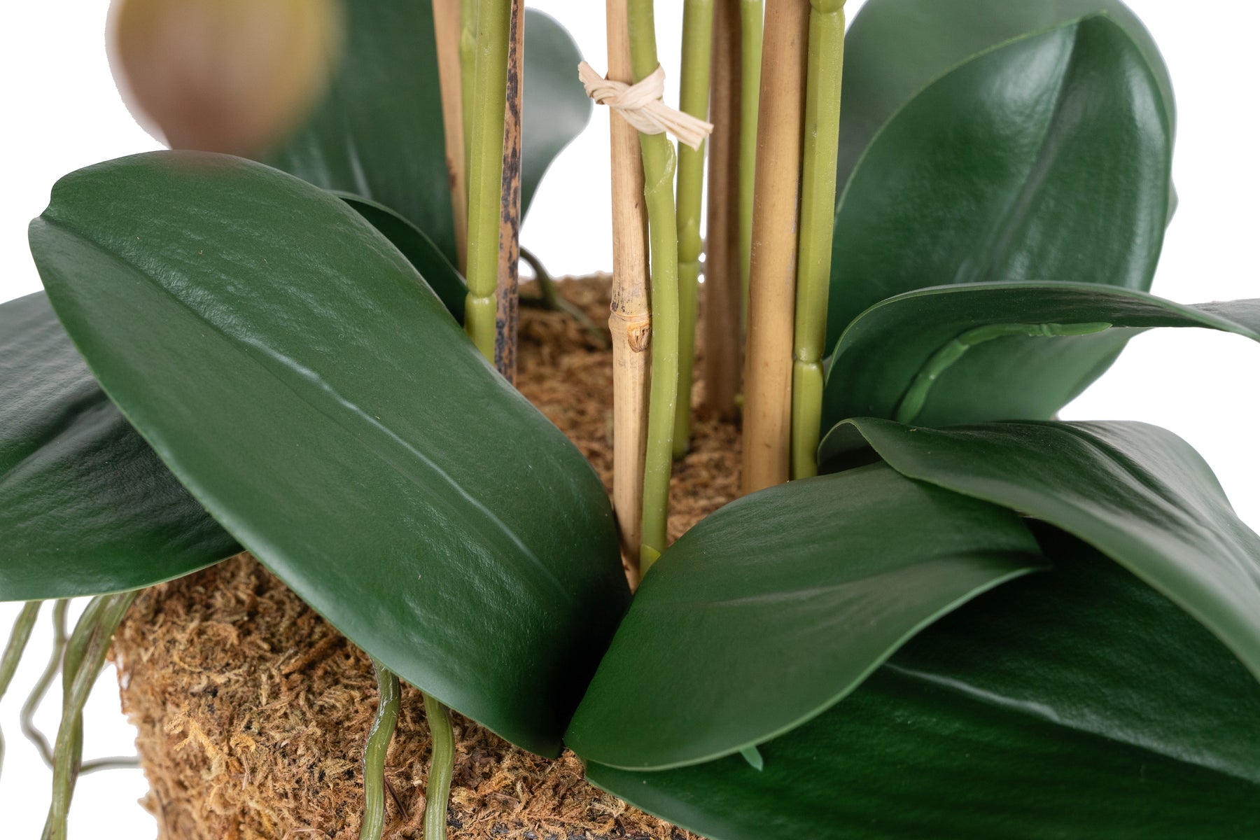 baza orhideei este realizata din polistiren negru acoperit cu muschi natural,frunzele artificiale sunt fixate pe sarma metalica flexibila acoperita cu multistraturi de PP, realizate din 33 nanostraturi de PP, cu aspect natural,la atingere florile sunt ca si florile naturale de orhidee, avand o senzatie identica cu orhideele naturale,radacinile aeriene sunt realizate din PEVA,suportii de sustinere a tulpinilor sunt bete de bambus naturale
