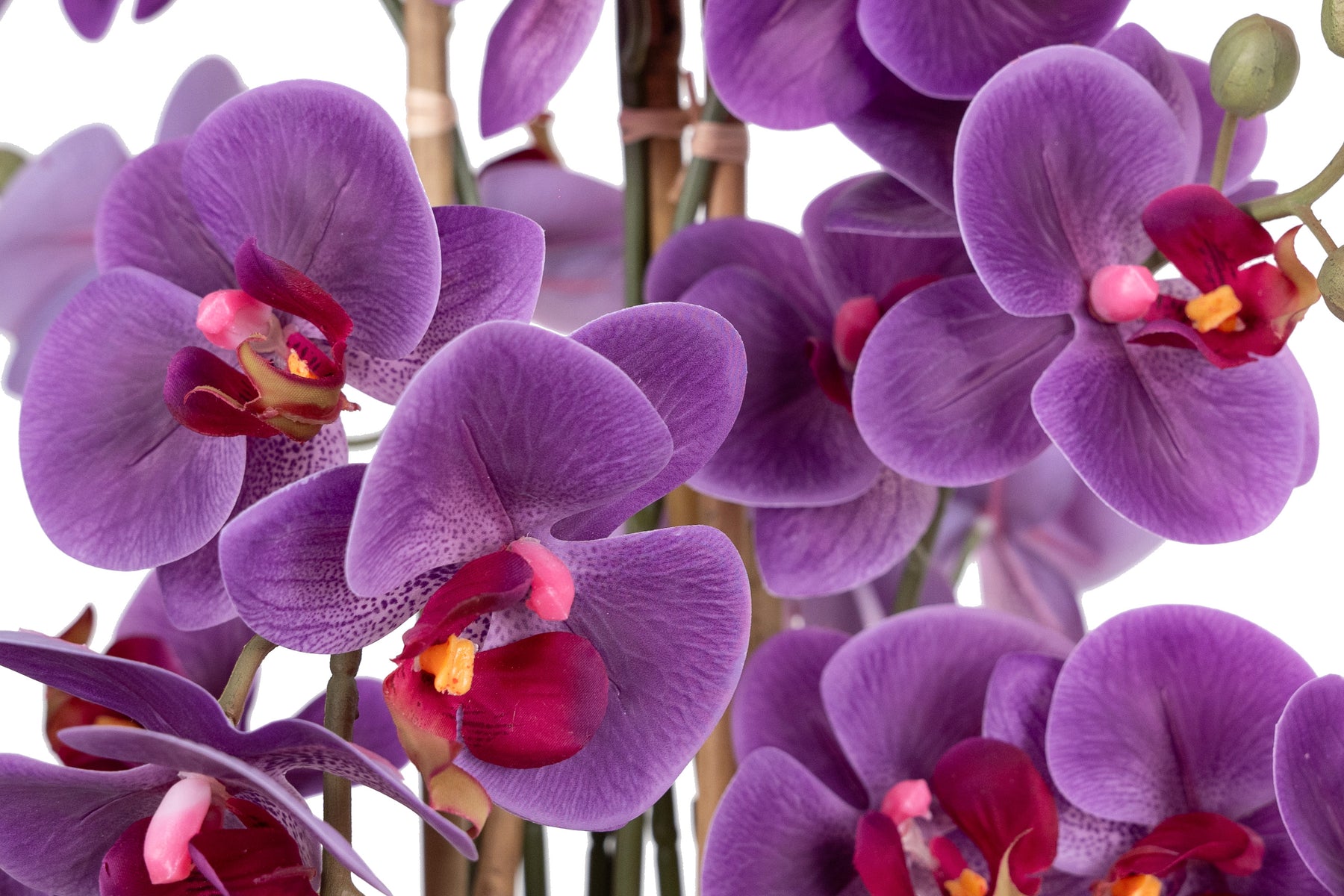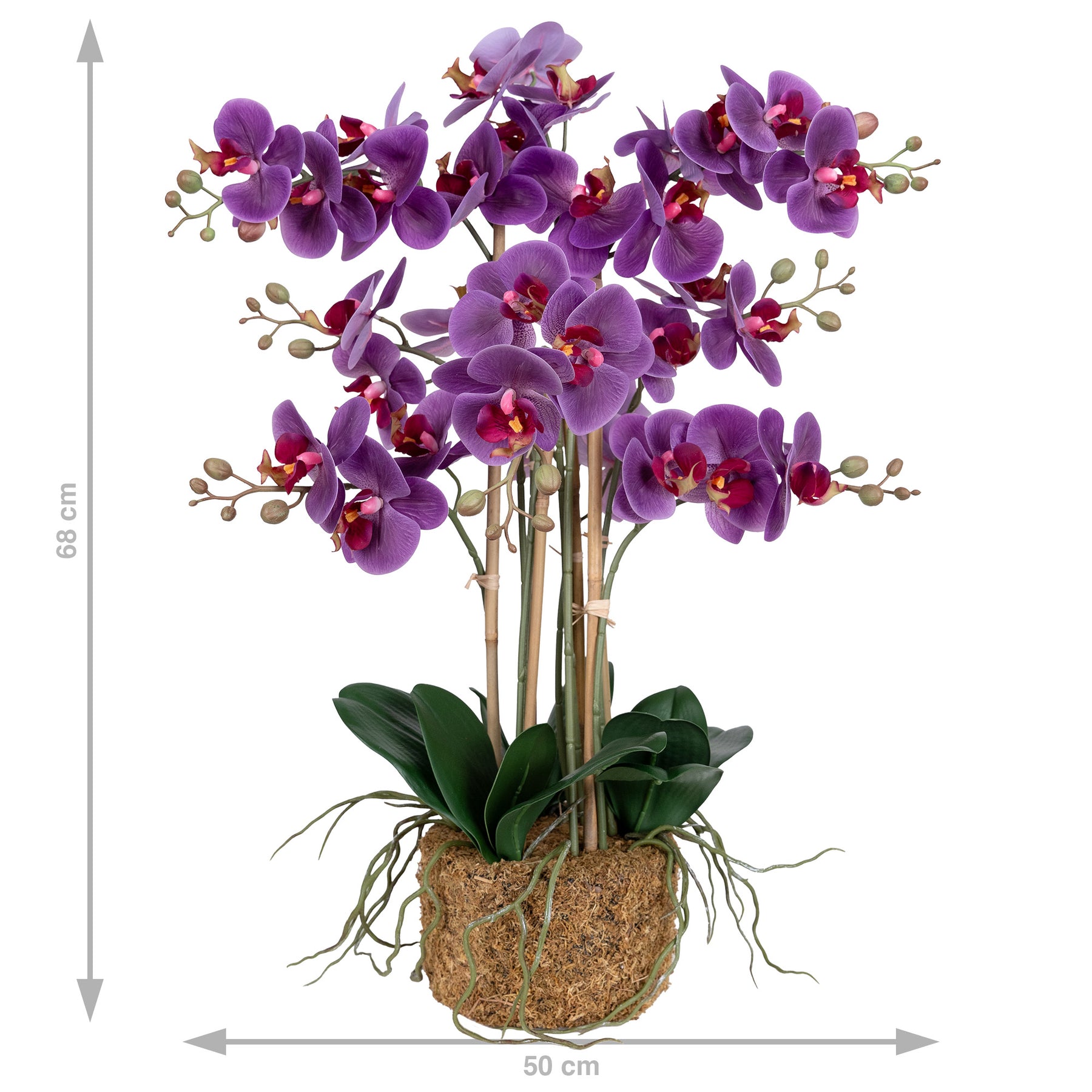 baza orhideei este realizata din polistiren negru acoperit cu muschi natural,frunzele artificiale sunt fixate pe sarma metalica flexibila acoperita cu multistraturi de PP, realizate din 33 nanostraturi de PP, cu aspect natural,la atingere florile sunt ca si florile naturale de orhidee, avand o senzatie identica cu orhideele naturale,radacinile aeriene sunt realizate din PEVA,suportii de sustinere a tulpinilor sunt bete de bambus naturale