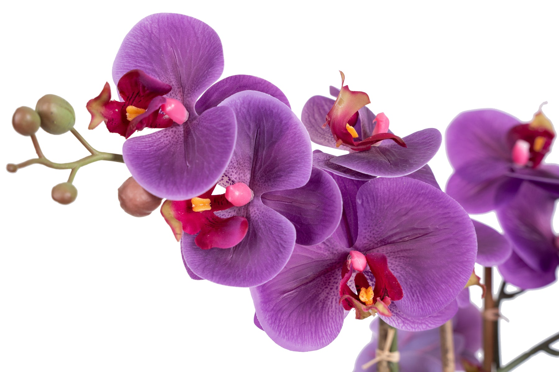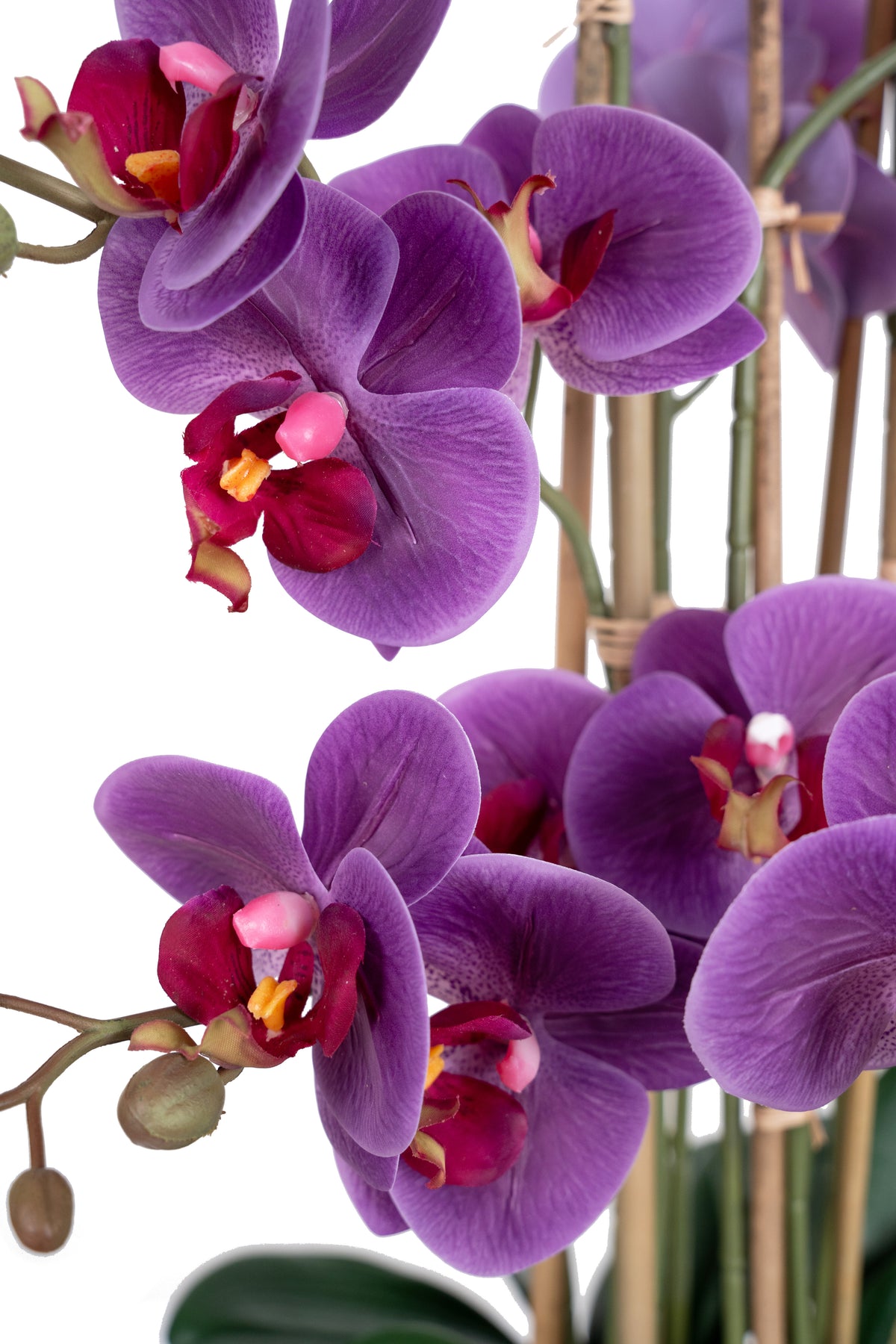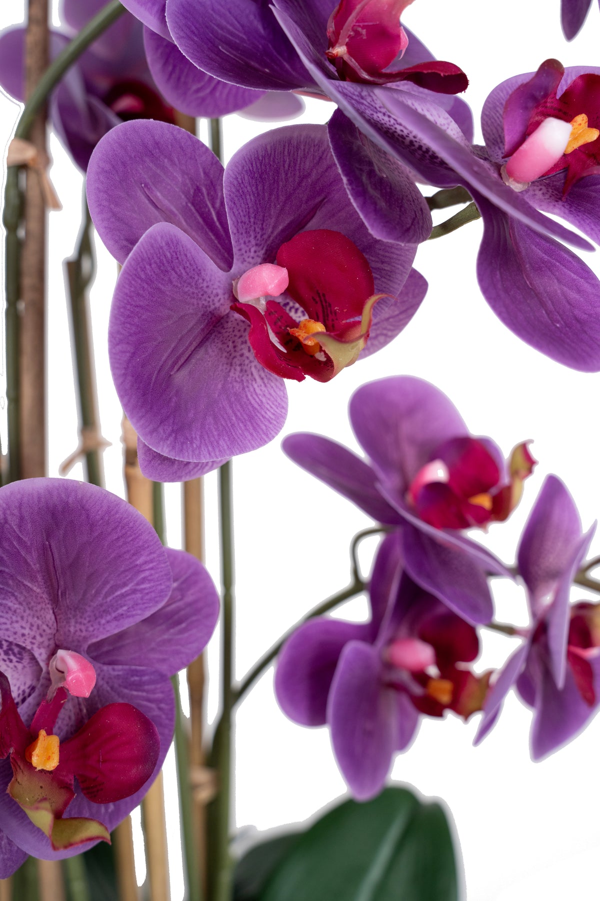 baza orhideei este realizata din polistiren negru acoperit cu muschi natural,frunzele artificiale sunt fixate pe sarma metalica flexibila acoperita cu multistraturi de PP, realizate din 33 nanostraturi de PP, cu aspect natural,la atingere florile sunt ca si florile naturale de orhidee, avand o senzatie identica cu orhideele naturale,radacinile aeriene sunt realizate din PEVA,suportii de sustinere a tulpinilor sunt bete de bambus naturale