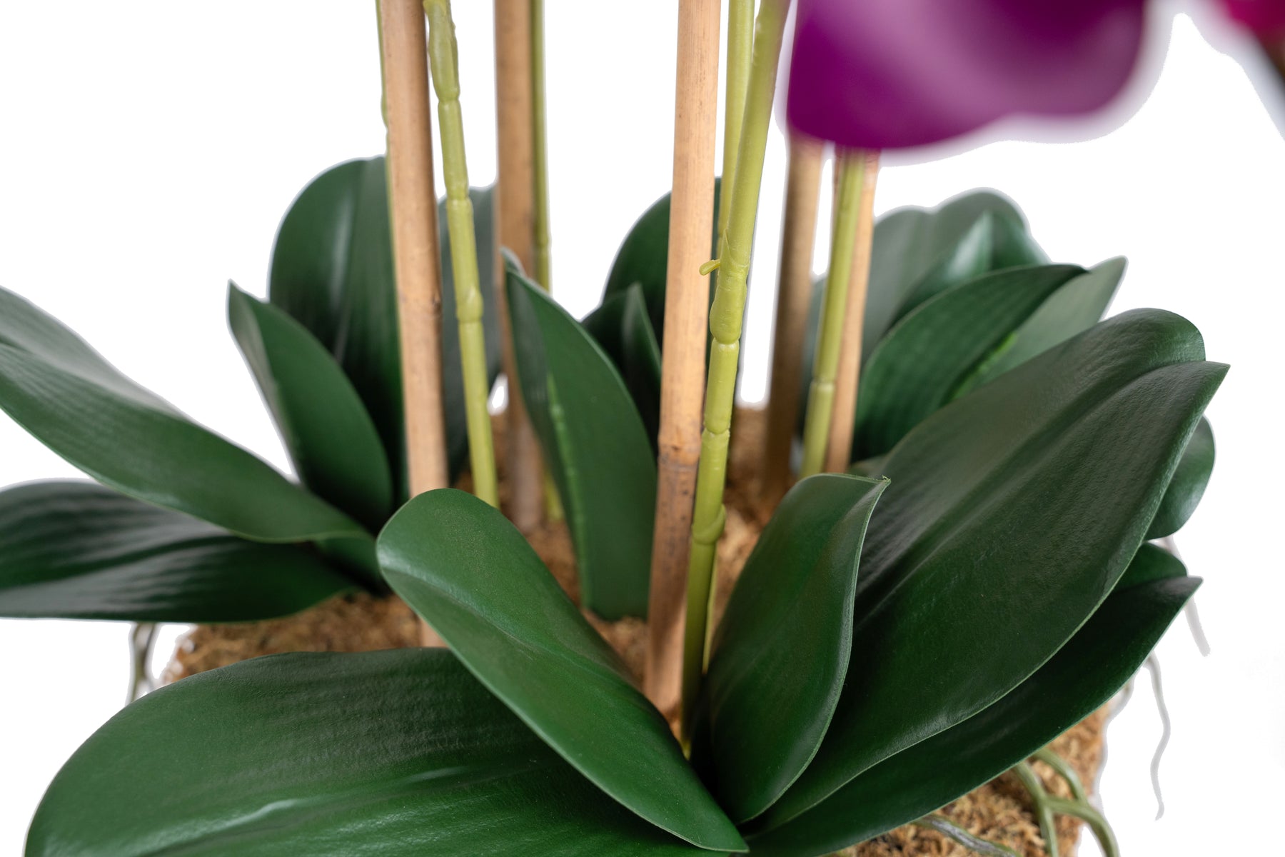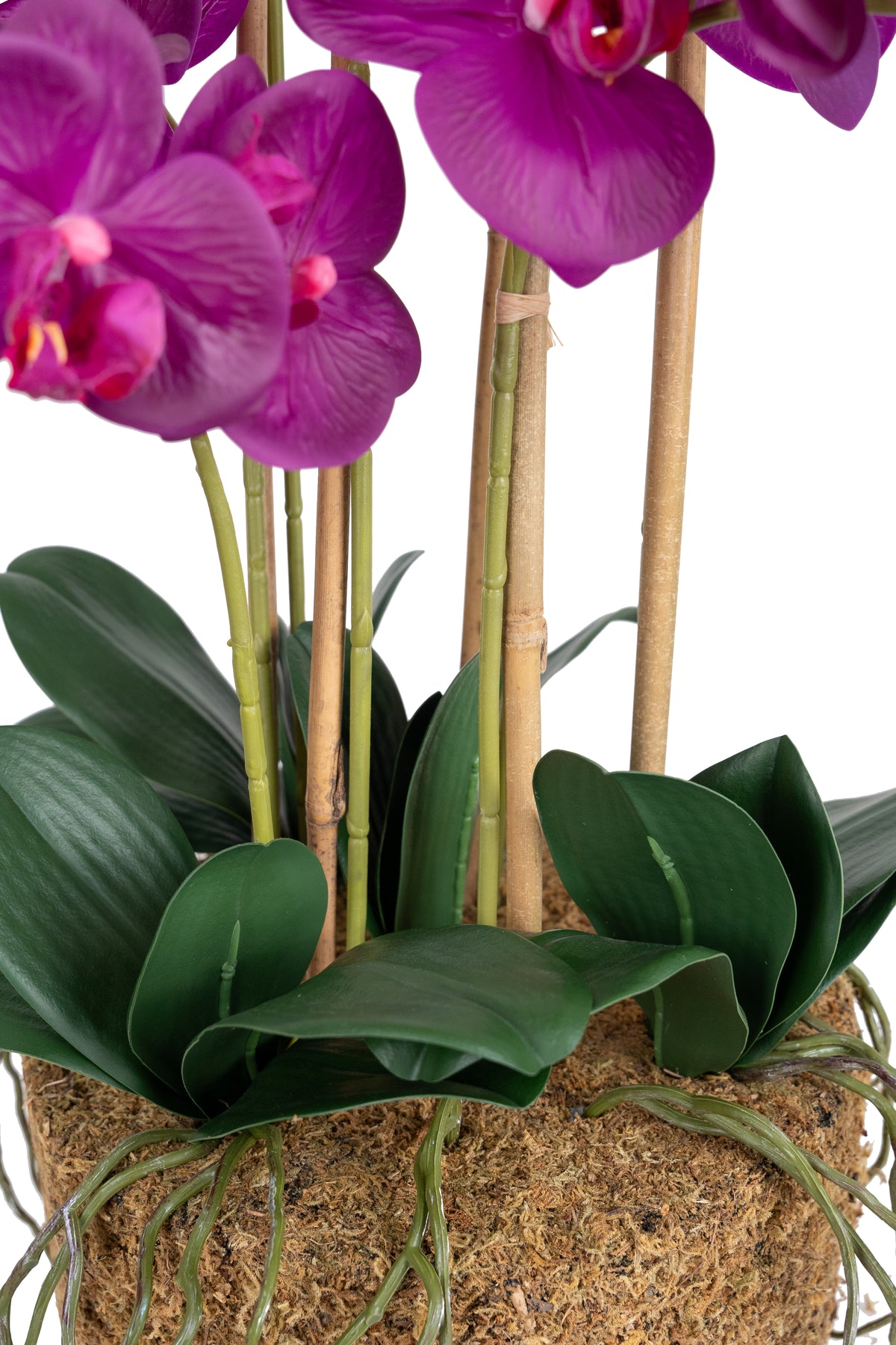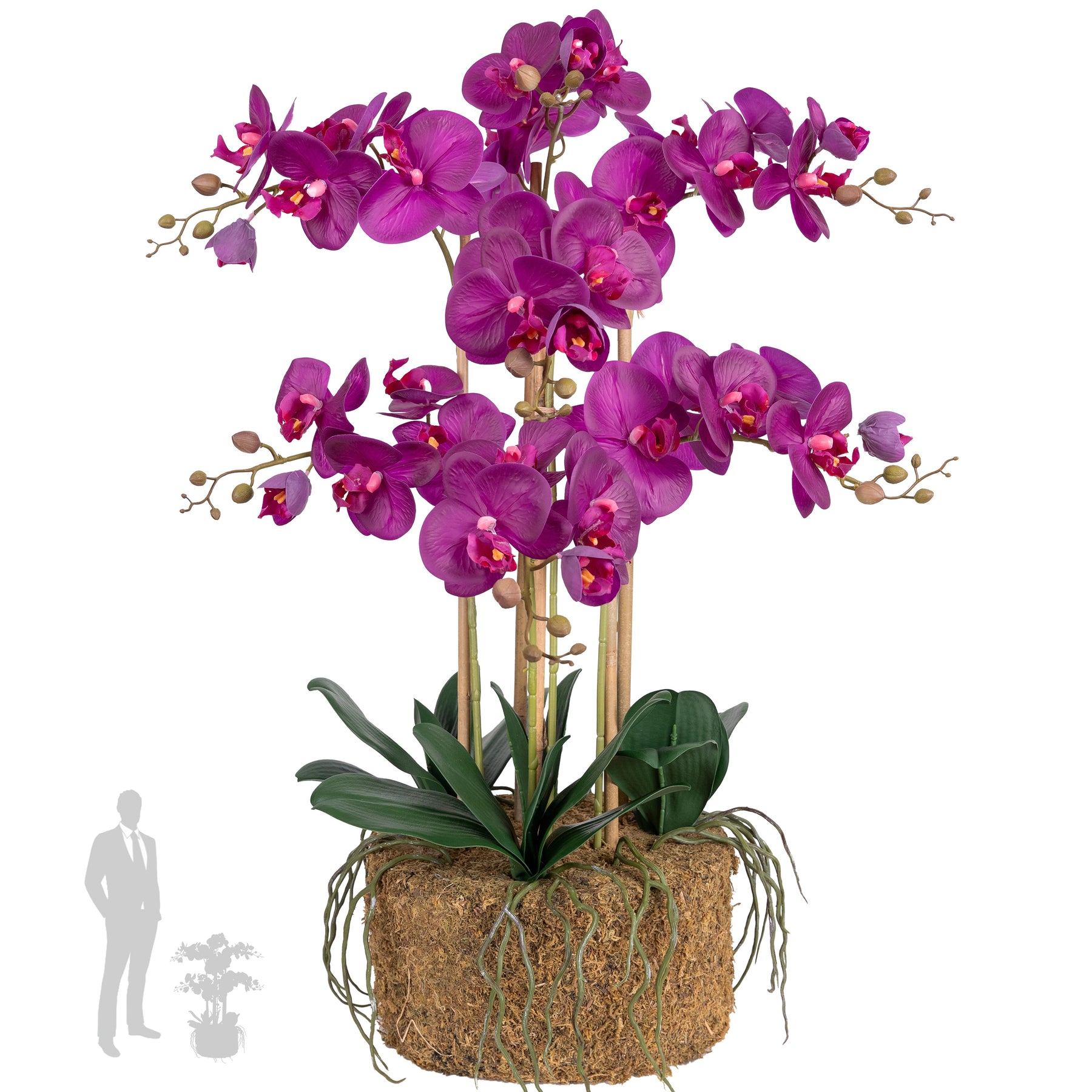 baza orhideei este realizata din polistiren negru acoperit cu muschi natural,frunzele artificiale sunt fixate pe sarma metalica flexibila acoperita cu multistraturi de PP, realizate din 33 nanostraturi de PP, cu aspect natural,la atingere florile sunt ca si florile naturale de orhidee, avand o senzatie identica cu orhideele naturale,radacinile aeriene sunt realizate din PEVA,suportii de sustinere a tulpinilor sunt bete de bambus naturale