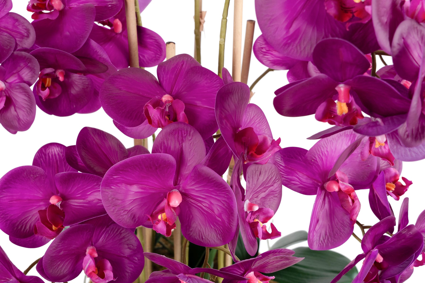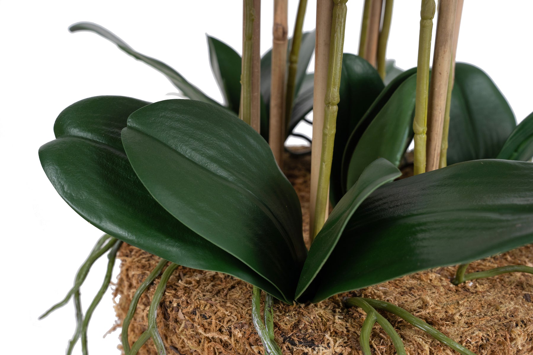 baza orhideei este realizata din polistiren negru acoperit cu muschi natural,frunzele artificiale sunt fixate pe sarma metalica flexibila acoperita cu multistraturi de PP, realizate din 33 nanostraturi de PP, cu aspect natural,la atingere florile sunt ca si florile naturale de orhidee, avand o senzatie identica cu orhideele naturale,radacinile aeriene sunt realizate din PEVA,suportii de sustinere a tulpinilor sunt bete de bambus naturale