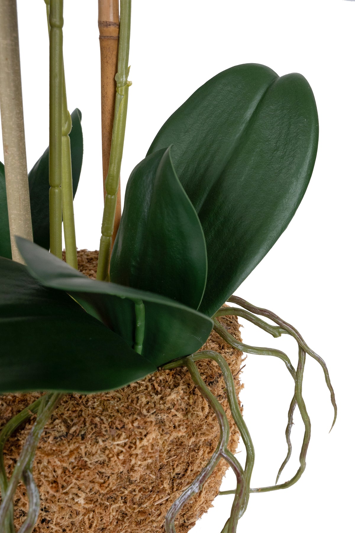 Orhidee artificiala alba cu aspect natural H61 cm cu 3 tulpini si 20 de flori cu 3 bete de bambus