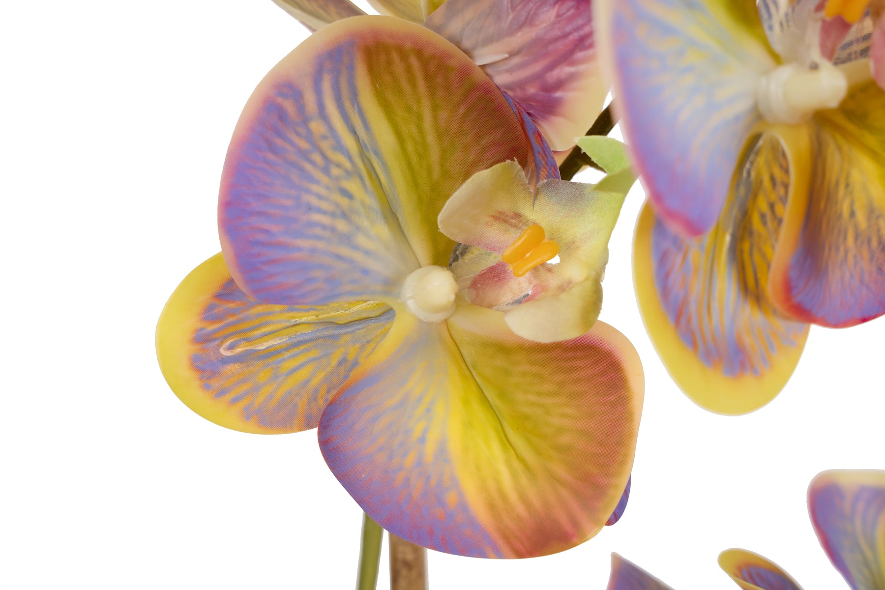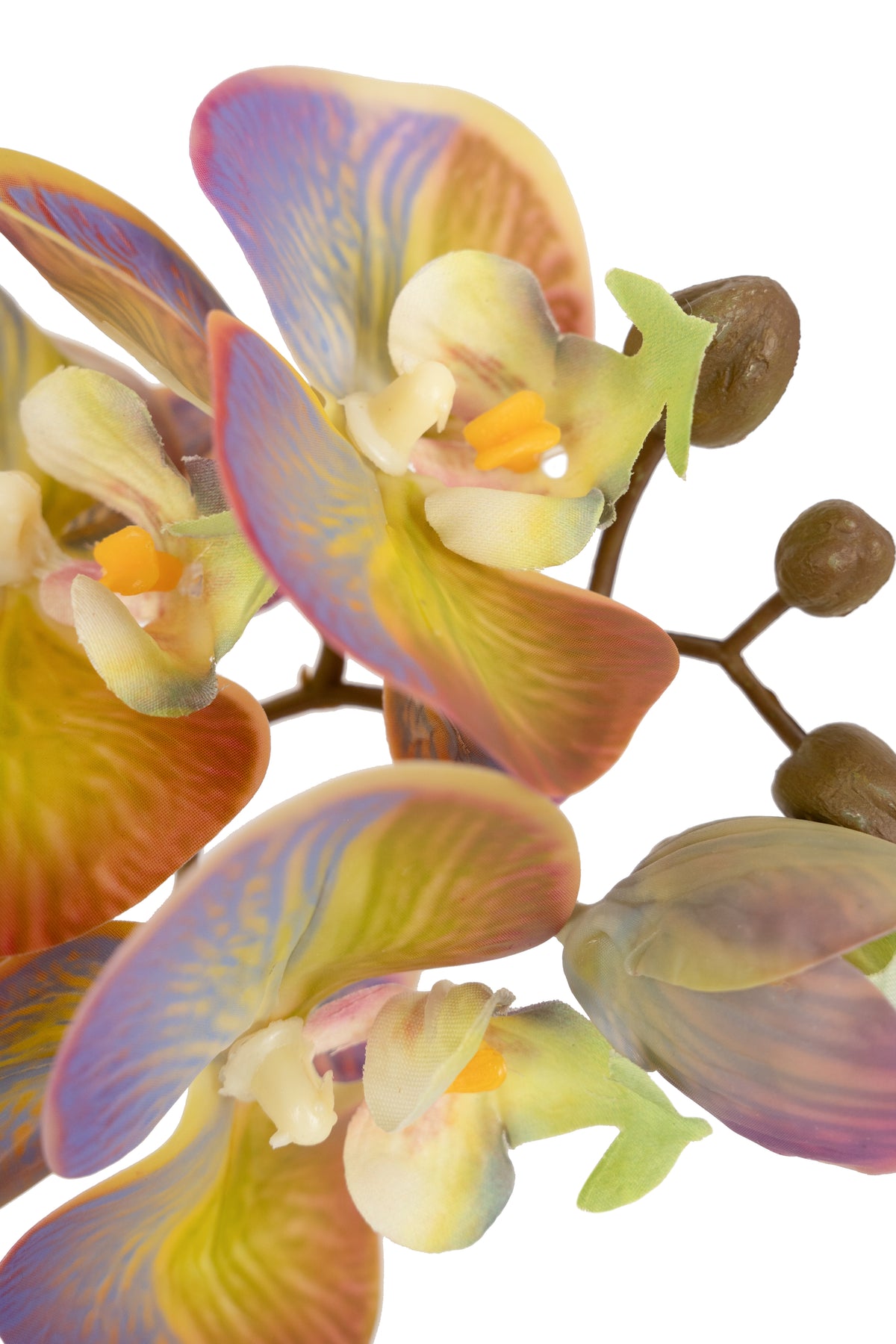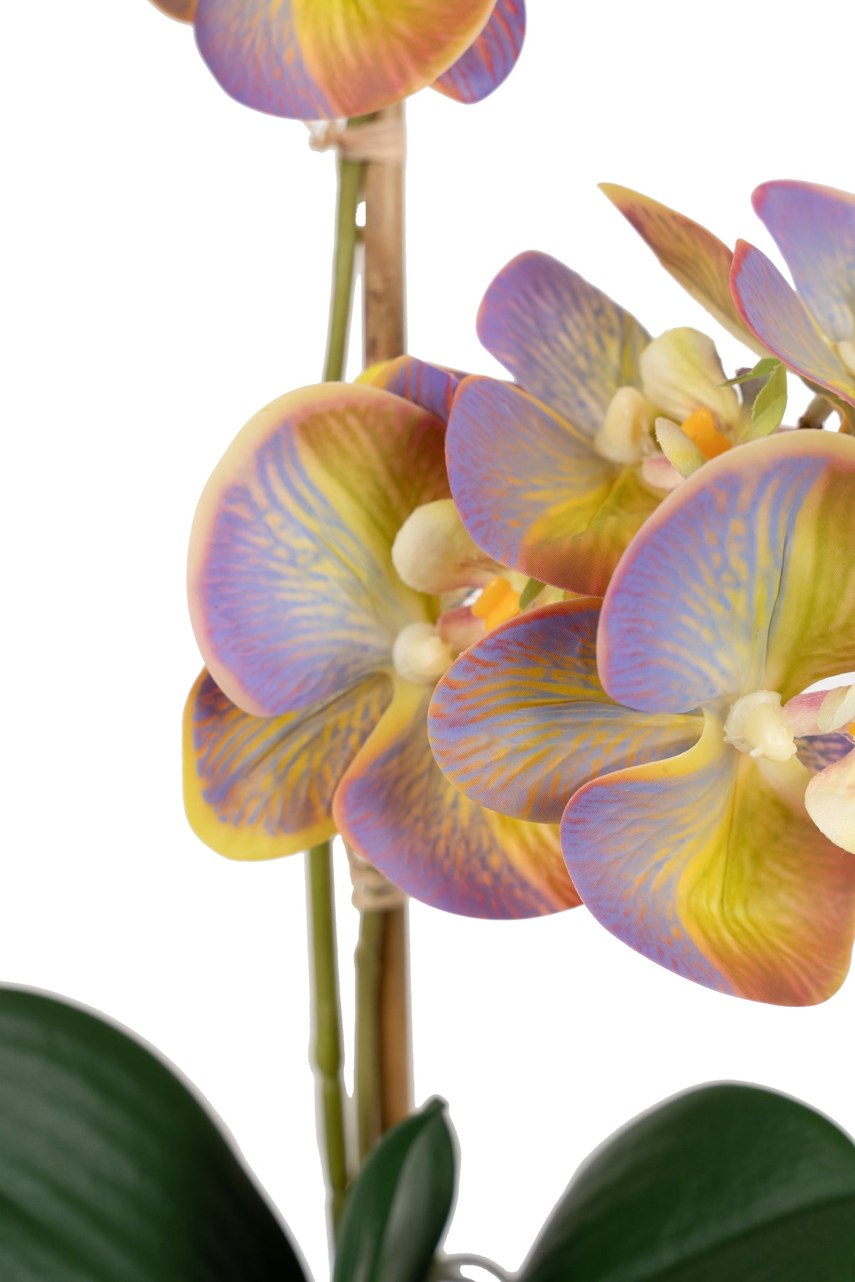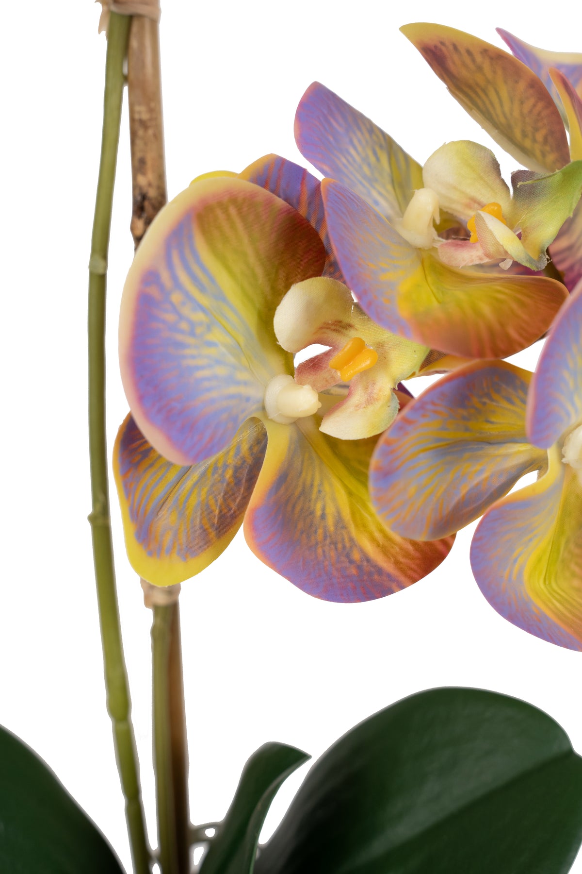 baza orhideei este realizata din polistiren negru acoperit cu muschi natural,frunzele artificiale sunt fixate pe sarma metalica flexibila acoperita cu multistraturi de PP, realizate din 33 nanostraturi de PP, cu aspect natural,la atingere florile sunt ca si florile naturale de orhidee, avand o senzatie identica cu orhideele naturale,radacinile aeriene sunt realizate din PEVA,suportii de sustinere a tulpinilor sunt bete de bambus naturale