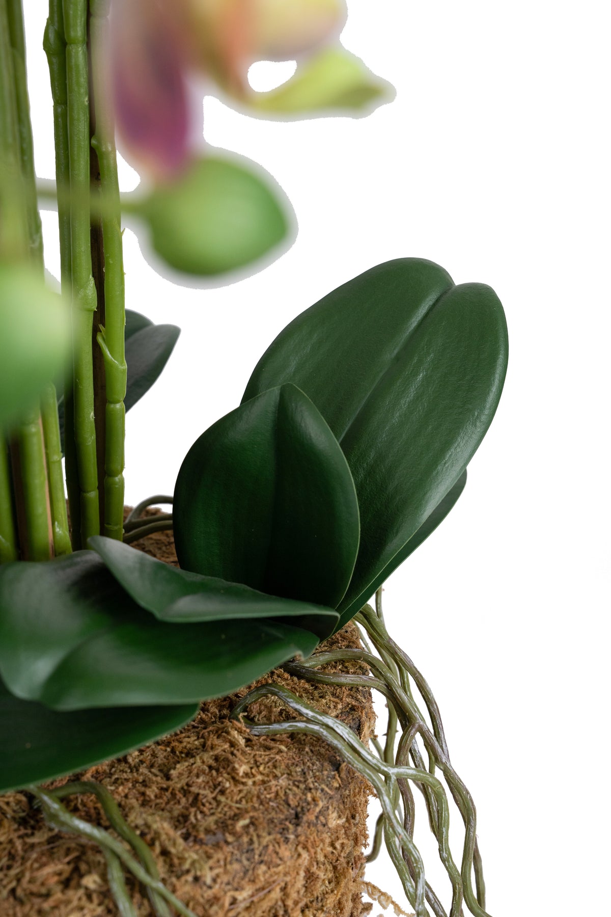 baza orhideei este realizata din polistiren negru acoperit cu muschi natural,frunzele artificiale sunt fixate pe sarma metalica flexibila acoperita cu multistraturi de PP, realizate din 33 nanostraturi de PP, cu aspect natural,la atingere florile sunt ca si florile naturale de orhidee, avand o senzatie identica cu orhideele naturale,radacinile aeriene sunt realizate din PEVA,suportii de sustinere a tulpinilor sunt bete de bambus naturale