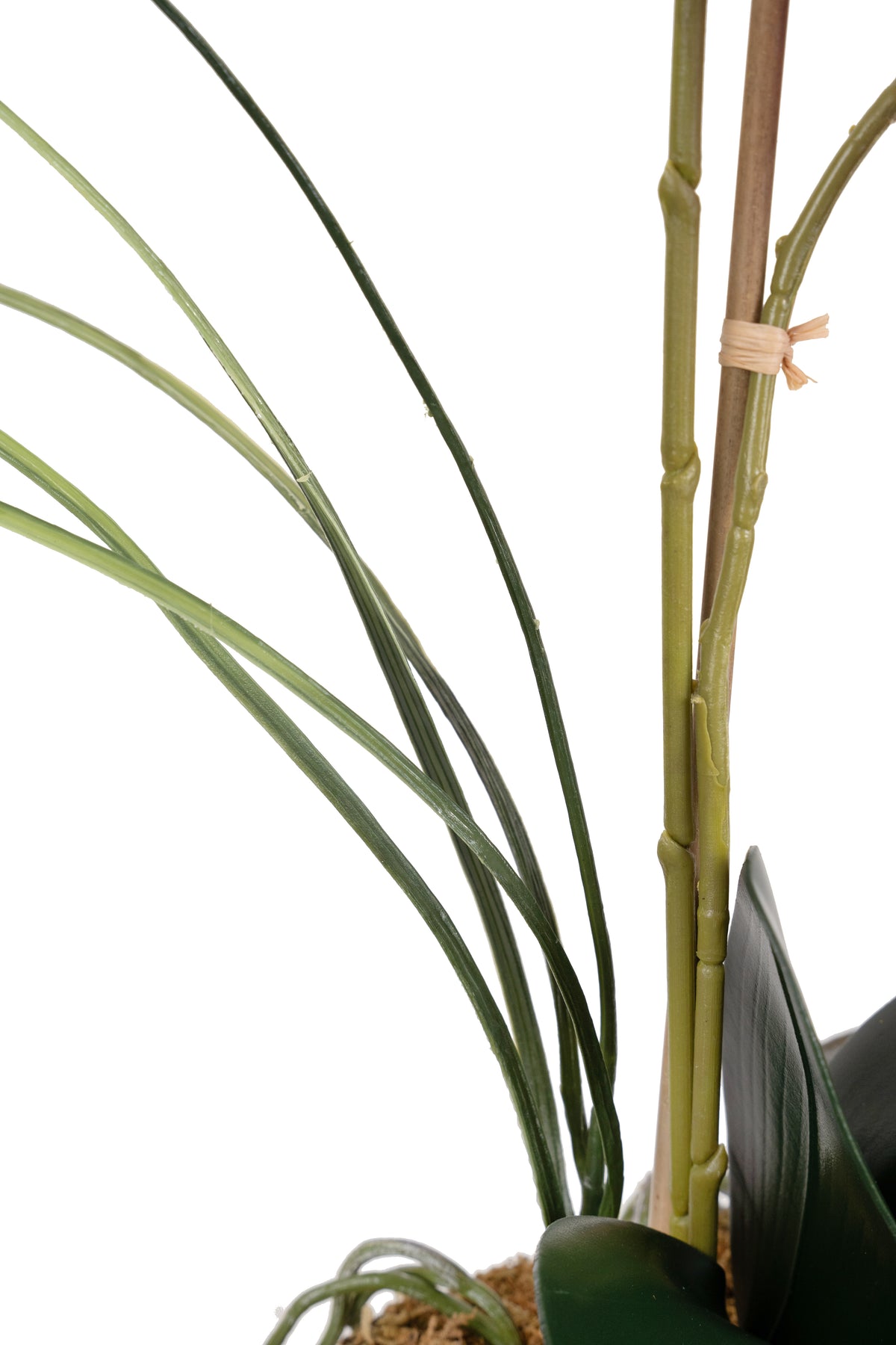 baza orhideei este realizata din polistiren negru acoperit cu muschi natural,frunzele artificiale sunt fixate pe sarma metalica flexibila acoperita cu multistraturi de PP, realizate din 33 nanostraturi de PP, cu aspect natural,la atingere florile sunt ca si florile naturale de orhidee, avand o senzatie identica cu orhideele naturale,radacinile aeriene sunt realizate din PEVA,suportii de sustinere a tulpinilor sunt bete de bambus naturale