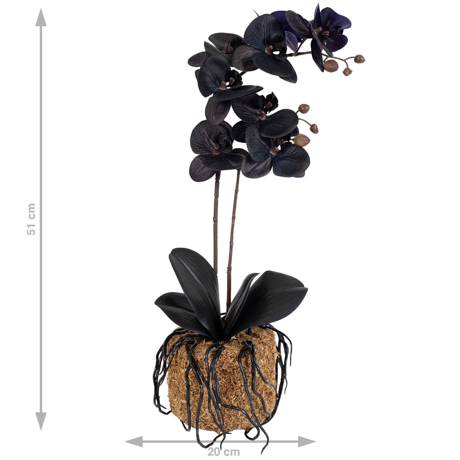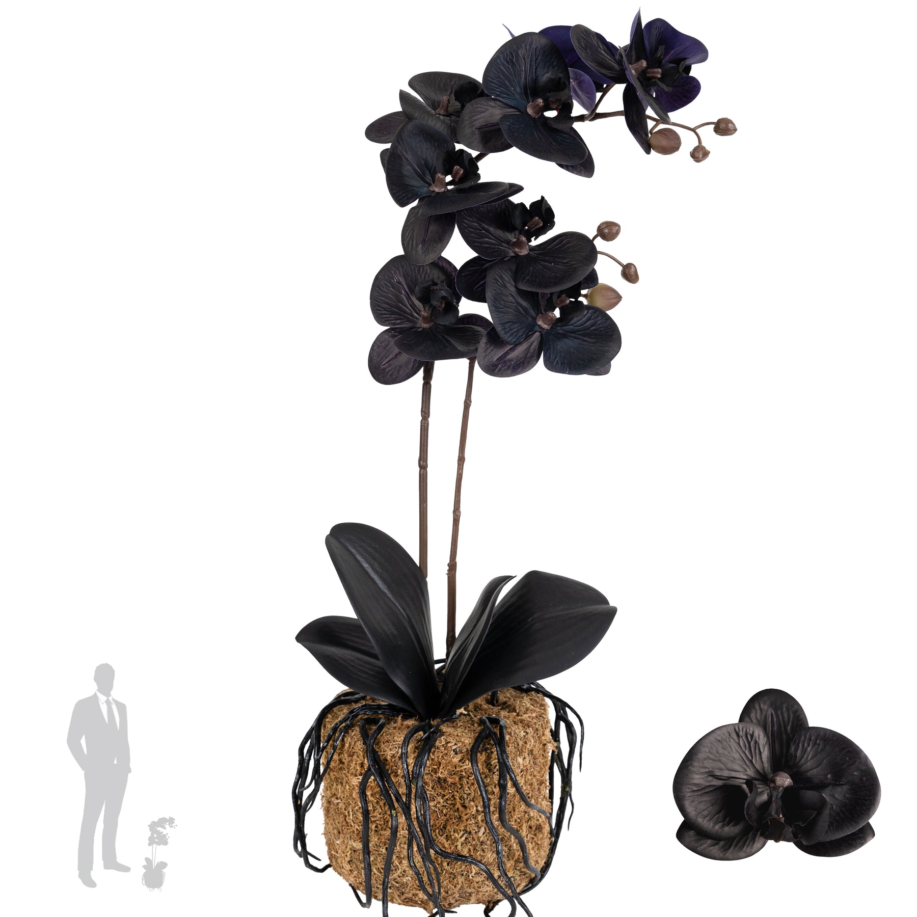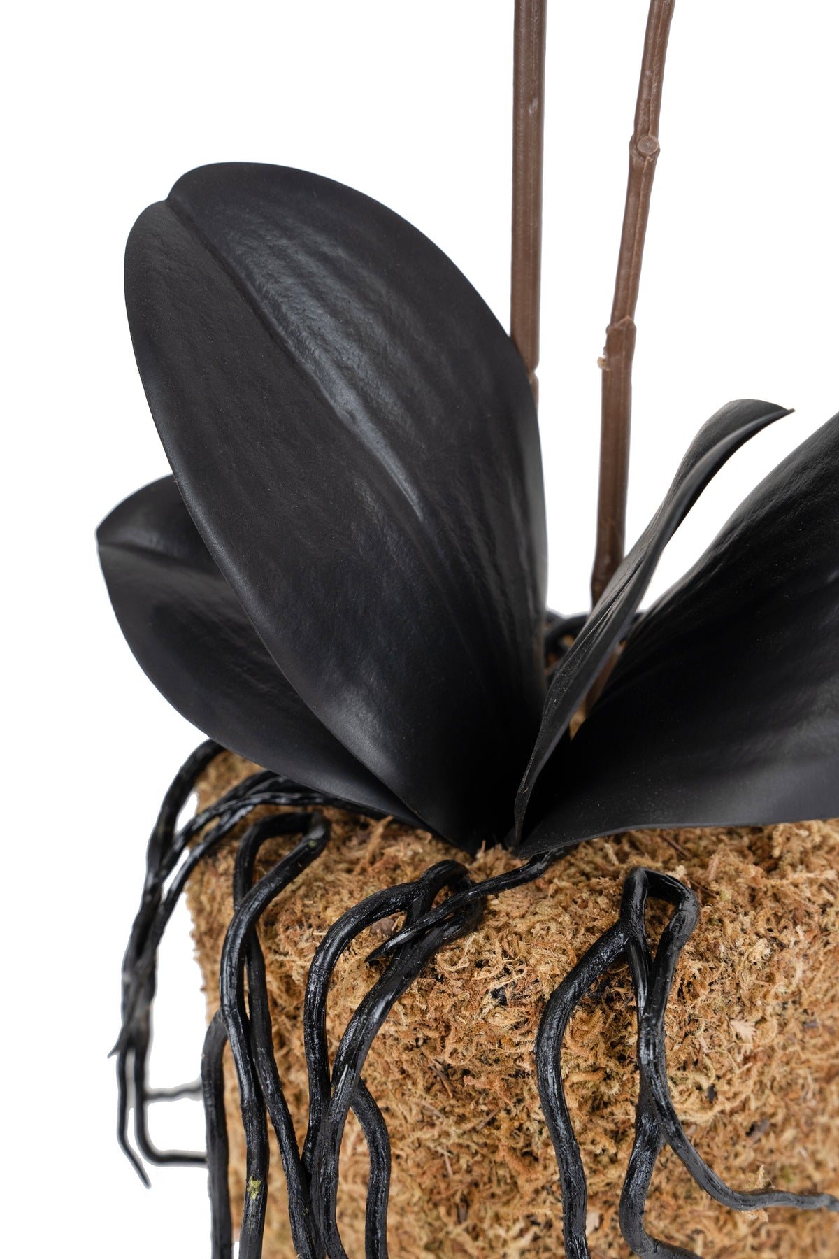 baza orhideei este realizata din polistiren negru acoperit cu muschi natural,frunzele artificiale sunt fixate pe sarma metalica flexibila acoperita cu multistraturi de PP, realizate din 33 nanostraturi de PP, cu aspect natural,la atingere florile sunt ca si florile naturale de orhidee, avand o senzatie identica cu orhideele naturale,radacinile aeriene sunt realizate din PEVA,suportii de sustinere a tulpinilor sunt bete de bambus naturale