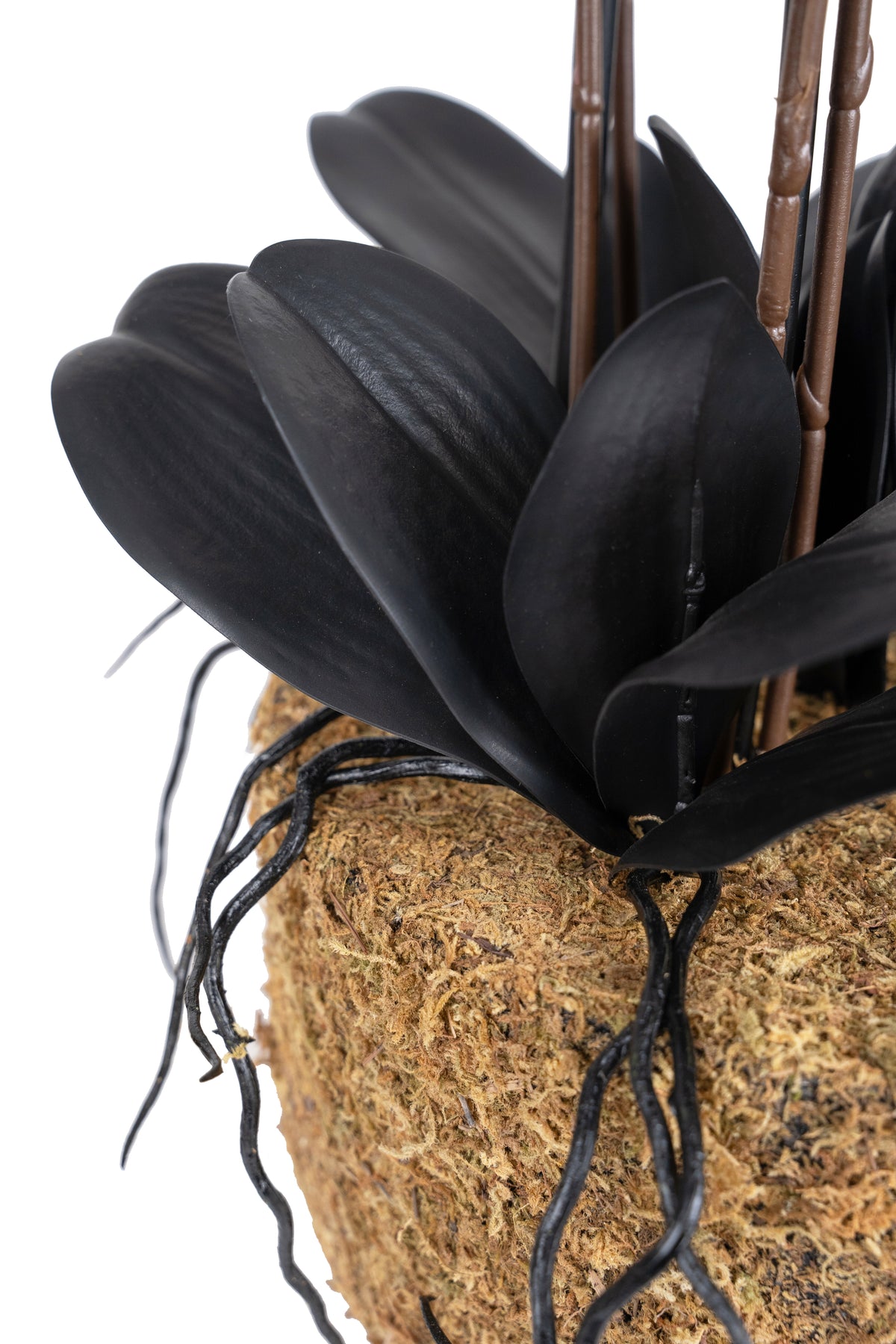 baza orhideei este realizata din polistiren negru acoperit cu muschi natural,frunzele artificiale sunt fixate pe sarma metalica flexibila acoperita cu multistraturi de PP, realizate din 33 nanostraturi de PP, cu aspect natural,la atingere florile sunt ca si florile naturale de orhidee, avand o senzatie identica cu orhideele naturale,radacinile aeriene sunt realizate din PEVA,suportii de sustinere a tulpinilor sunt bete de bambus naturale