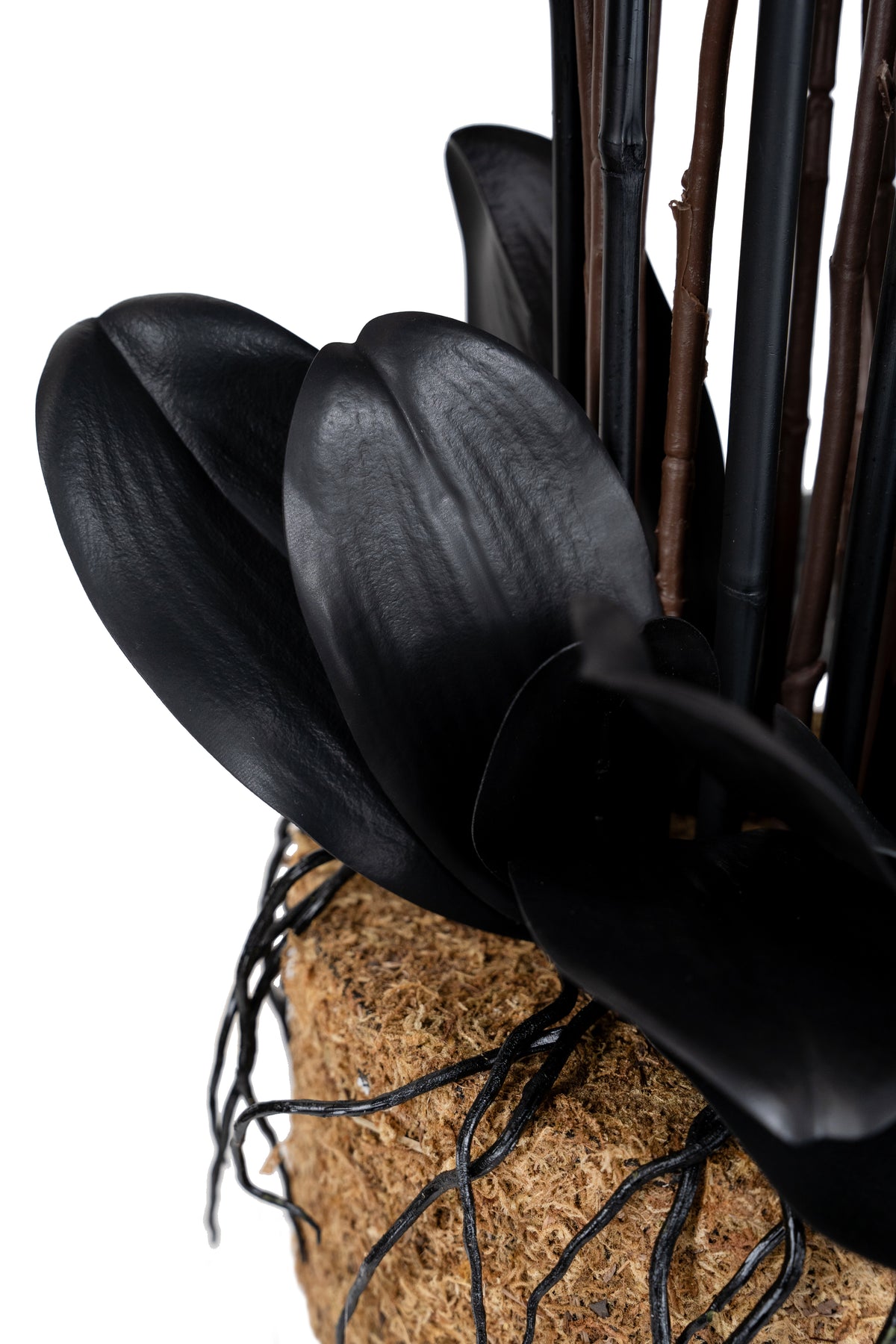 baza orhideei este realizata din polistiren negru acoperit cu muschi natural,frunzele artificiale sunt fixate pe sarma metalica flexibila acoperita cu multistraturi de PP, realizate din 33 nanostraturi de PP, cu aspect natural,la atingere florile sunt ca si florile naturale de orhidee, avand o senzatie identica cu orhideele naturale,radacinile aeriene sunt realizate din PEVA,suportii de sustinere a tulpinilor sunt bete de bambus naturale
