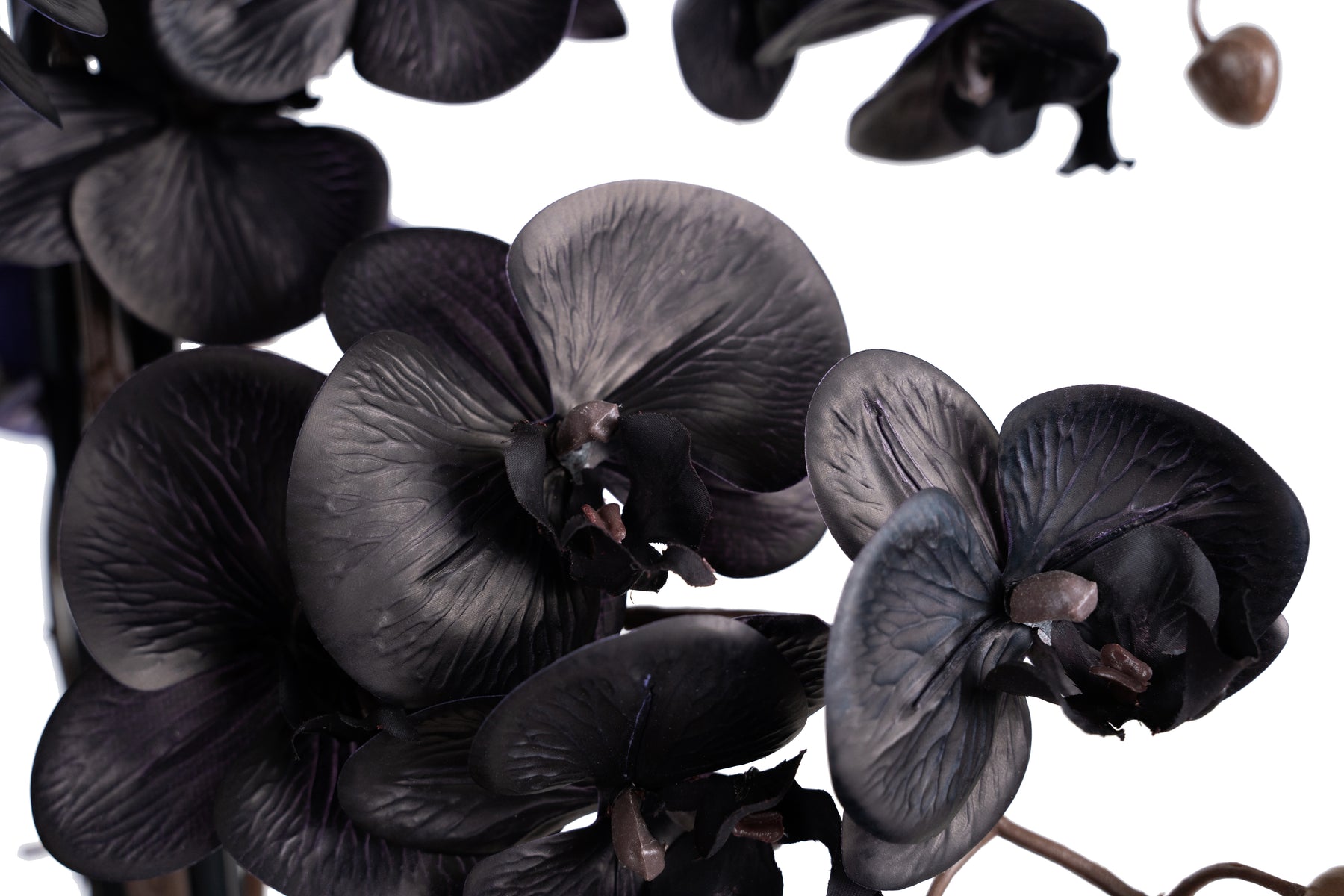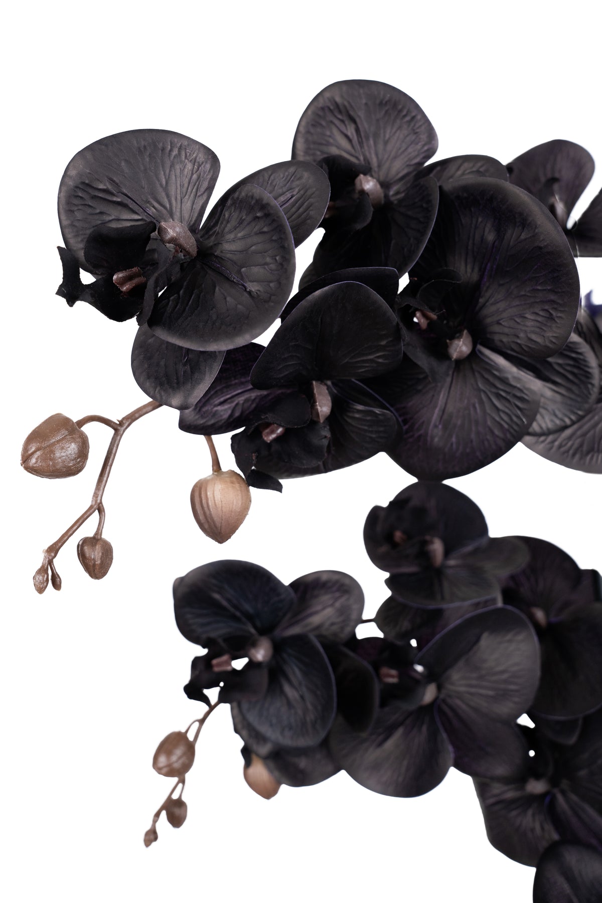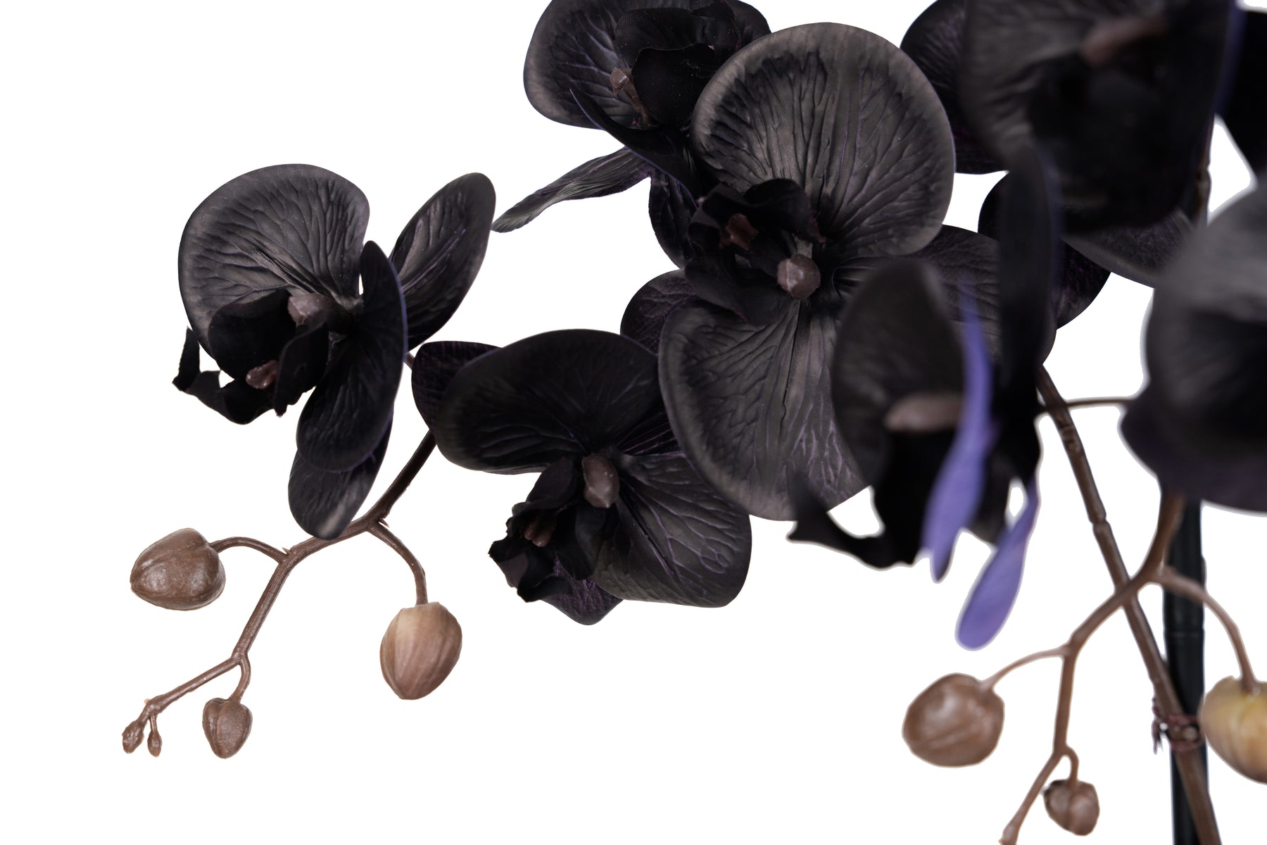 baza orhideei este realizata din polistiren negru acoperit cu muschi natural,frunzele artificiale sunt fixate pe sarma metalica flexibila acoperita cu multistraturi de PP, realizate din 33 nanostraturi de PP, cu aspect natural,la atingere florile sunt ca si florile naturale de orhidee, avand o senzatie identica cu orhideele naturale,radacinile aeriene sunt realizate din PEVA,suportii de sustinere a tulpinilor sunt bete de bambus naturale