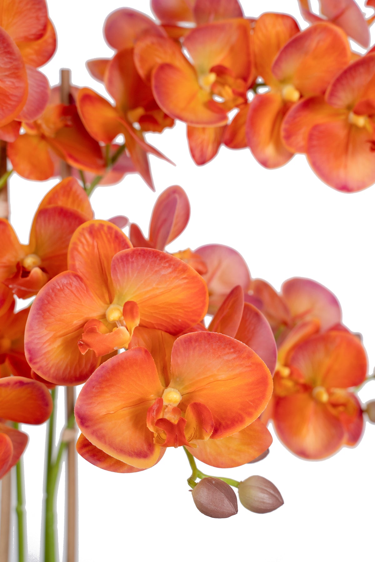 baza orhideei este realizata din polistiren negru acoperit cu muschi natural,frunzele artificiale sunt fixate pe sarma metalica flexibila acoperita cu multistraturi de PP, realizate din 33 nanostraturi de PP, cu aspect natural,la atingere florile sunt ca si florile naturale de orhidee, avand o senzatie identica cu orhideele naturale,radacinile aeriene sunt realizate din PEVA,suportii de sustinere a tulpinilor sunt bete de bambus naturale