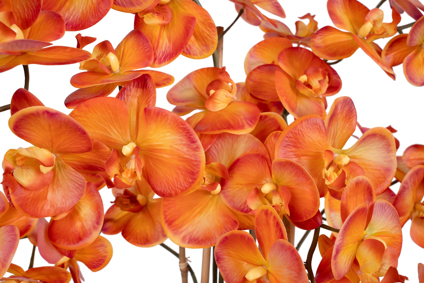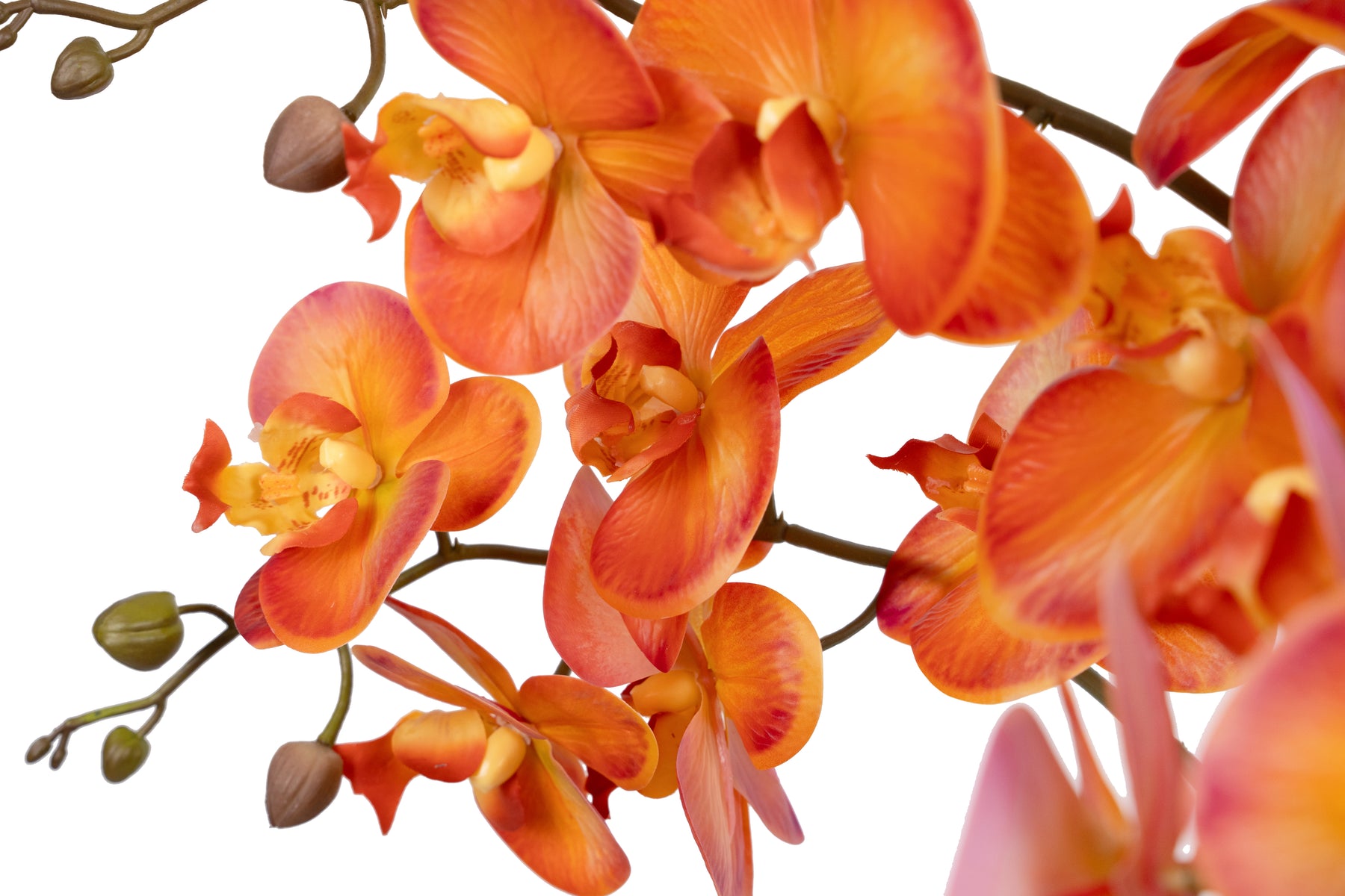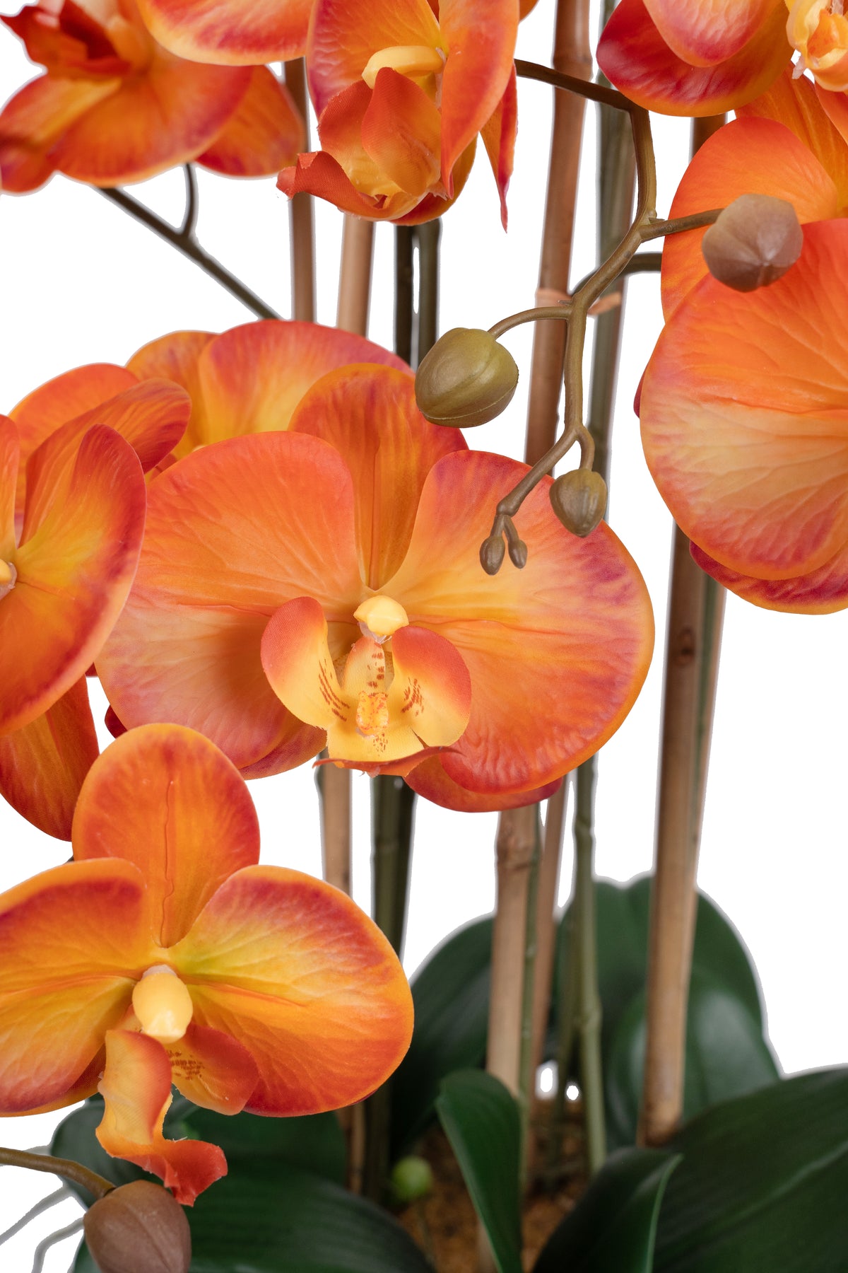 baza orhideei este realizata din polistiren negru acoperit cu muschi natural,frunzele artificiale sunt fixate pe sarma metalica flexibila acoperita cu multistraturi de PP, realizate din 33 nanostraturi de PP, cu aspect natural,la atingere florile sunt ca si florile naturale de orhidee, avand o senzatie identica cu orhideele naturale,radacinile aeriene sunt realizate din PEVA,suportii de sustinere a tulpinilor sunt bete de bambus naturale
