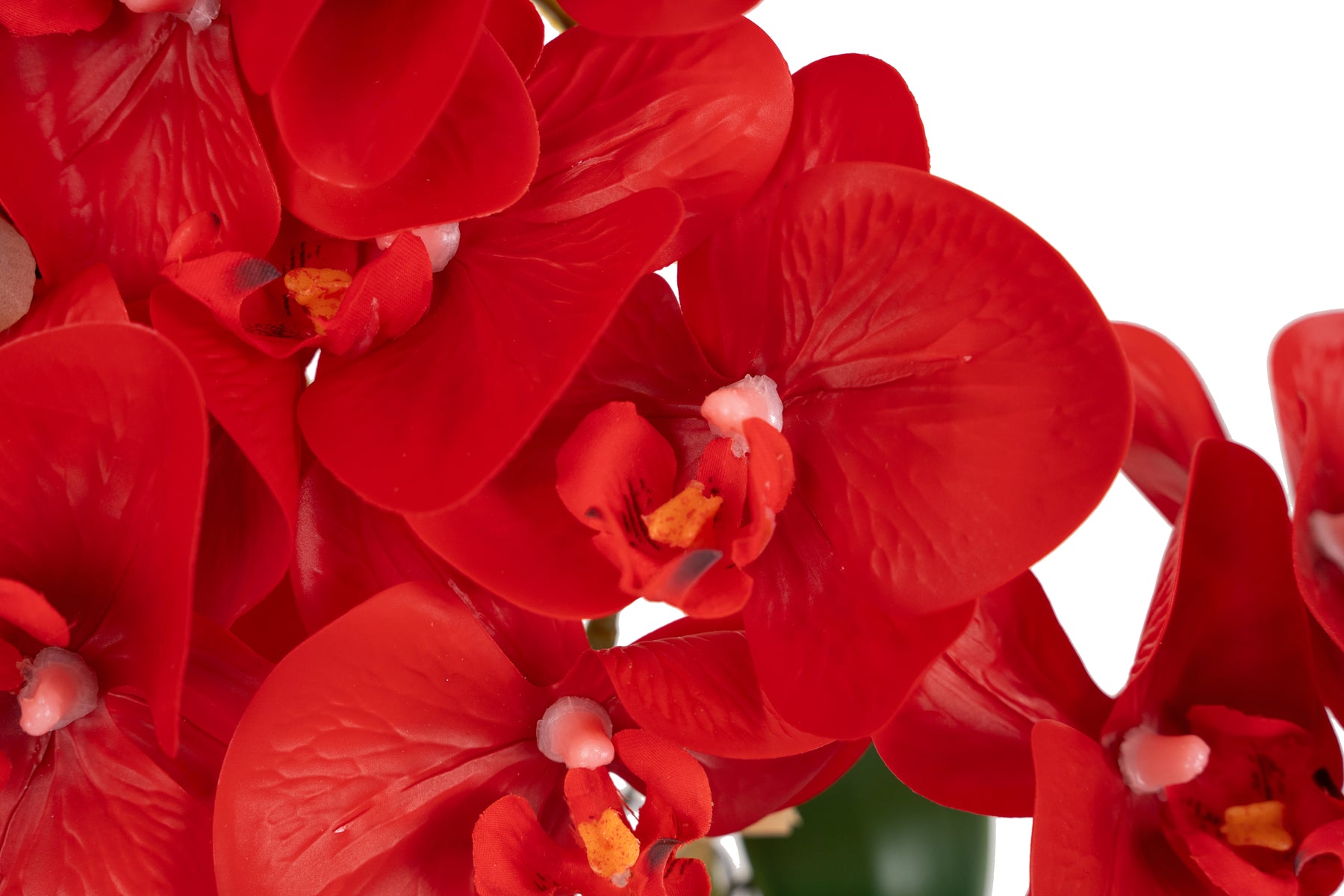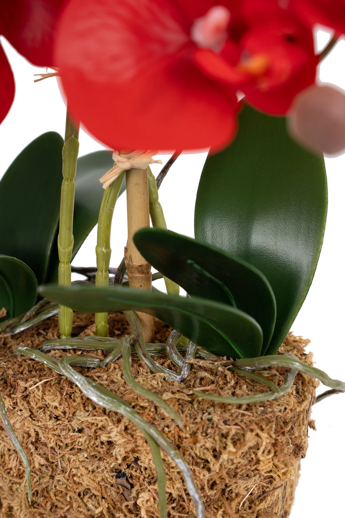 baza orhideei este realizata din polistiren negru acoperit cu muschi natural,frunzele artificiale sunt fixate pe sarma metalica flexibila acoperita cu multistraturi de PP, realizate din 33 nanostraturi de PP, cu aspect natural,la atingere florile sunt ca si florile naturale de orhidee, avand o senzatie identica cu orhideele naturale,radacinile aeriene sunt realizate din PEVA,suportii de sustinere a tulpinilor sunt bete de bambus naturale