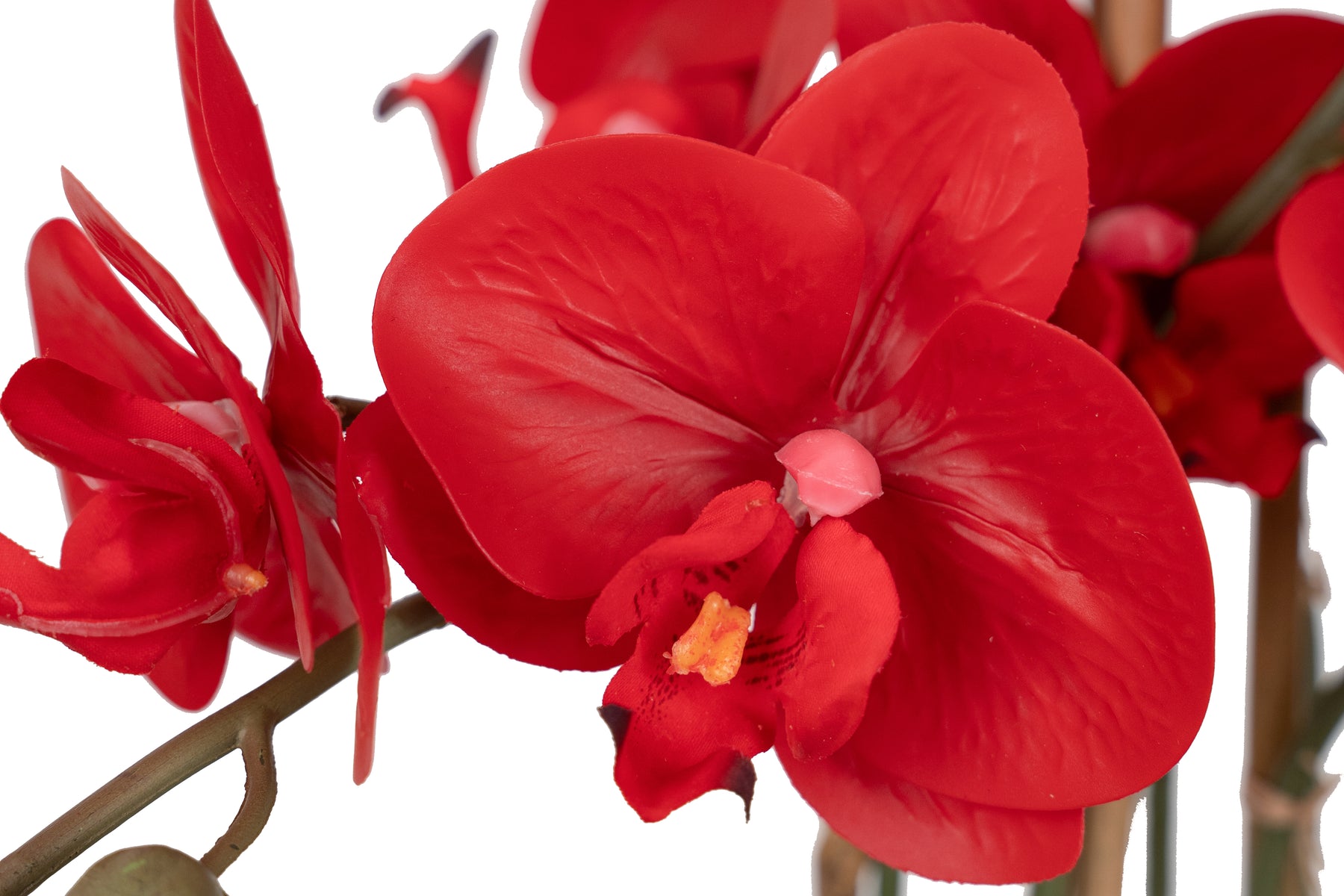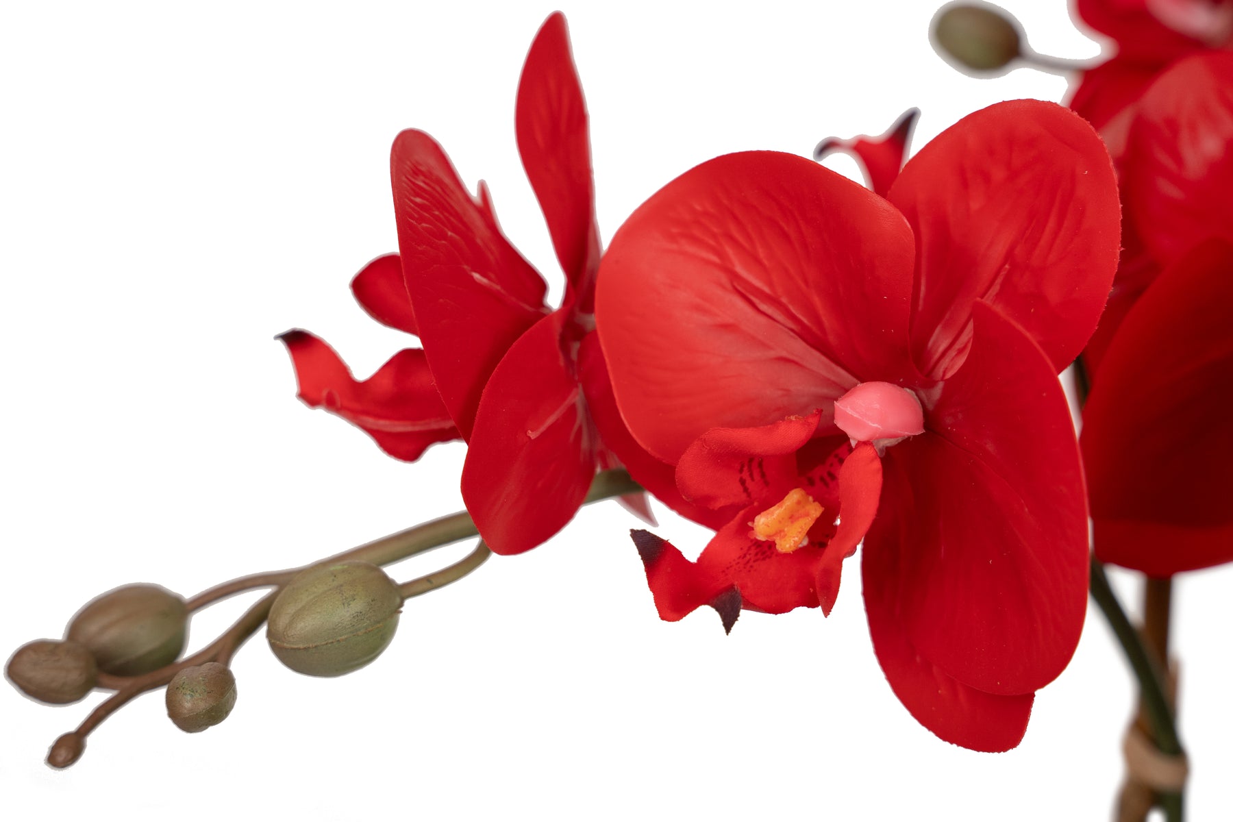 baza orhideei este realizata din polistiren negru acoperit cu muschi natural,frunzele artificiale sunt fixate pe sarma metalica flexibila acoperita cu multistraturi de PP, realizate din 33 nanostraturi de PP, cu aspect natural,la atingere florile sunt ca si florile naturale de orhidee, avand o senzatie identica cu orhideele naturale,radacinile aeriene sunt realizate din PEVA,suportii de sustinere a tulpinilor sunt bete de bambus naturale