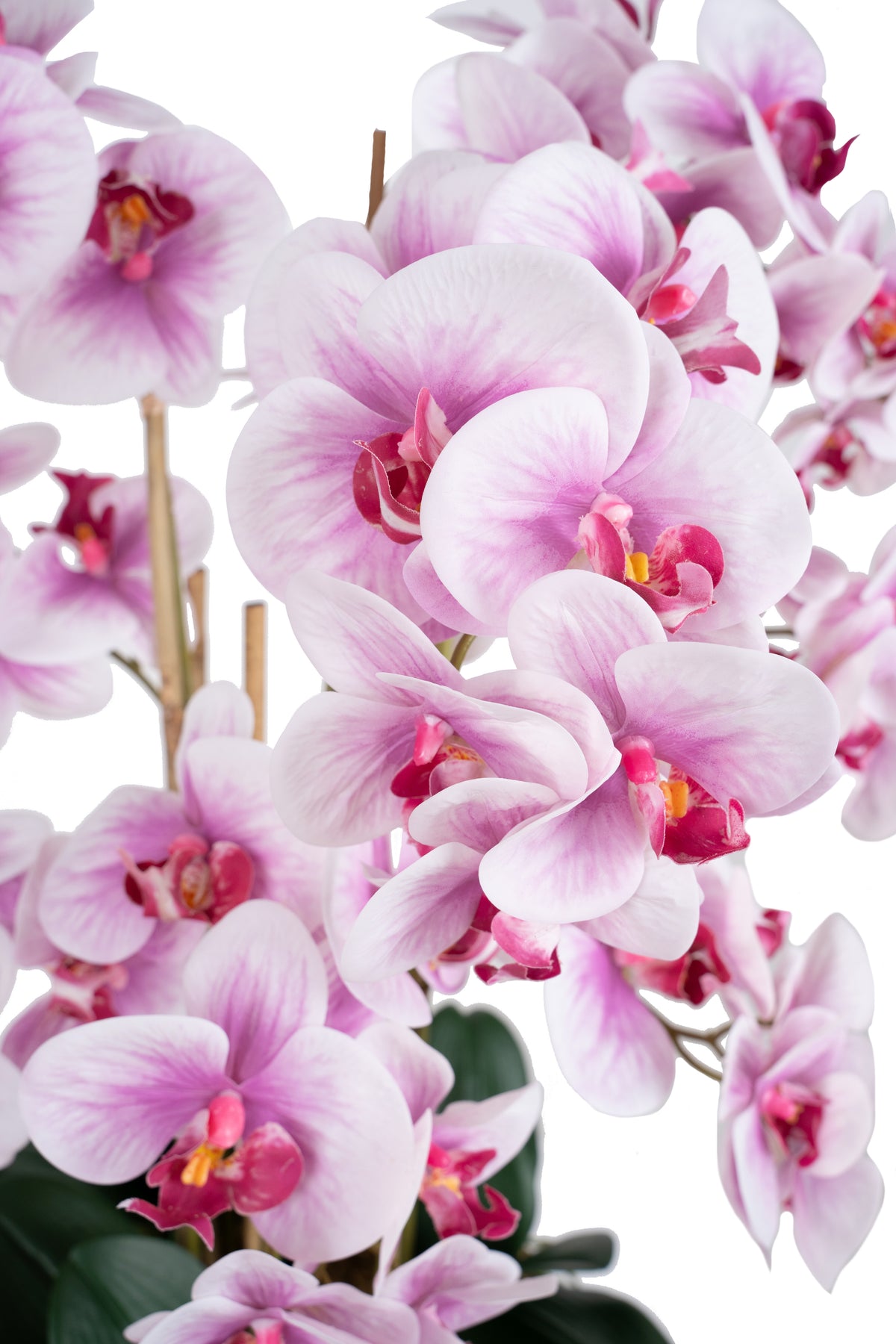 baza orhideei este realizata din polistiren negru acoperit cu muschi natural,frunzele artificiale sunt fixate pe sarma metalica flexibila acoperita cu multistraturi de PP, realizate din 33 nanostraturi de PP, cu aspect natural,la atingere florile sunt ca si florile naturale de orhidee, avand o senzatie identica cu orhideele naturale,radacinile aeriene sunt realizate din PEVA,suportii de sustinere a tulpinilor sunt bete de bambus naturale