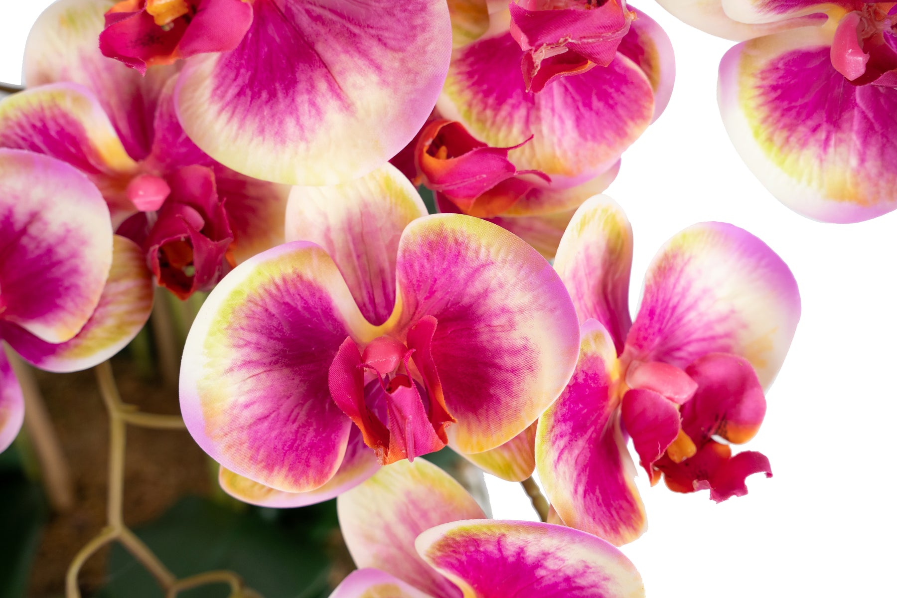 baza orhideei este realizata din polistiren negru acoperit cu muschi natural,frunzele artificiale sunt fixate pe sarma metalica flexibila acoperita cu multistraturi de PP, realizate din 33 nanostraturi de PP, cu aspect natural,la atingere florile sunt ca si florile naturale de orhidee, avand o senzatie identica cu orhideele naturale,radacinile aeriene sunt realizate din PEVA,suportii de sustinere a tulpinilor sunt bete de bambus naturale