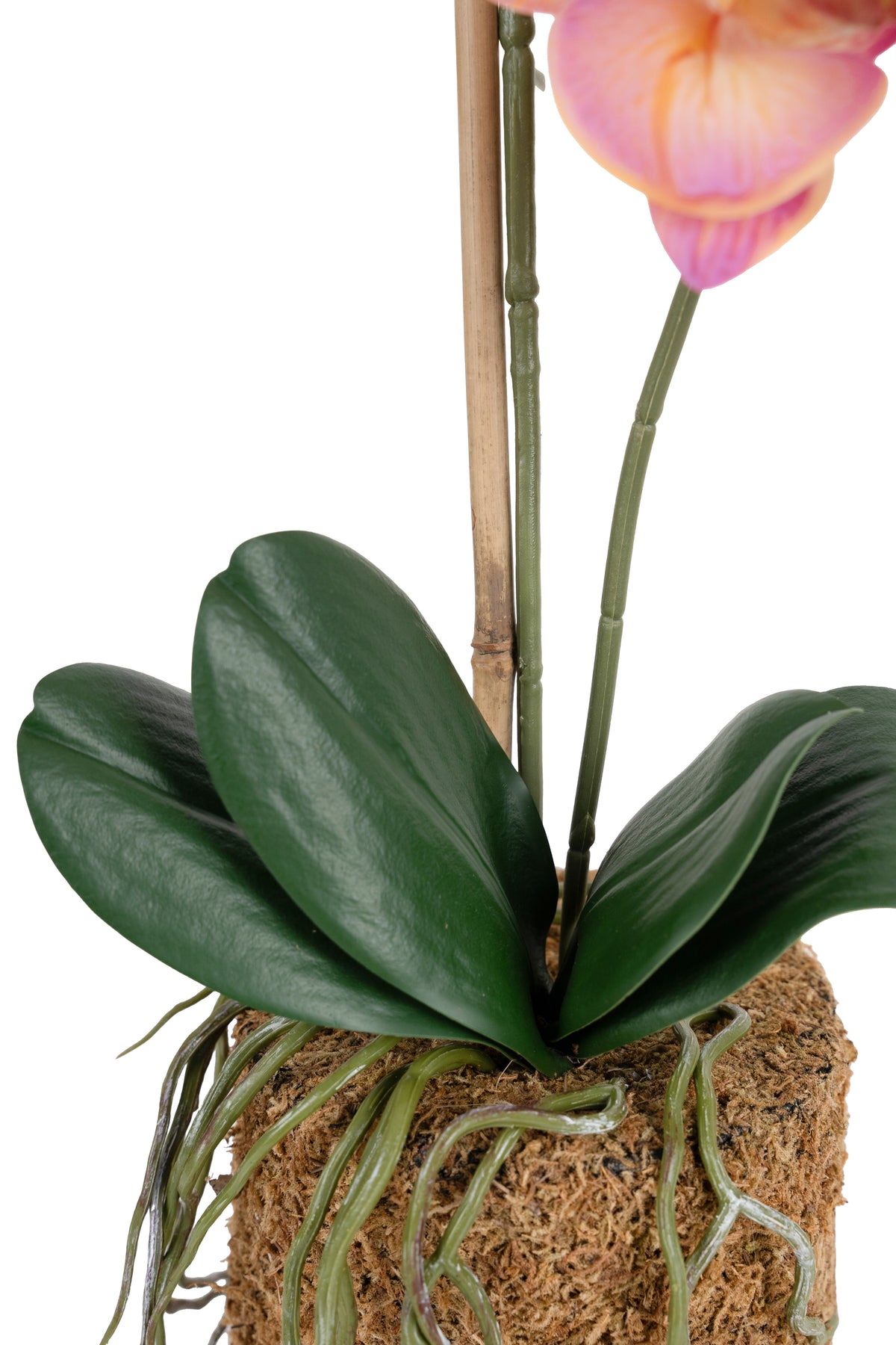 baza orhideei este realizata din polistiren negru acoperit cu muschi natural,frunzele artificiale sunt fixate pe sarma metalica flexibila acoperita cu multistraturi de PP, realizate din 33 nanostraturi de PP, cu aspect natural,la atingere florile sunt ca si florile naturale de orhidee, avand o senzatie identica cu orhideele naturale,radacinile aeriene sunt realizate din PEVA,suportii de sustinere a tulpinilor sunt bete de bambus naturale