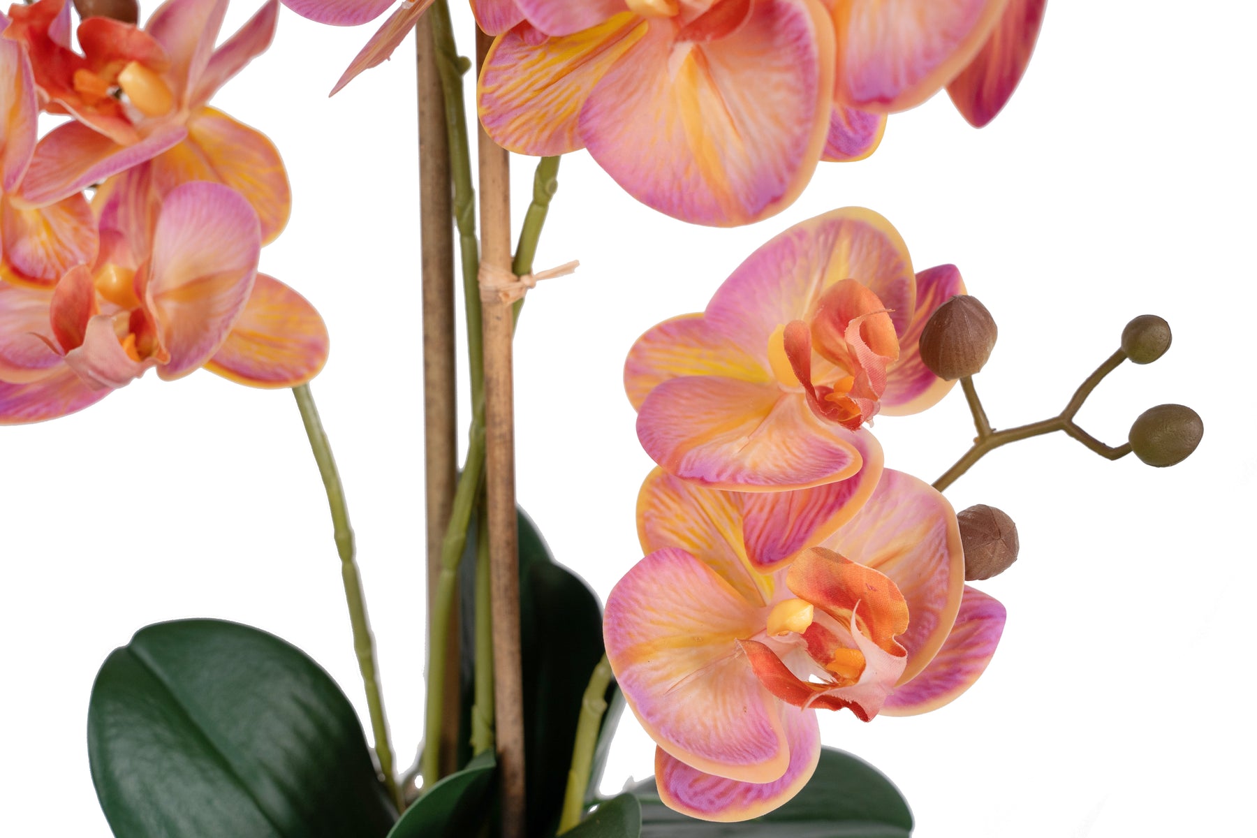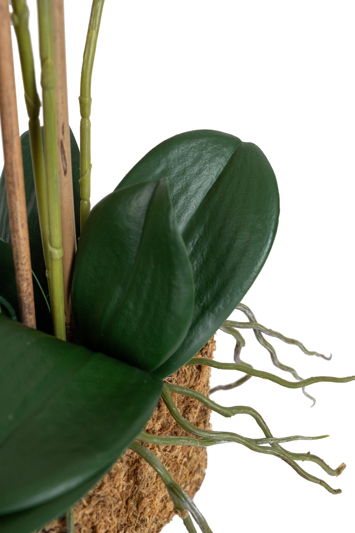 baza orhideei este realizata din polistiren negru acoperit cu muschi natural,frunzele artificiale sunt fixate pe sarma metalica flexibila acoperita cu multistraturi de PP, realizate din 33 nanostraturi de PP, cu aspect natural,la atingere florile sunt ca si florile naturale de orhidee, avand o senzatie identica cu orhideele naturale,radacinile aeriene sunt realizate din PEVA,suportii de sustinere a tulpinilor sunt bete de bambus naturale