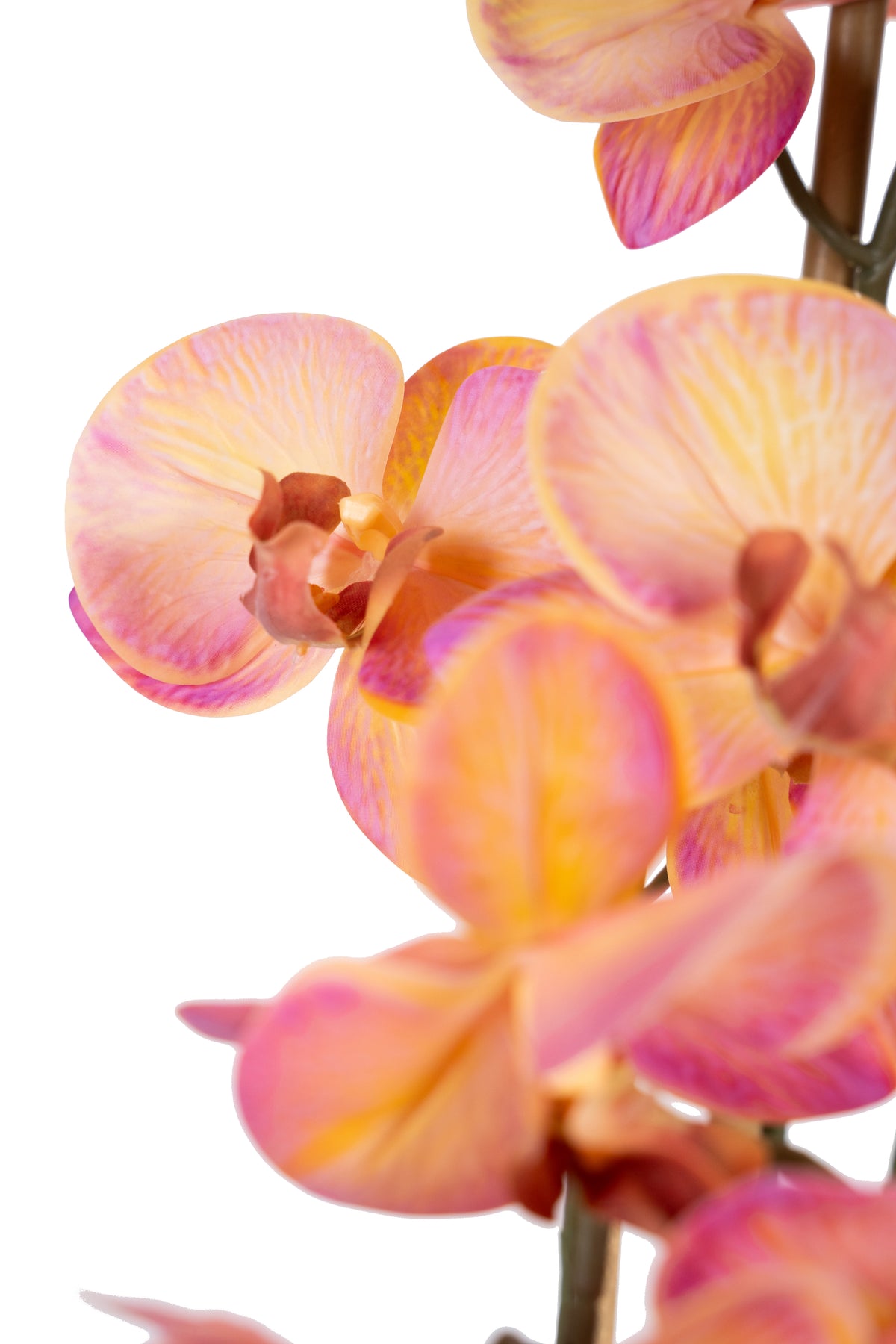 baza orhideei este realizata din polistiren negru acoperit cu muschi natural,frunzele artificiale sunt fixate pe sarma metalica flexibila acoperita cu multistraturi de PP, realizate din 33 nanostraturi de PP, cu aspect natural,la atingere florile sunt ca si florile naturale de orhidee, avand o senzatie identica cu orhideele naturale,radacinile aeriene sunt realizate din PEVA,suportii de sustinere a tulpinilor sunt bete de bambus naturale