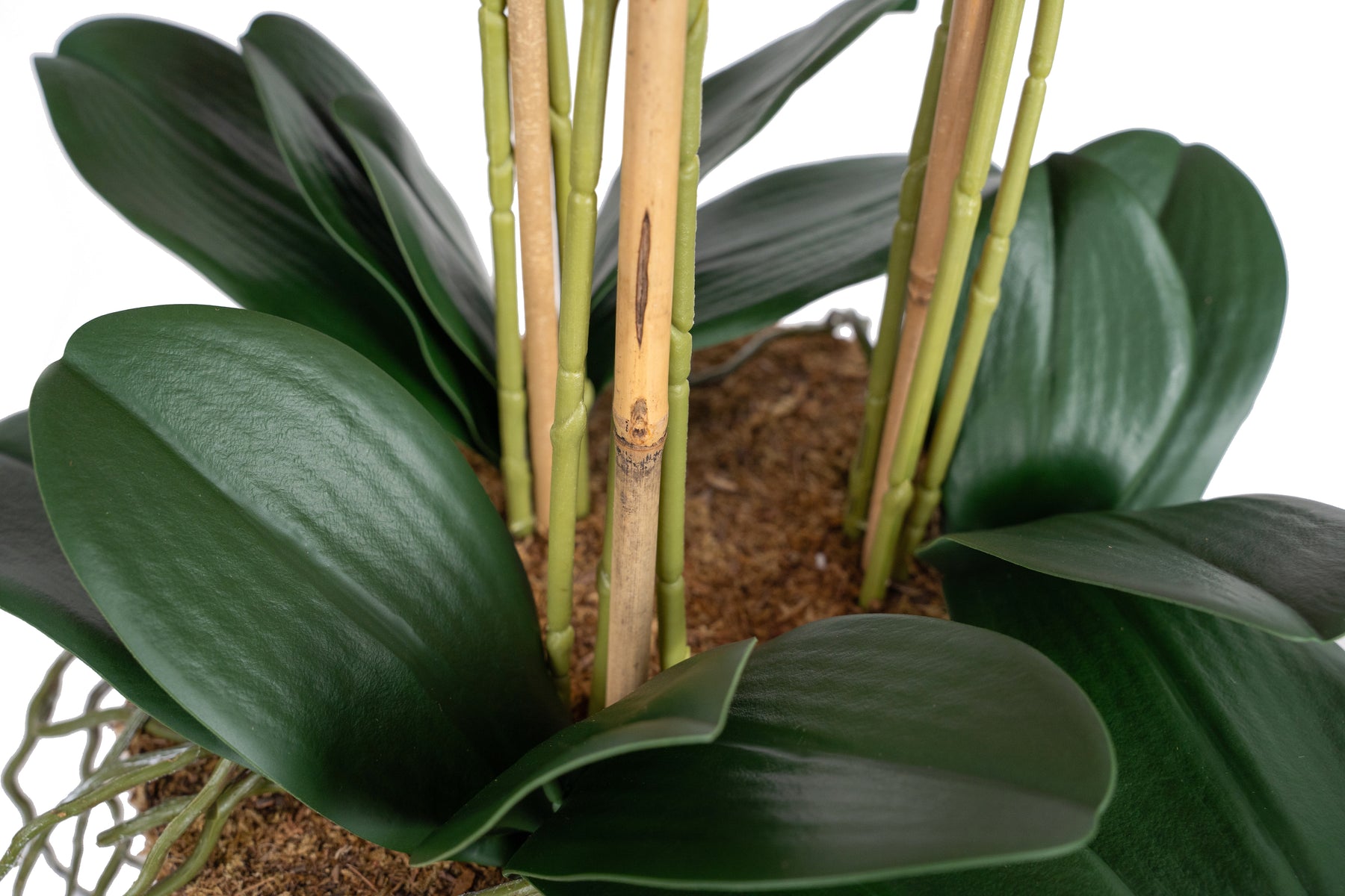 baza orhideei este realizata din polistiren negru acoperit cu muschi natural,frunzele artificiale sunt fixate pe sarma metalica flexibila acoperita cu multistraturi de PP, realizate din 33 nanostraturi de PP, cu aspect natural,la atingere florile sunt ca si florile naturale de orhidee, avand o senzatie identica cu orhideele naturale,radacinile aeriene sunt realizate din PEVA,suportii de sustinere a tulpinilor sunt bete de bambus naturale