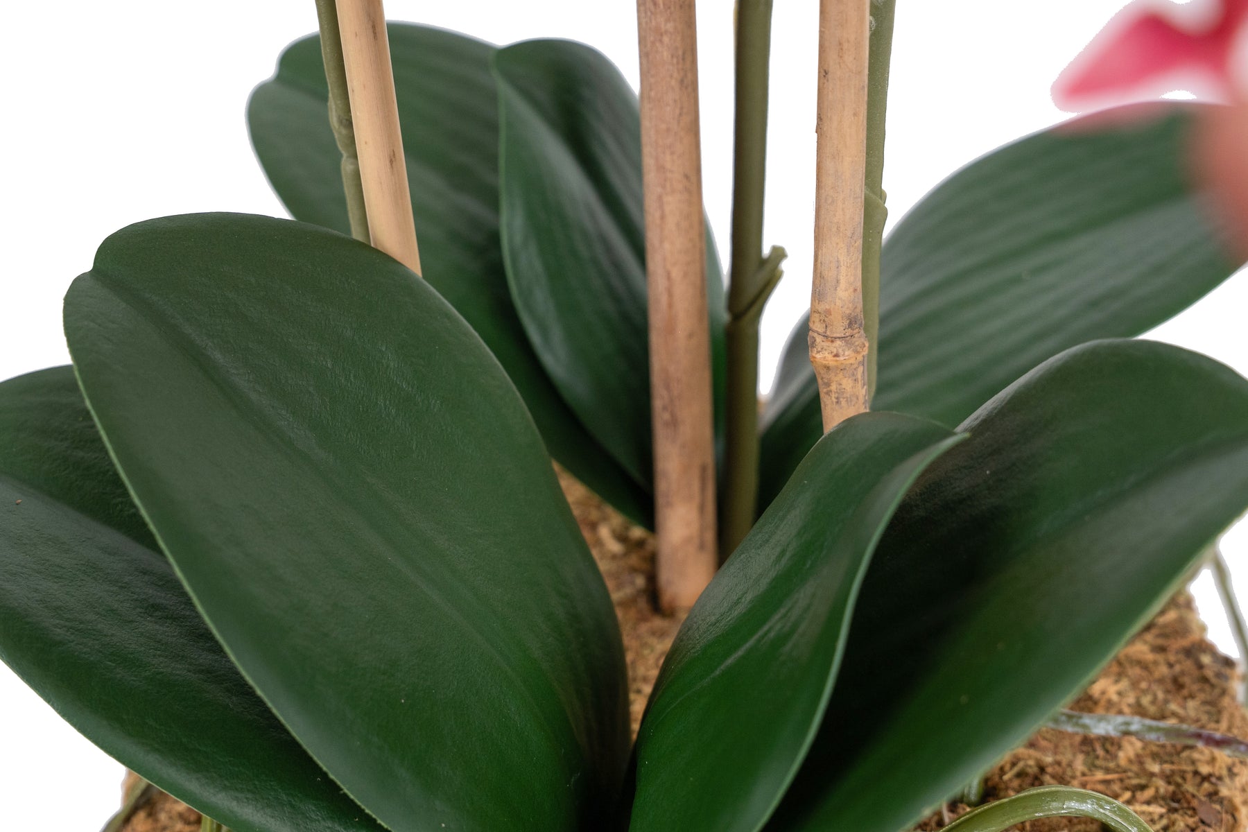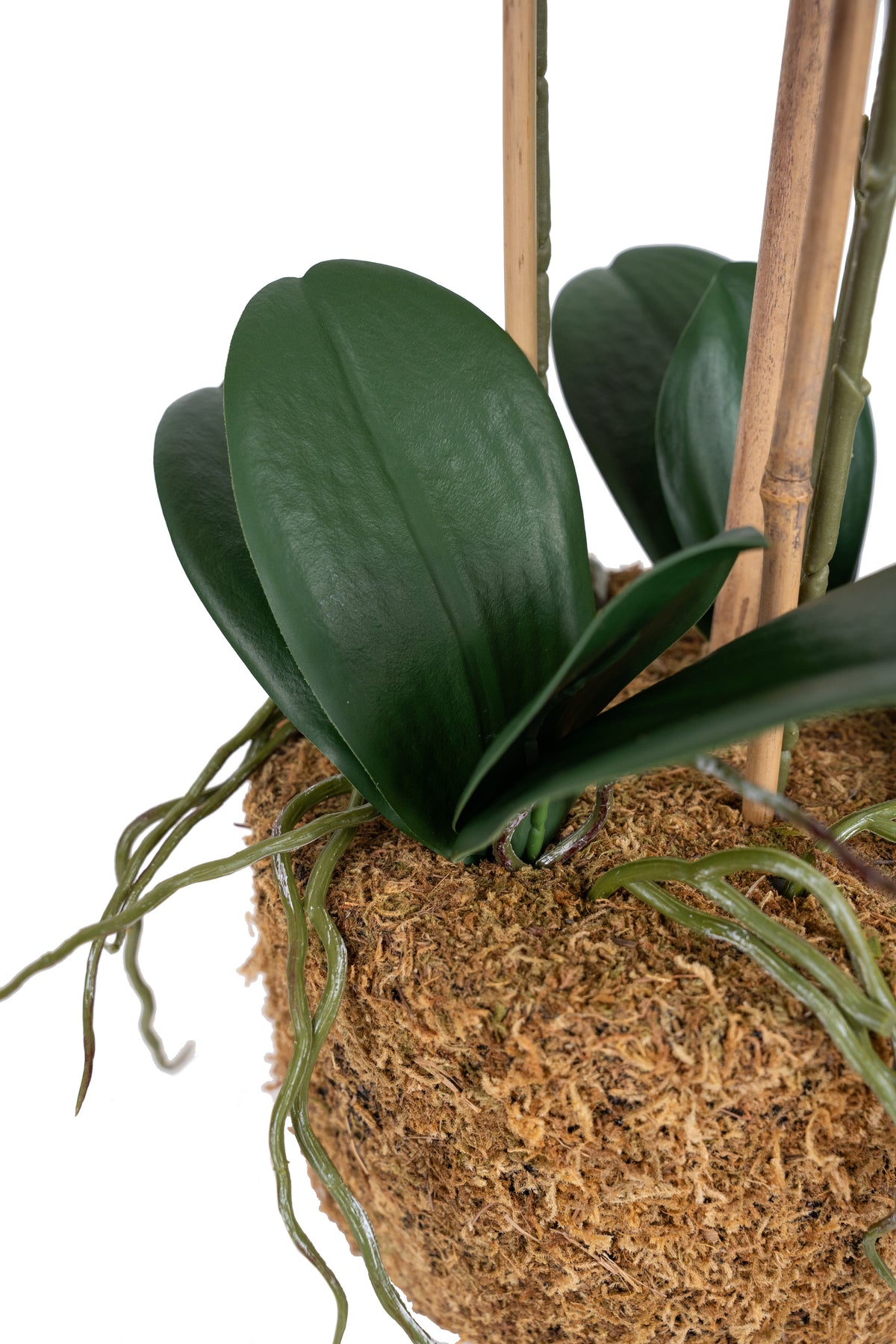 baza orhideei este realizata din polistiren negru acoperit cu muschi natural,frunzele artificiale sunt fixate pe sarma metalica flexibila acoperita cu multistraturi de PP, realizate din 33 nanostraturi de PP, cu aspect natural,la atingere florile sunt ca si florile naturale de orhidee, avand o senzatie identica cu orhideele naturale,radacinile aeriene sunt realizate din PEVA,suportii de sustinere a tulpinilor sunt bete de bambus naturale