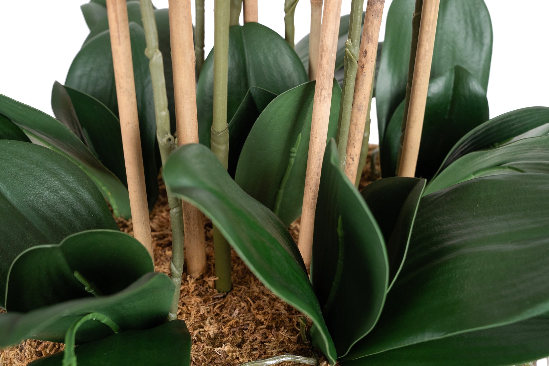 baza orhideei este realizata din polistiren negru acoperit cu muschi natural,frunzele artificiale sunt fixate pe sarma metalica flexibila acoperita cu multistraturi de PP, realizate din 33 nanostraturi de PP, cu aspect natural,la atingere florile sunt ca si florile naturale de orhidee, avand o senzatie identica cu orhideele naturale,radacinile aeriene sunt realizate din PEVA,suportii de sustinere a tulpinilor sunt bete de bambus naturale