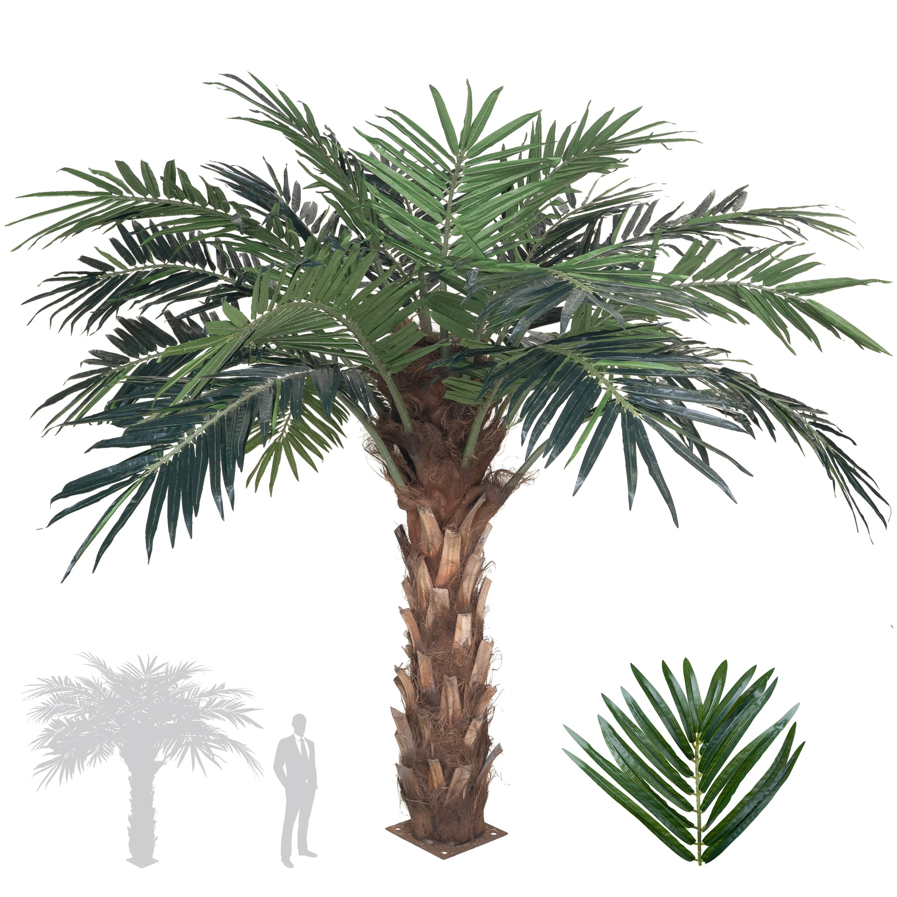 fibra de palmier naturala, fibra de sticla, frunzele artificiale sunt fixate pe sarma metalica flexibila acoperita cu multistraturi de PP, realizate din 33 nanostraturi de PP, cu aspect natural, plastic, trunchi realizat din scoarta naturala de palmier