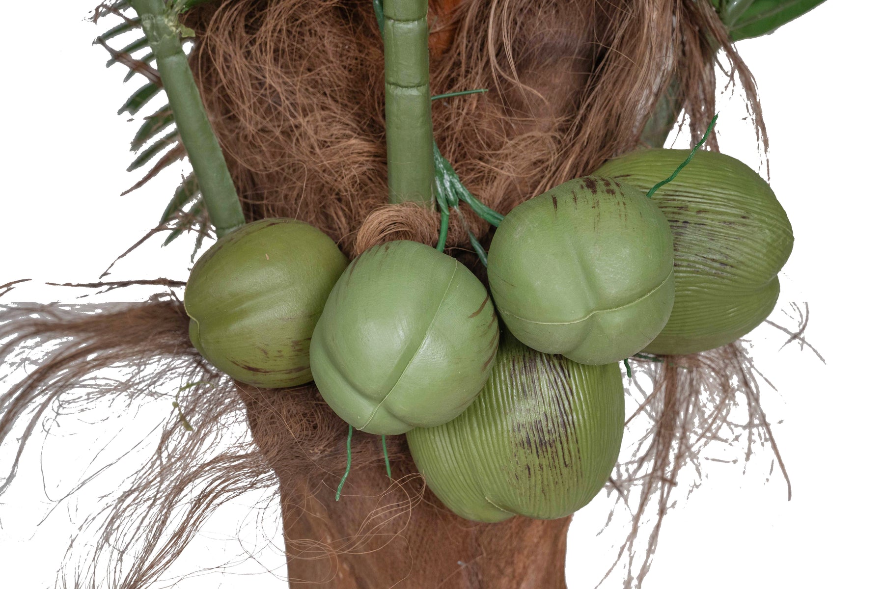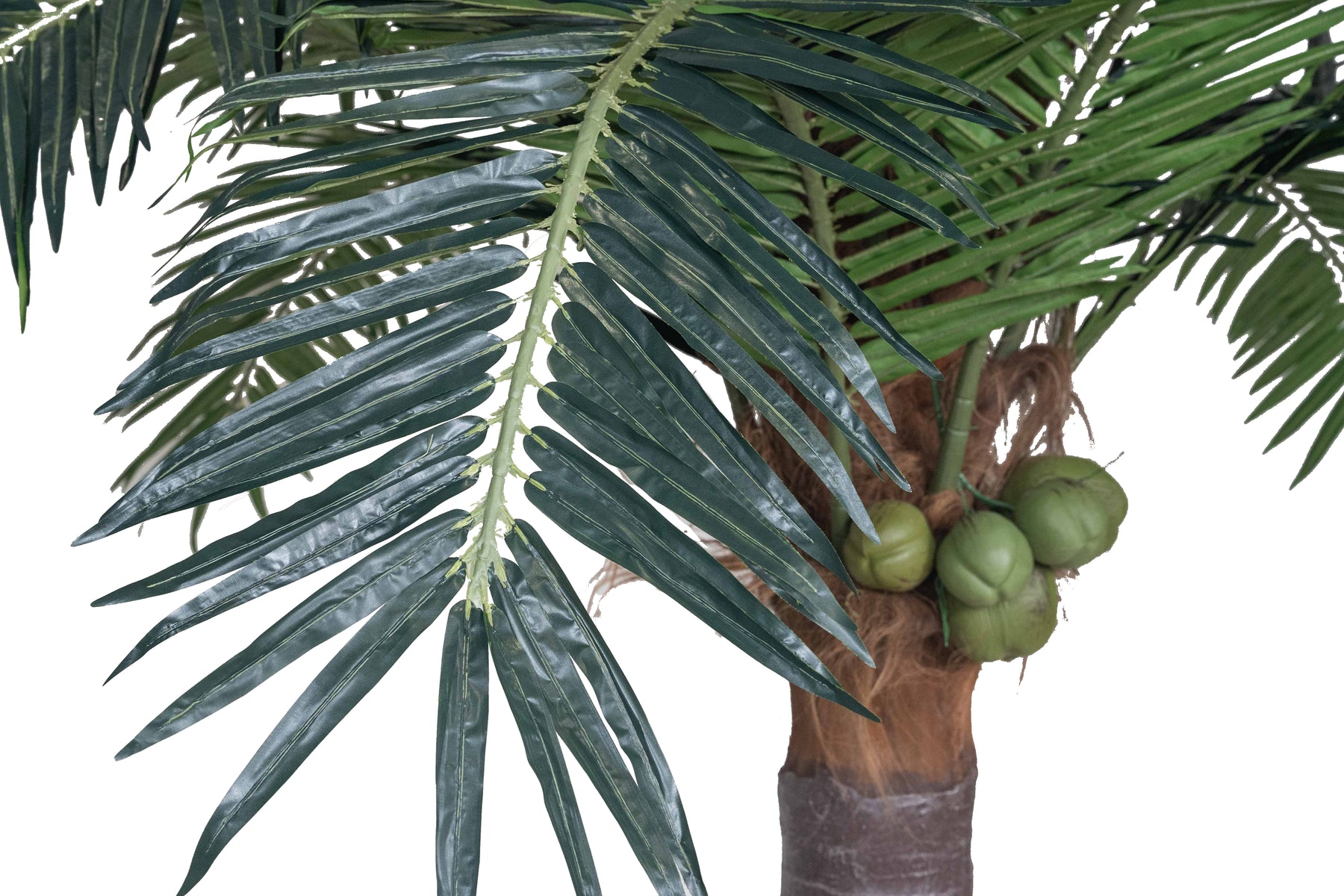 fibra de palmier naturala, fibra de sticla, frunzele artificiale sunt fixate pe sarma metalica flexibila acoperita cu multistraturi de PP, realizate din 33 nanostraturi de PP, cu aspect natural, plastic, trunchi din fibra de sticla multistrat cu aspect natural de scoarta de copac