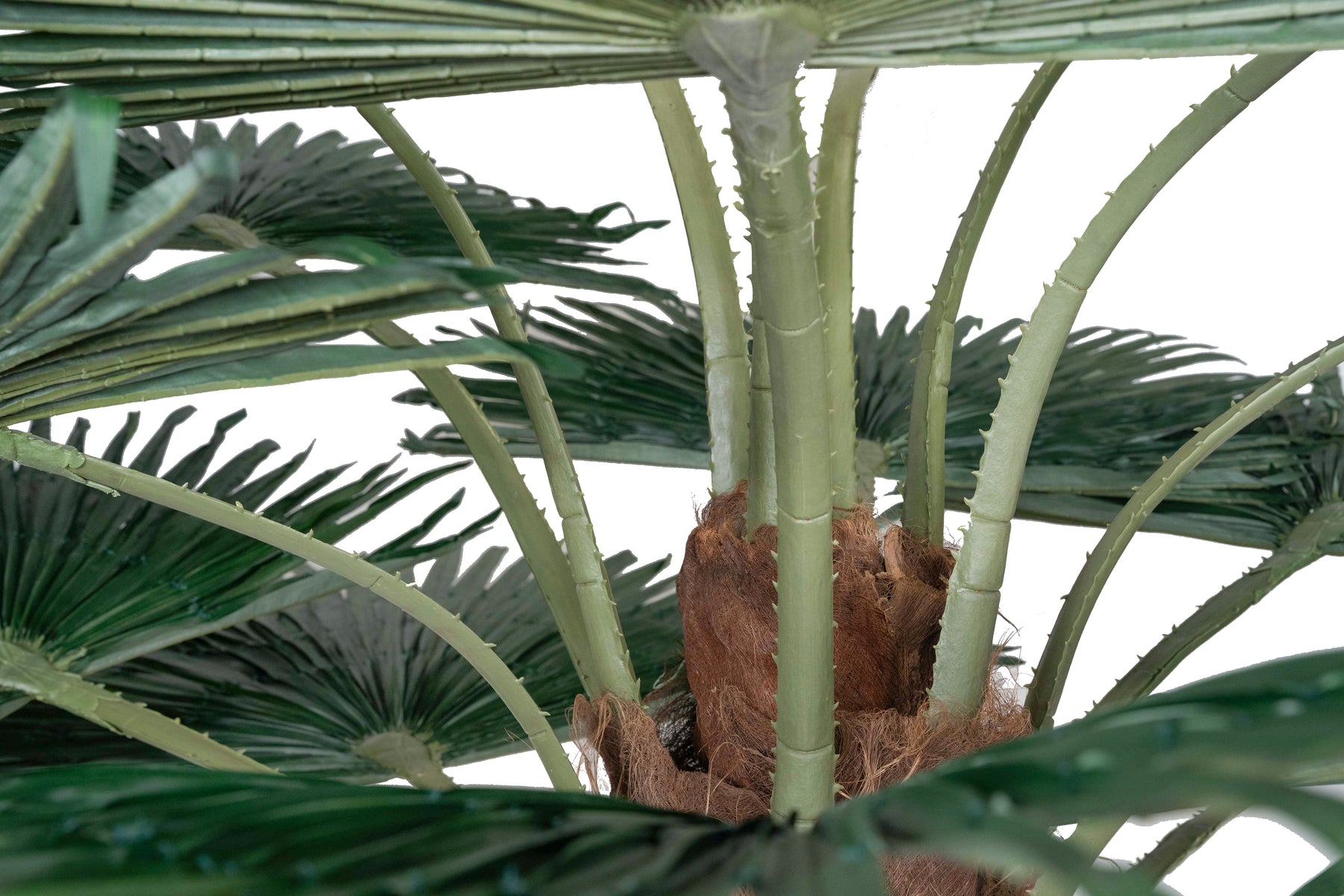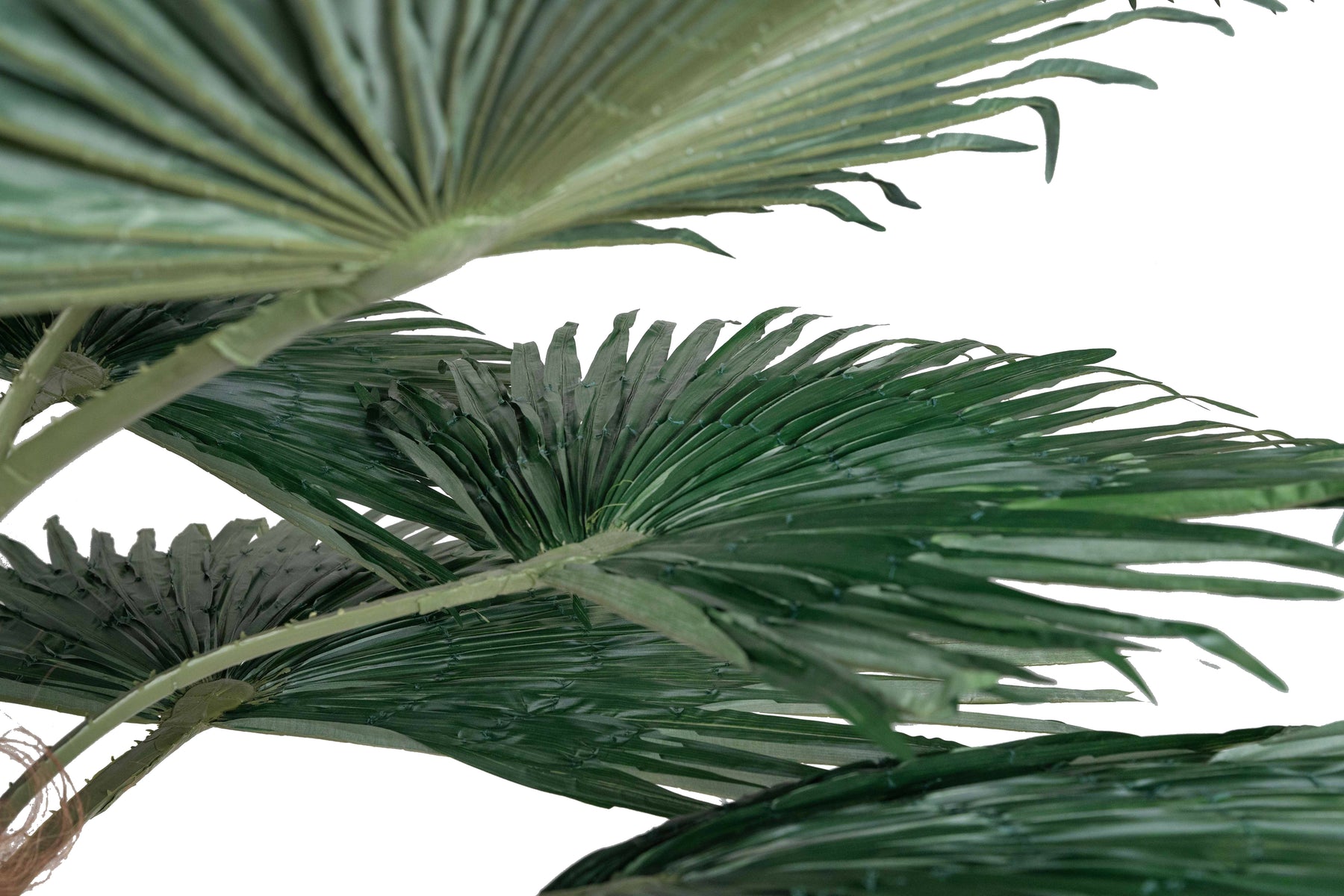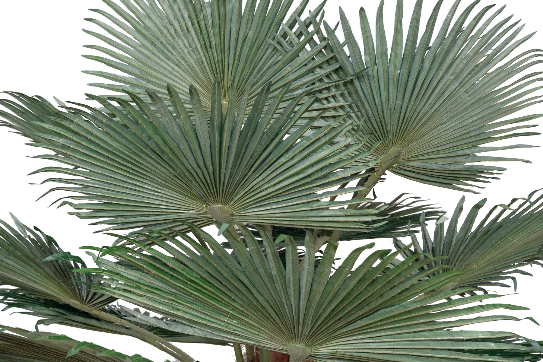 fibra de palmier naturala, fibra de sticla, frunzele artificiale sunt fixate pe sarma metalica flexibila acoperita cu multistraturi de PP, realizate din 33 nanostraturi de PP, cu aspect natural, plastic, trunchi realizat din scoarta artificiala de palmier tip washingtonia