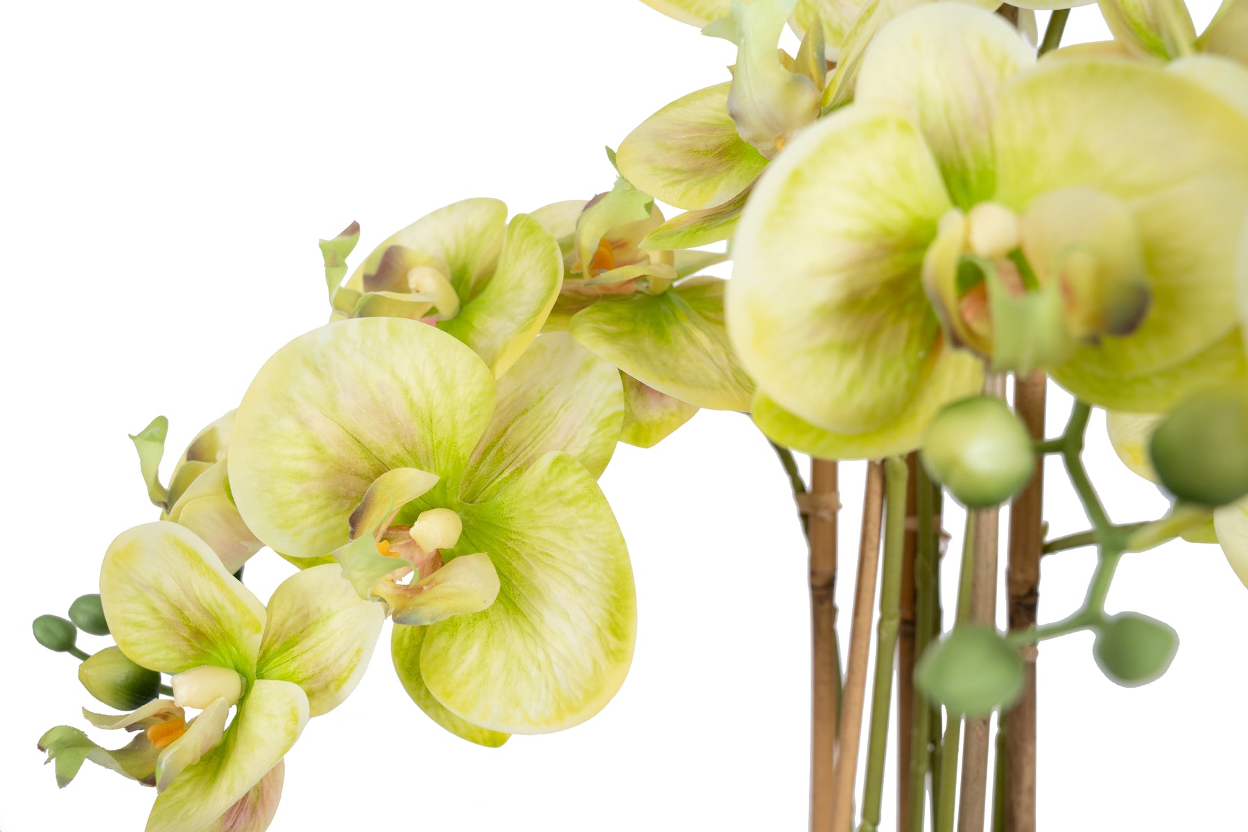 baza orhideei este realizata din polistiren negru acoperit cu muschi natural,frunzele artificiale sunt fixate pe sarma metalica flexibila acoperita cu multistraturi de PP, realizate din 33 nanostraturi de PP, cu aspect natural,la atingere florile sunt ca si florile naturale de orhidee, avand o senzatie identica cu orhideele naturale,radacinile aeriene sunt realizate din PEVA,suportii de sustinere a tulpinilor sunt bete de bambus naturale